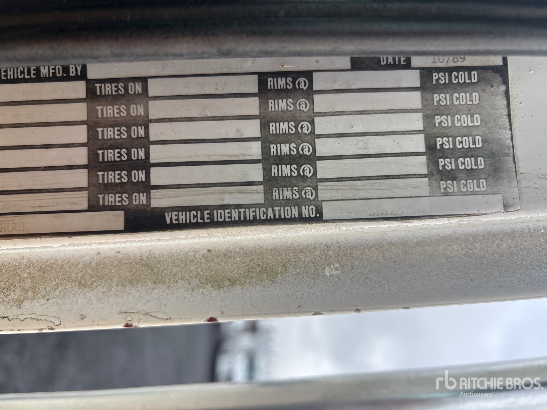 Situé sur la voie 17, emplacement 19, moteur diesel Cummins LTA10 6 cylindres de 285 ch, homologué EPA (États-Unis) de 1989, transmission manuelle Eaton Fuller, essieu avant de 8165 kg, essieu arrière de 1922 kg, PTAC de 3331 kg, roues avant en aluminium, pneus avant 425/65R22.5, pneus arrière 11R22.5, essieu suiveur, suspension à balancier Hendrickson, empattement de 665 cm, prise de force, malaxeur TMMB de 816 m³, 3 goulottes amovibles