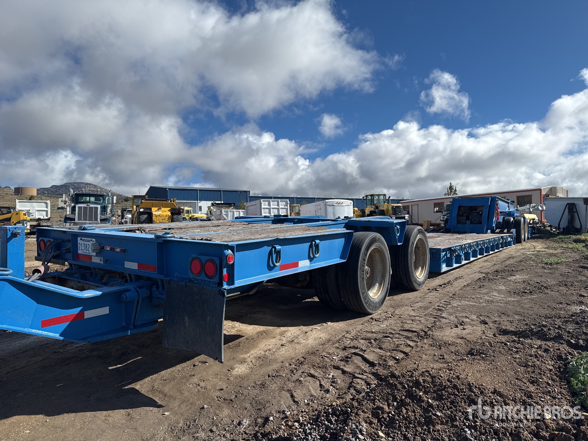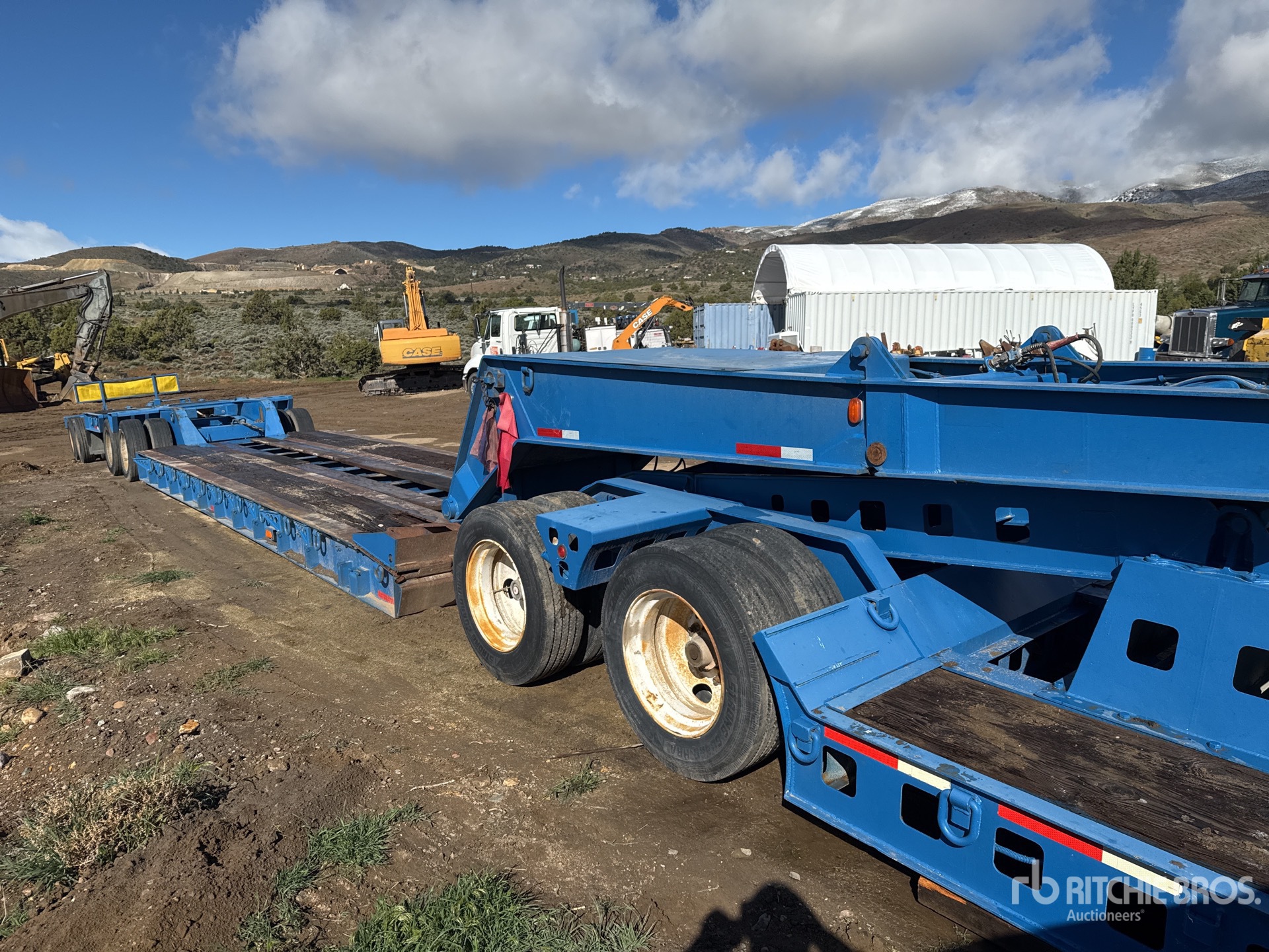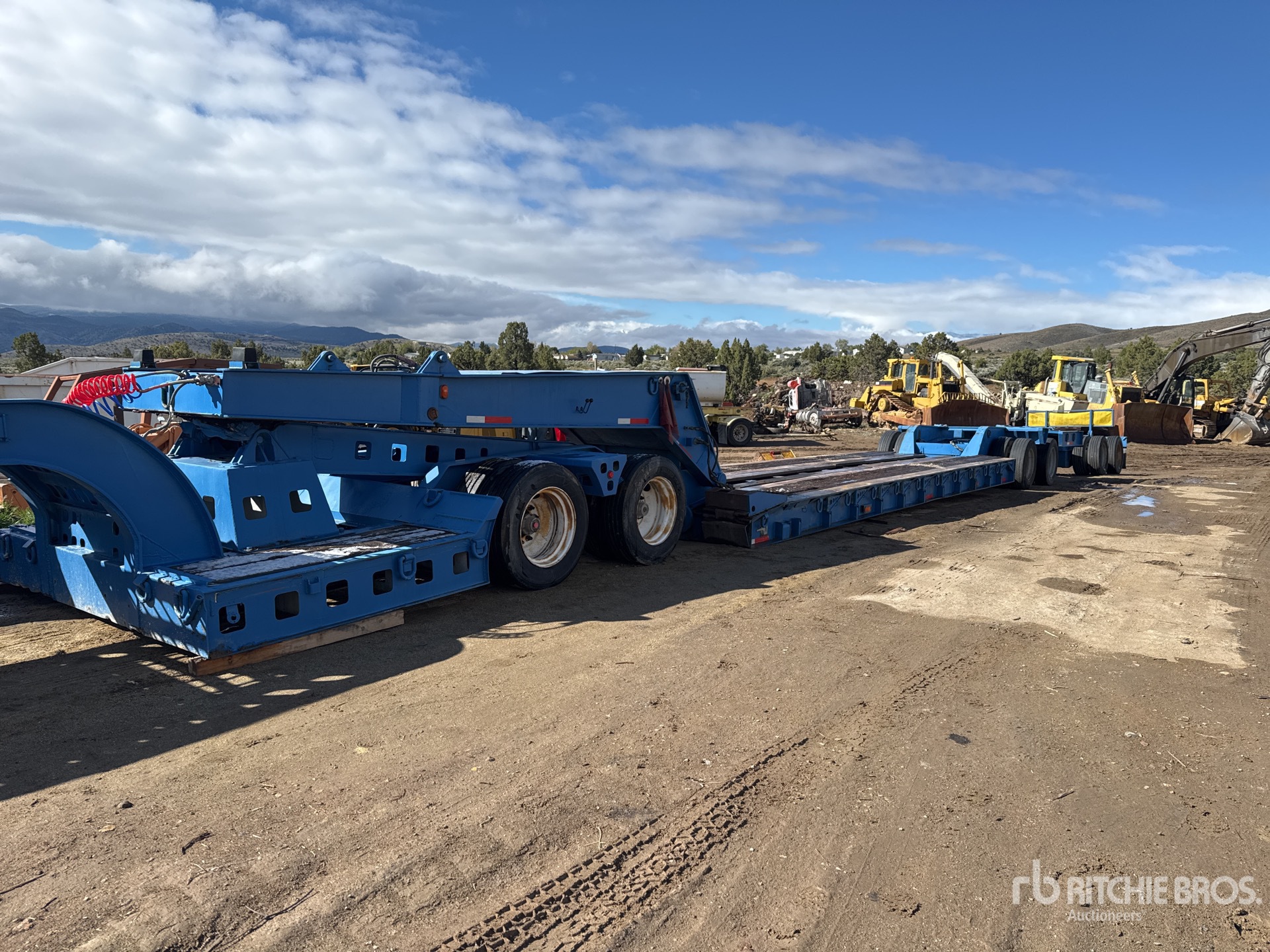 PTAC de 64 402 kg, col de cygne amovible hydraulique, plateau principal de 8,08 m x 2,74 m, pneus sur plateau, rallonges latérales repliables, suspension pneumatique, Jeep à empattement long, essieu de renfort à empattement long, système hydraulique autonome à essence