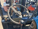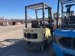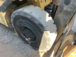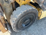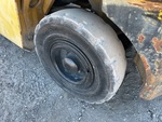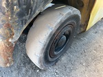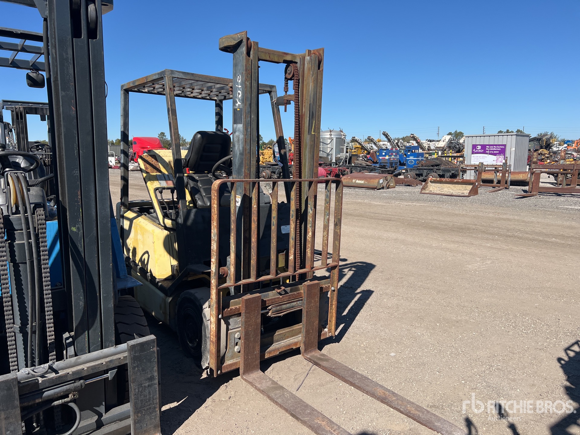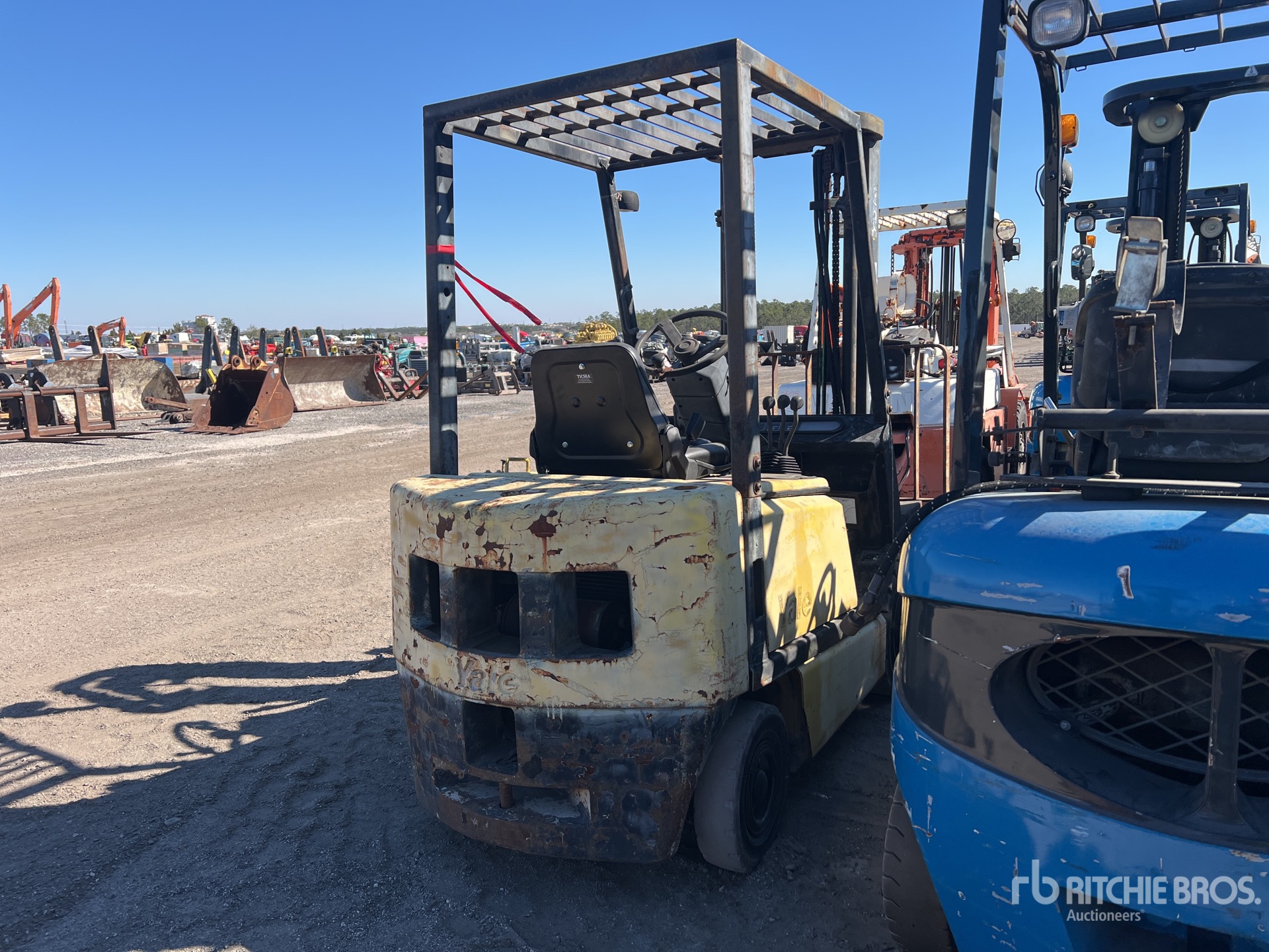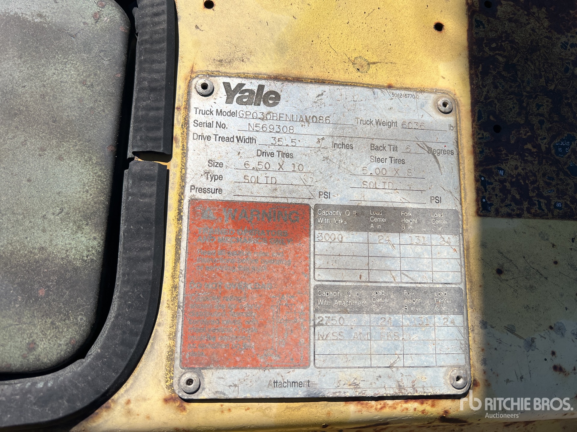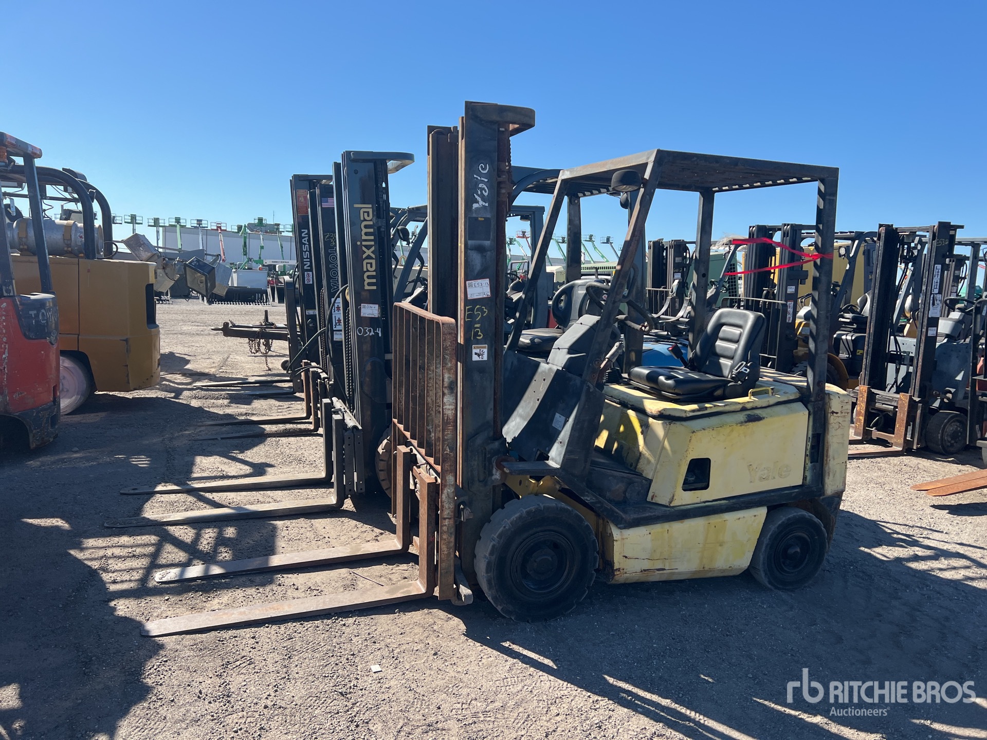 Mât à deux étages, hauteur de levage maximale de 1311 po, hauteur de mât abaissée de 83 po, fourches de 44 po, déport latéral, pneus pleins, moteur à essence Yale à 4 cylindres