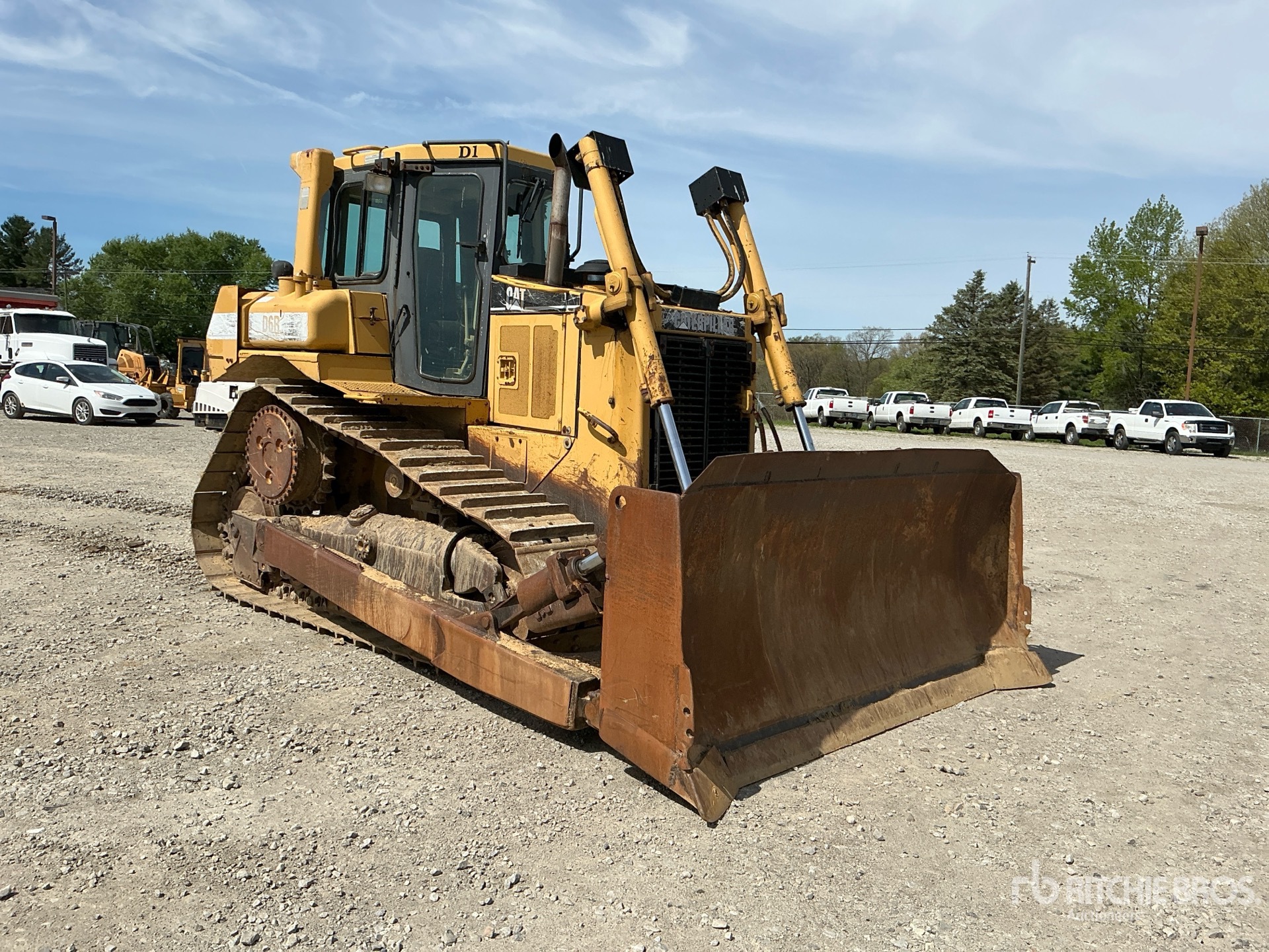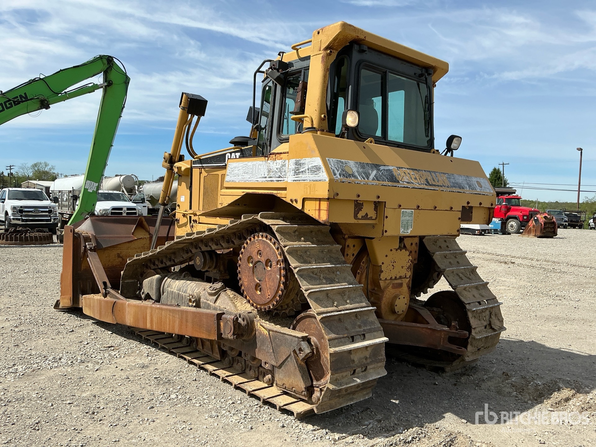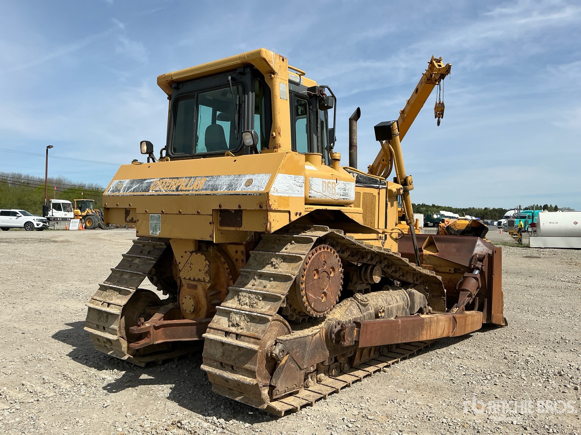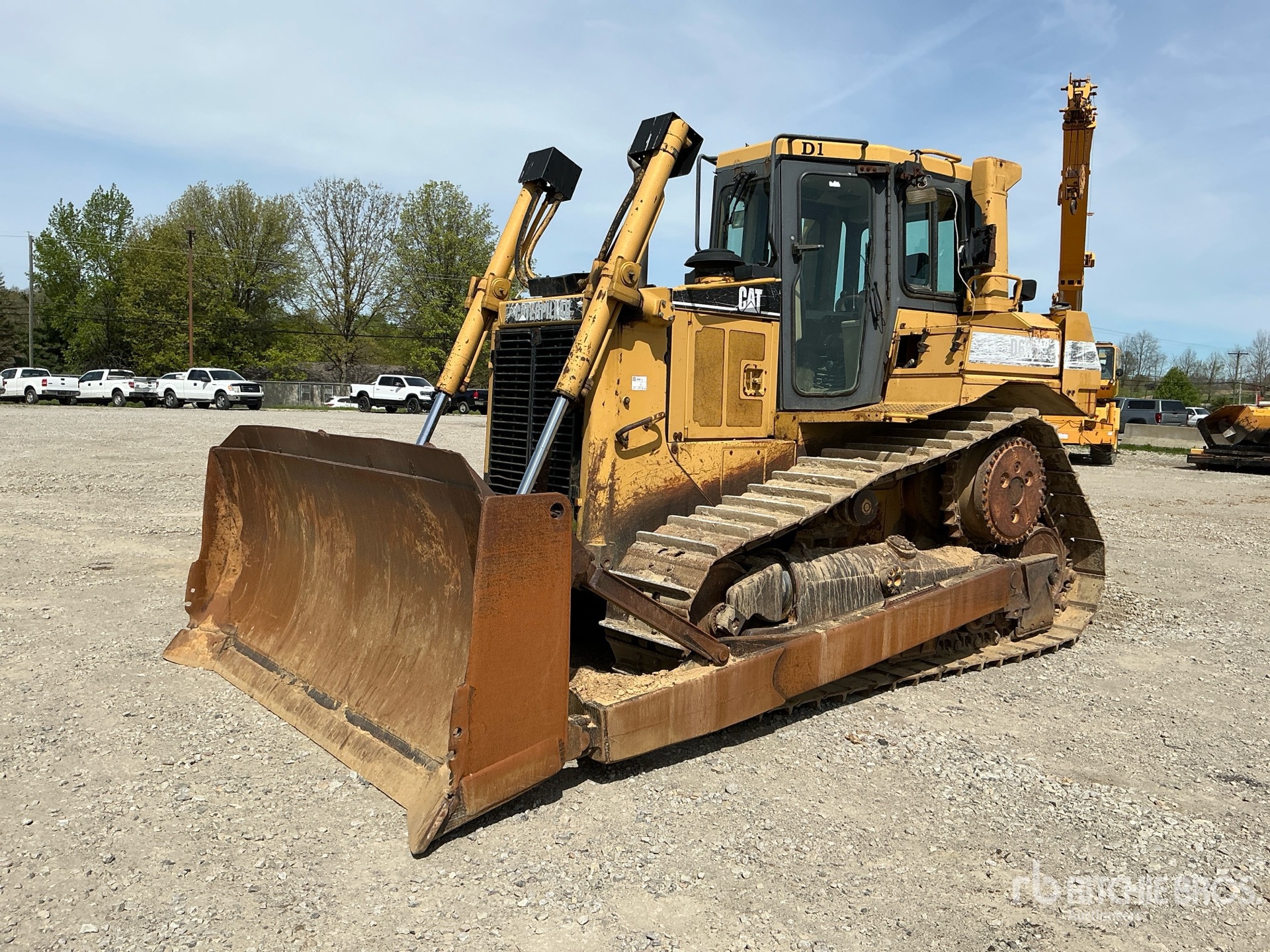 Cabine fermée, homologation EPA américaine de 1996, lame semi-U de 125 pouces de large avec inclinaison simple, chenilles à crampons simples de 22 pouces, barre d'attelage