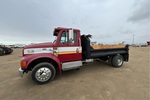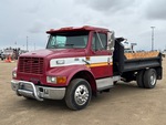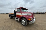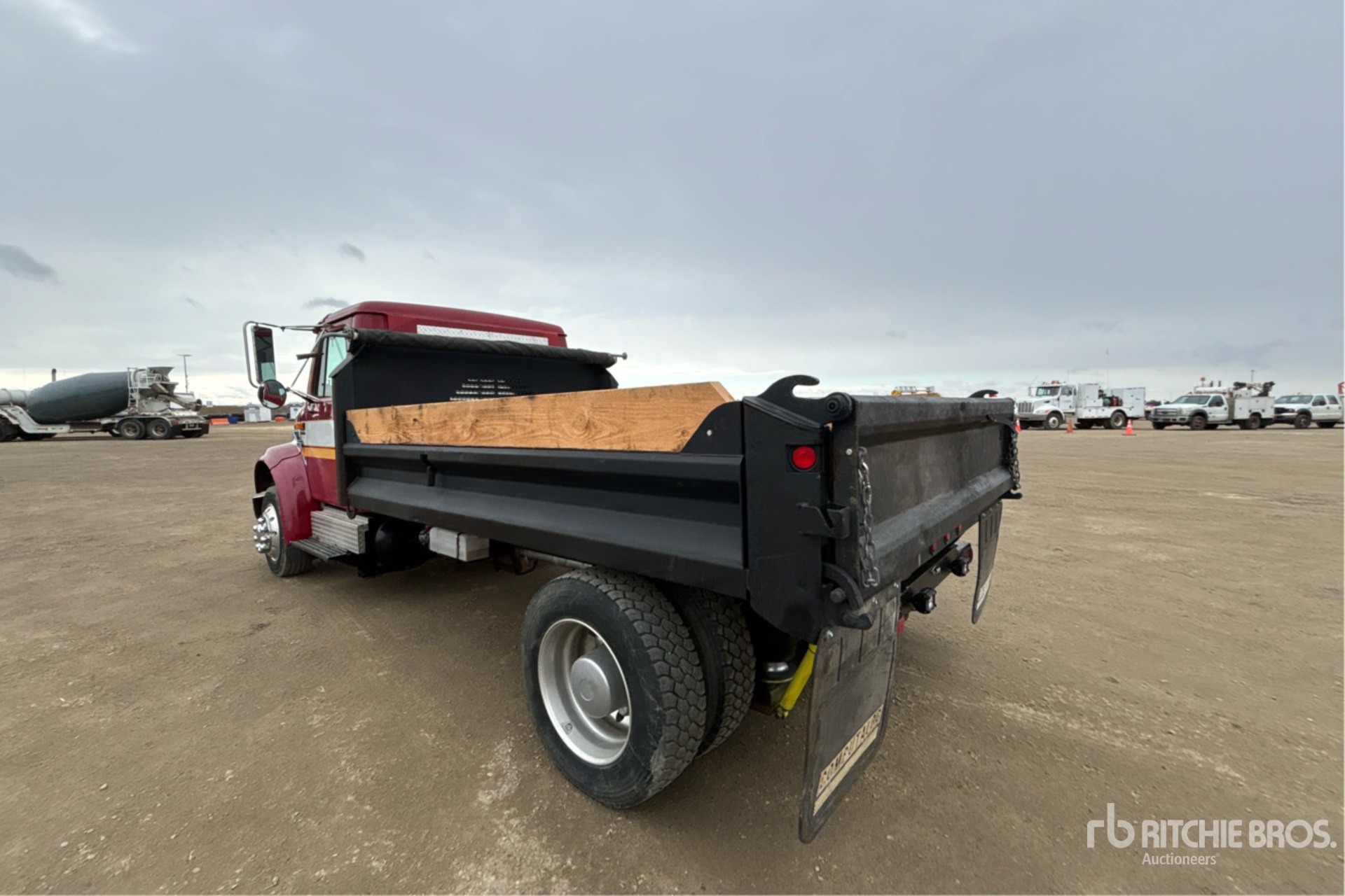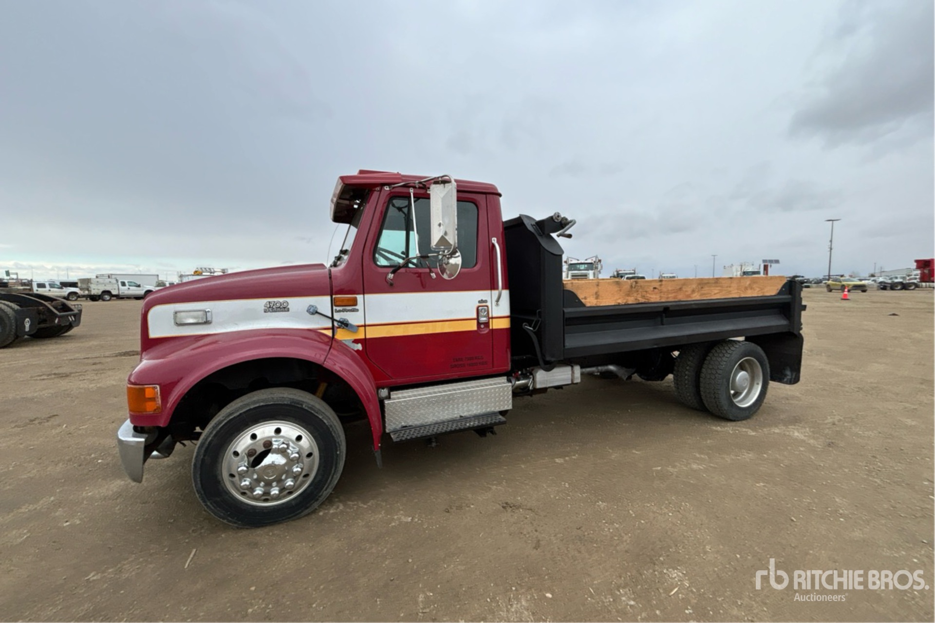 Situé sur la voie 46, emplacement 40, camion International DT466, moteur diesel 6 cylindres 7,6 L, 13 643 heures moteur, transmission automatique, essieu avant de 3 629 kg, essieux arrière de 5 443 kg, PTAC de 9 072 kg, jantes extérieures en aluminium, pneus 245/70R19.5, suspension pneumatique internationale, empattement de 4,32 m, caisse de 3,35 m de long x 0,51 m de hauteur, bâche à enroulement manuel