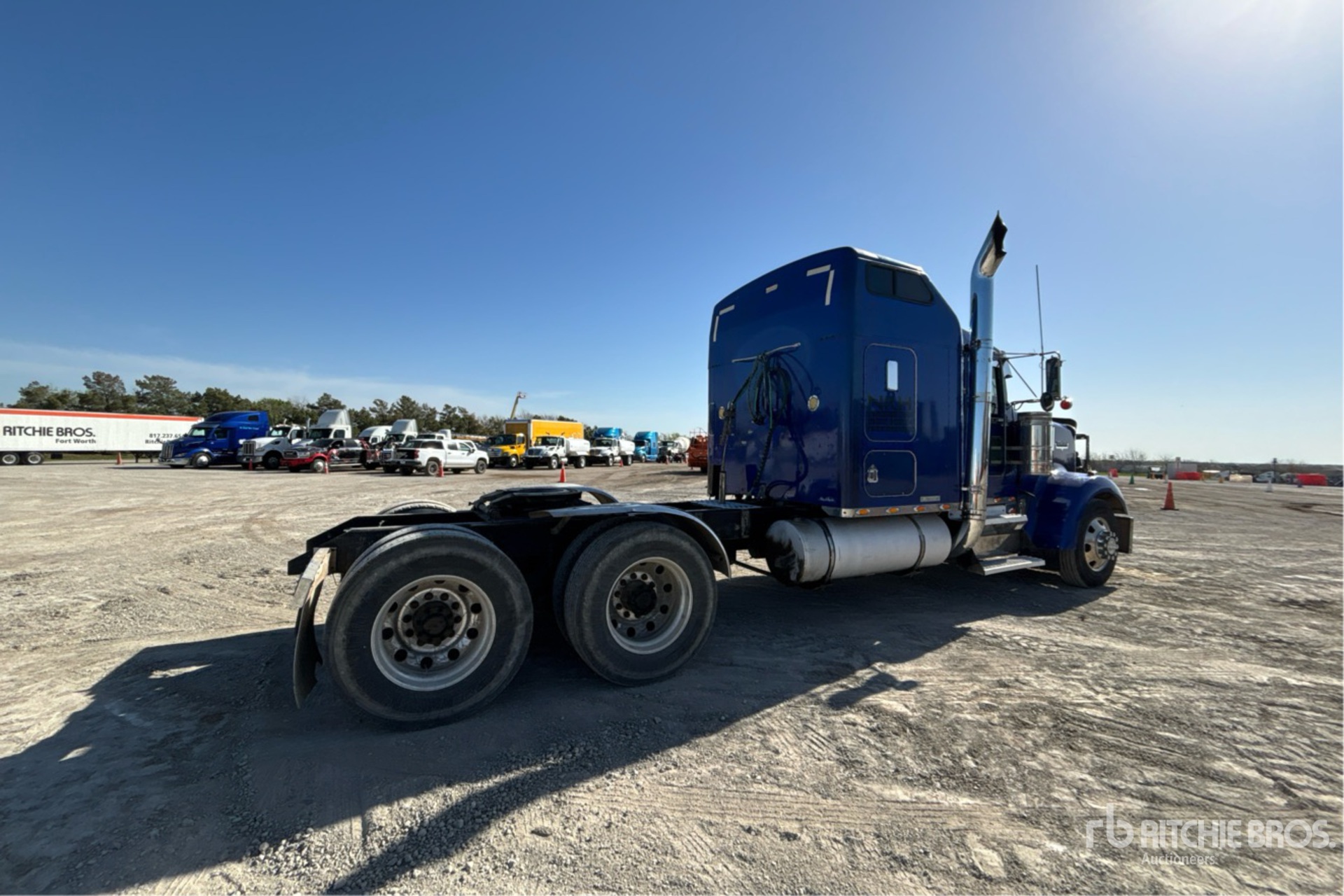 Situé sur la voie 35, emplacement 1, moteur Detroit Series 60 de 470 ch, étiquette EPA américaine de 2002, transmission manuelle Eaton Fuller, frein moteur, cabine couchette à toit surélevé de 62 pouces, empattement de 260 pouces, suspension pneumatique, roues extérieures en aluminium, pneus 11R24.5, sellette d'attelage coulissante pneumatique, deux réservoirs de carburant