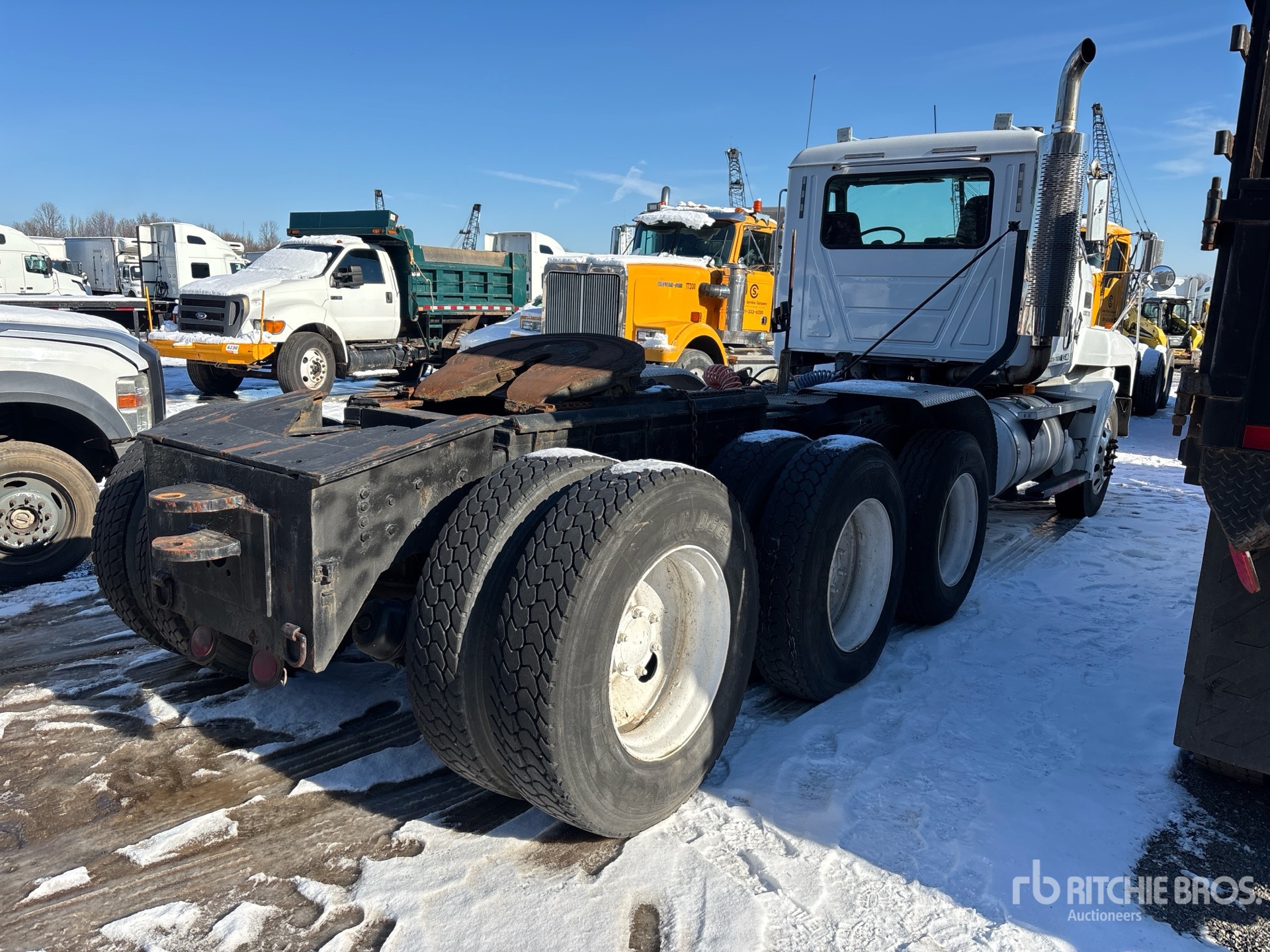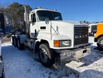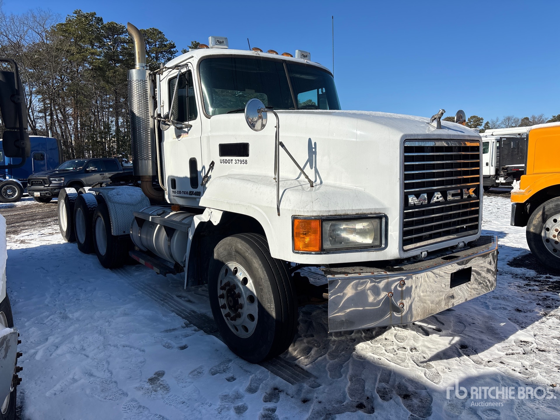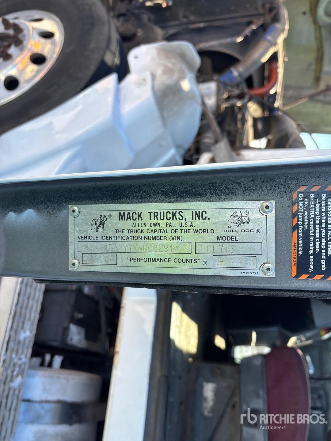 Moteur Mack E7 de 460 ch, homologué EPA 1999, transmission manuelle, empattement de 180 pouces, toit rigide, essieu porteur à suspension pneumatique, roues en aluminium, pneus 11R22.5, sellette d'attelage coulissante pneumatique, double réservoir de carburant, rampes surbaissées