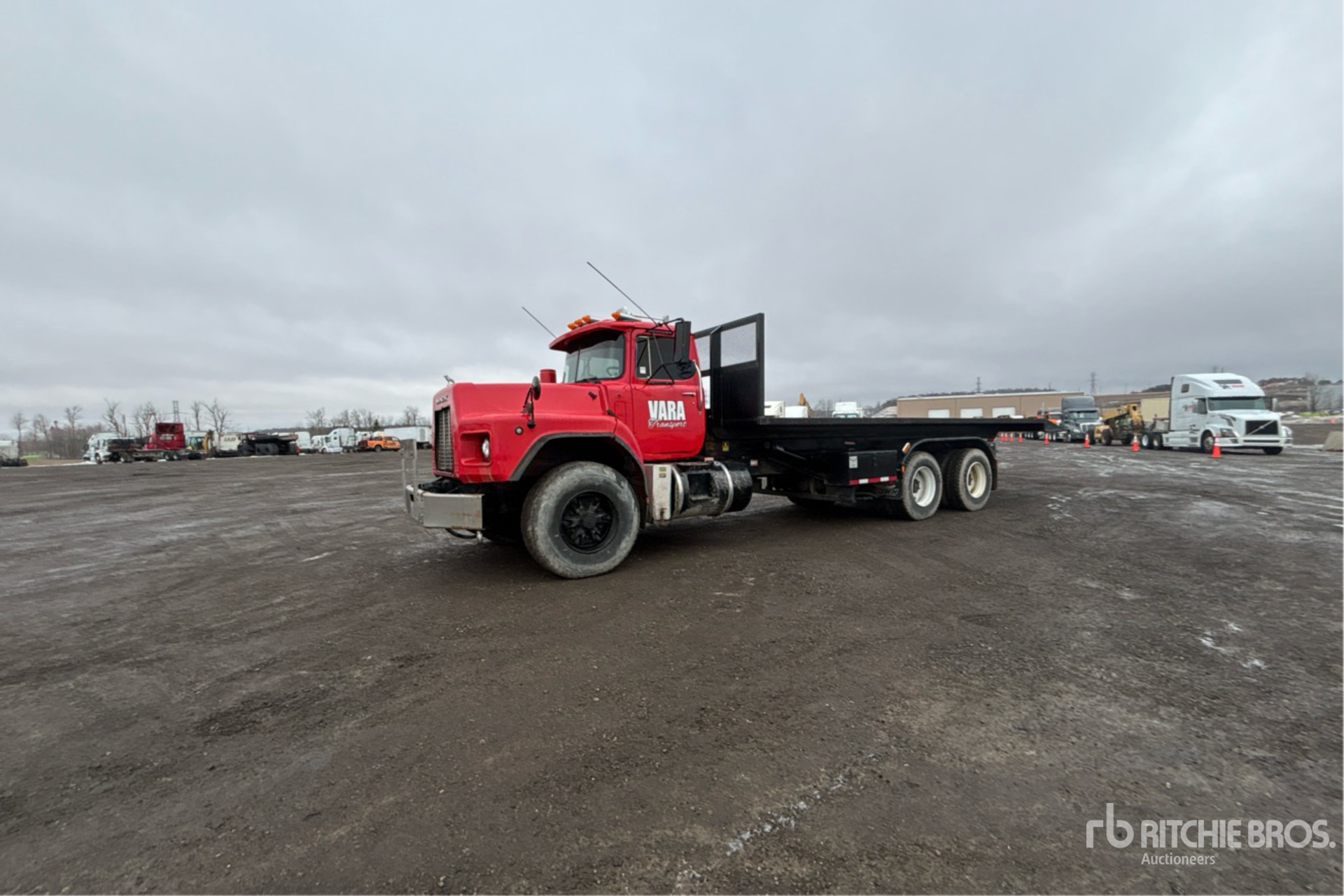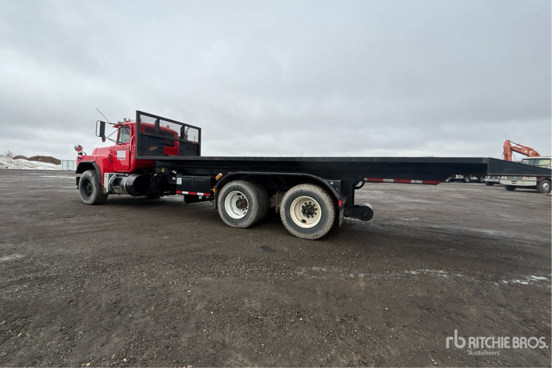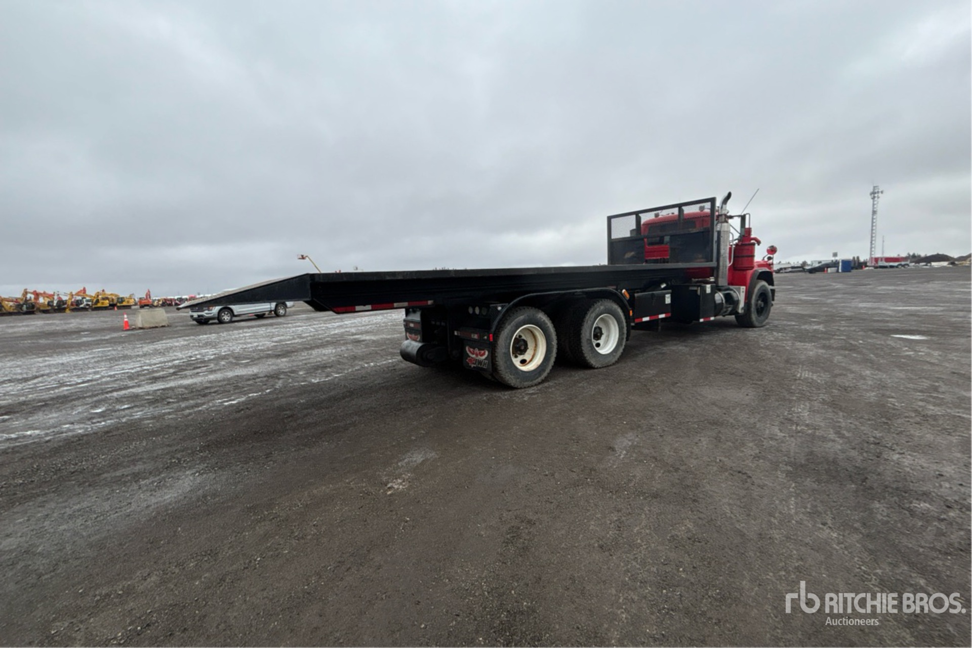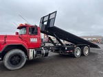 Camion Mack E7, moteur diesel 6 cylindres, homologué EPA 1999, boîte de vitesses manuelle, essieu avant de 9 080 kg, essieu arrière de 20 800 kg, PTAC de 29 800 kg, pneus avant 425/65R22.5, pneus arrière 11R22.5, suspension Camelback, empattement de 6,40 m, plateau de 8,23 m