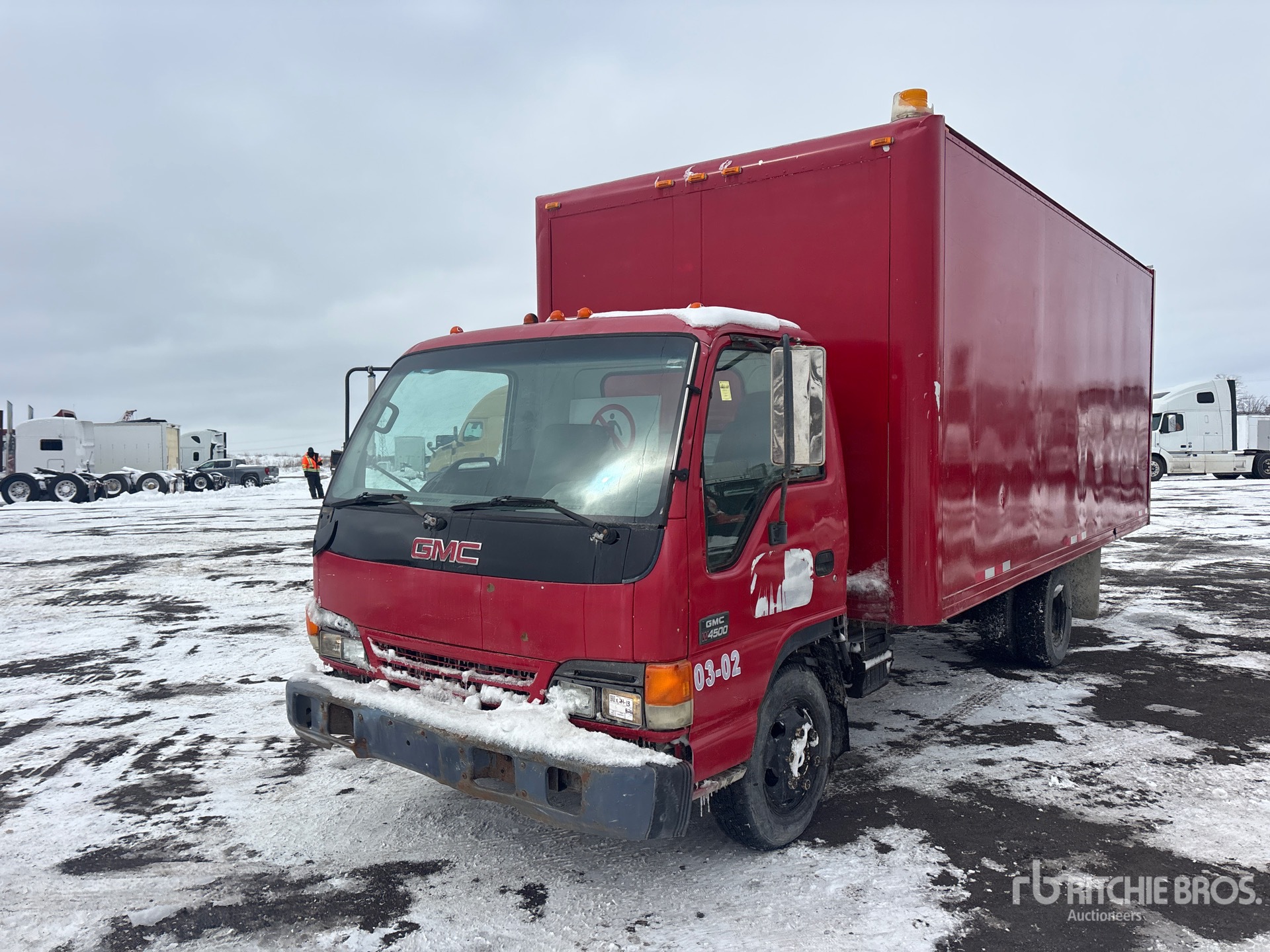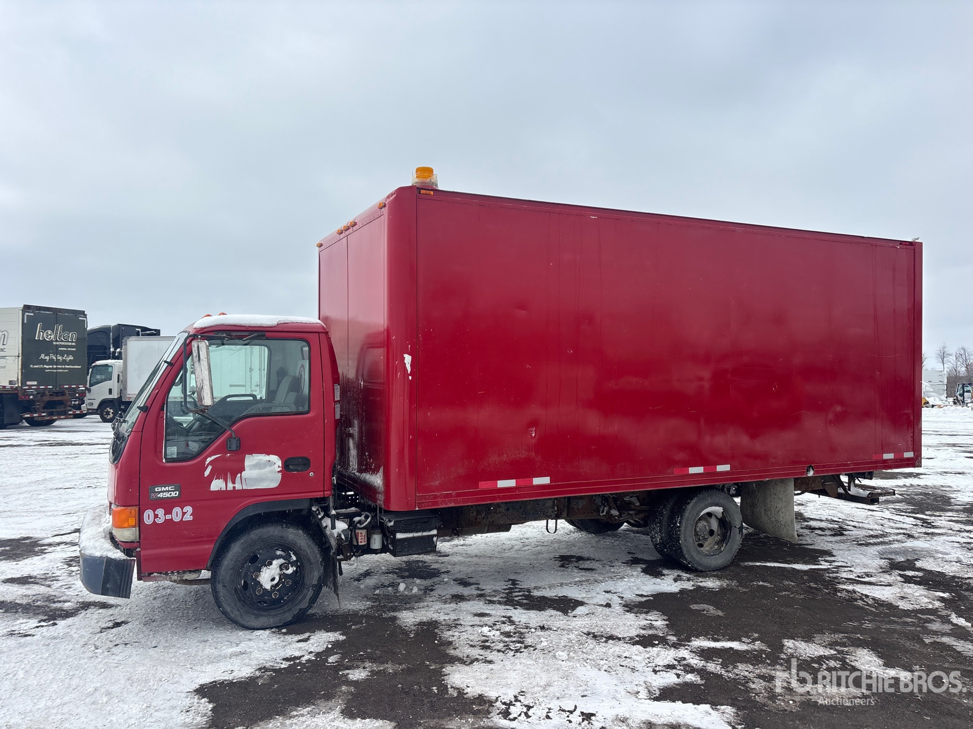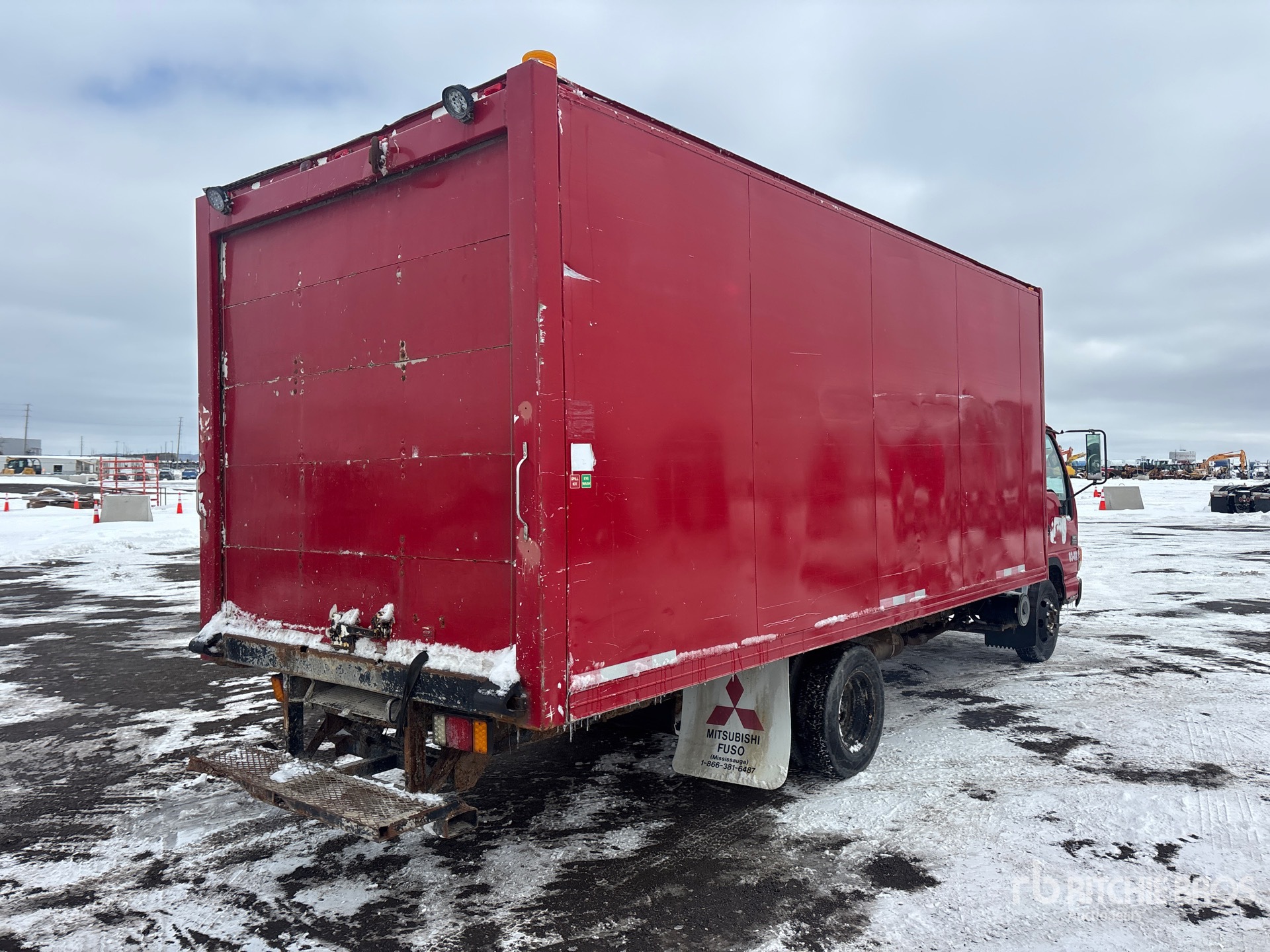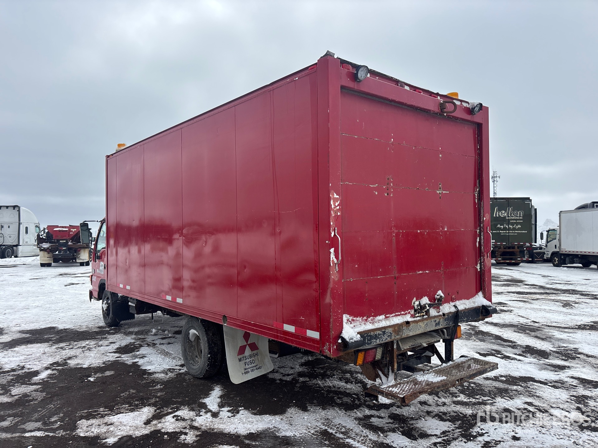 Moteur diesel Isuzu 4 cylindres 4,7 L, transmission automatique, essieu avant 2 430 kg, essieux arrière 4 480 kg, PTAC 6 577 kg, pneus 215/85R16, suspension à ressorts, empattement 3,86 m, dimensions de la caisse : 5,49 m x 2,44 m x 2,03 m, rampe d'accès