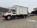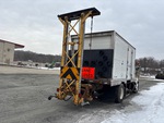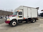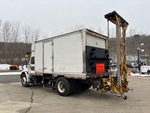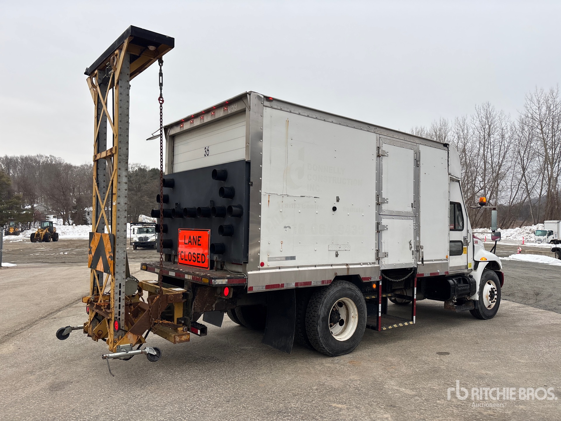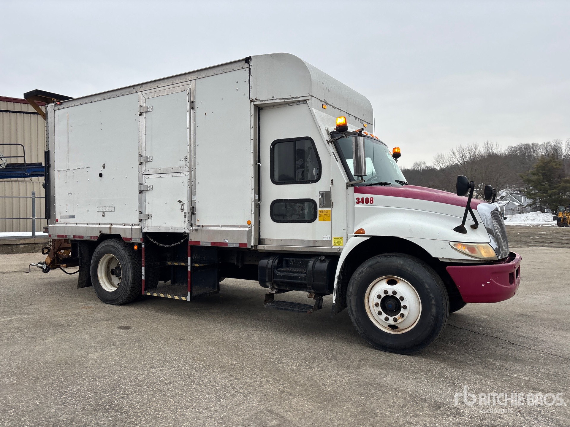 Moteur diesel International DT466 6 cylindres 7,6 L 195 ch, homologué EPA 2002, conforme aux normes CARB, 17 810 heures moteur, transmission automatique Allison, essieu avant 5 000 kg, essieu arrière 9 500 kg, PTAC 13 600 kg, pneus 11R22.5, suspension à ressorts, empattement 445 cm, carrosserie fourgon, panneau de signalisation Arrow