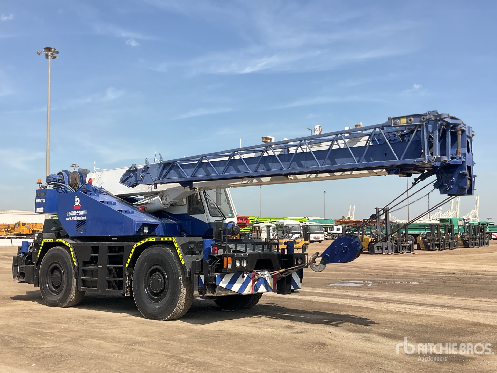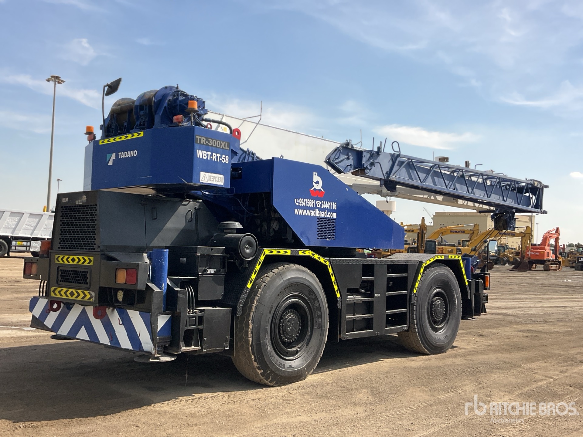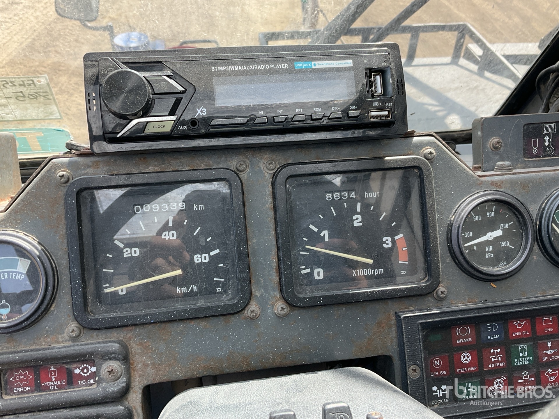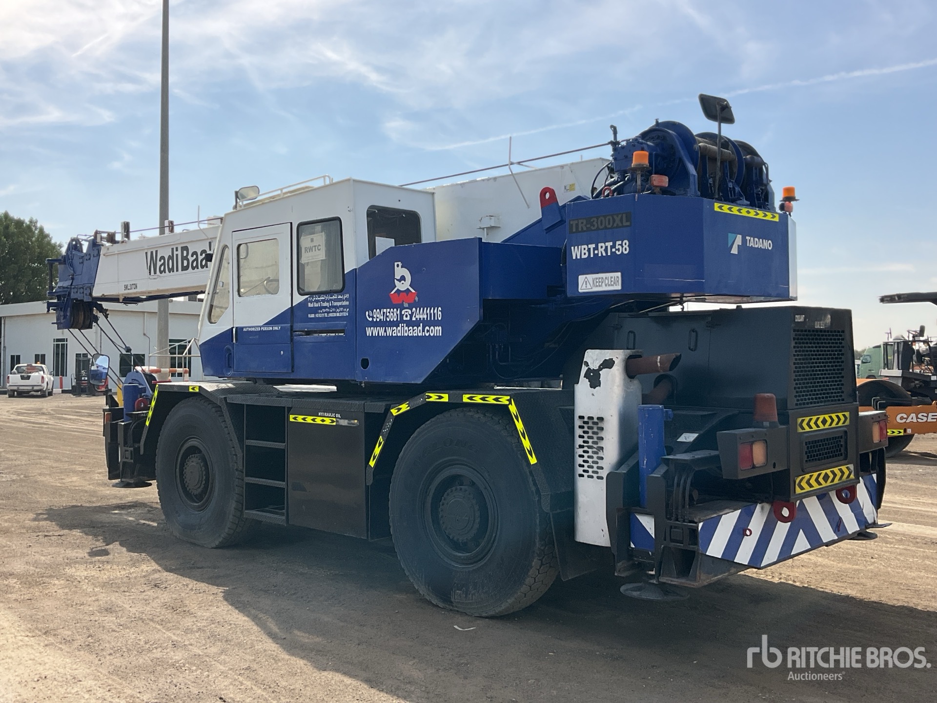 Climatisation, système anti-double blocage, indicateur de moment de charge TADANO, moteur diesel Mitsubishi 6 cylindres, flèche de 9,1 m minimum à 28,6 m maximum, palan auxiliaire, fléchette pivotante extensible de 7,2 m à 12,8 m, poulie à crochet à 3 réas d'une capacité de 30 tonnes