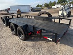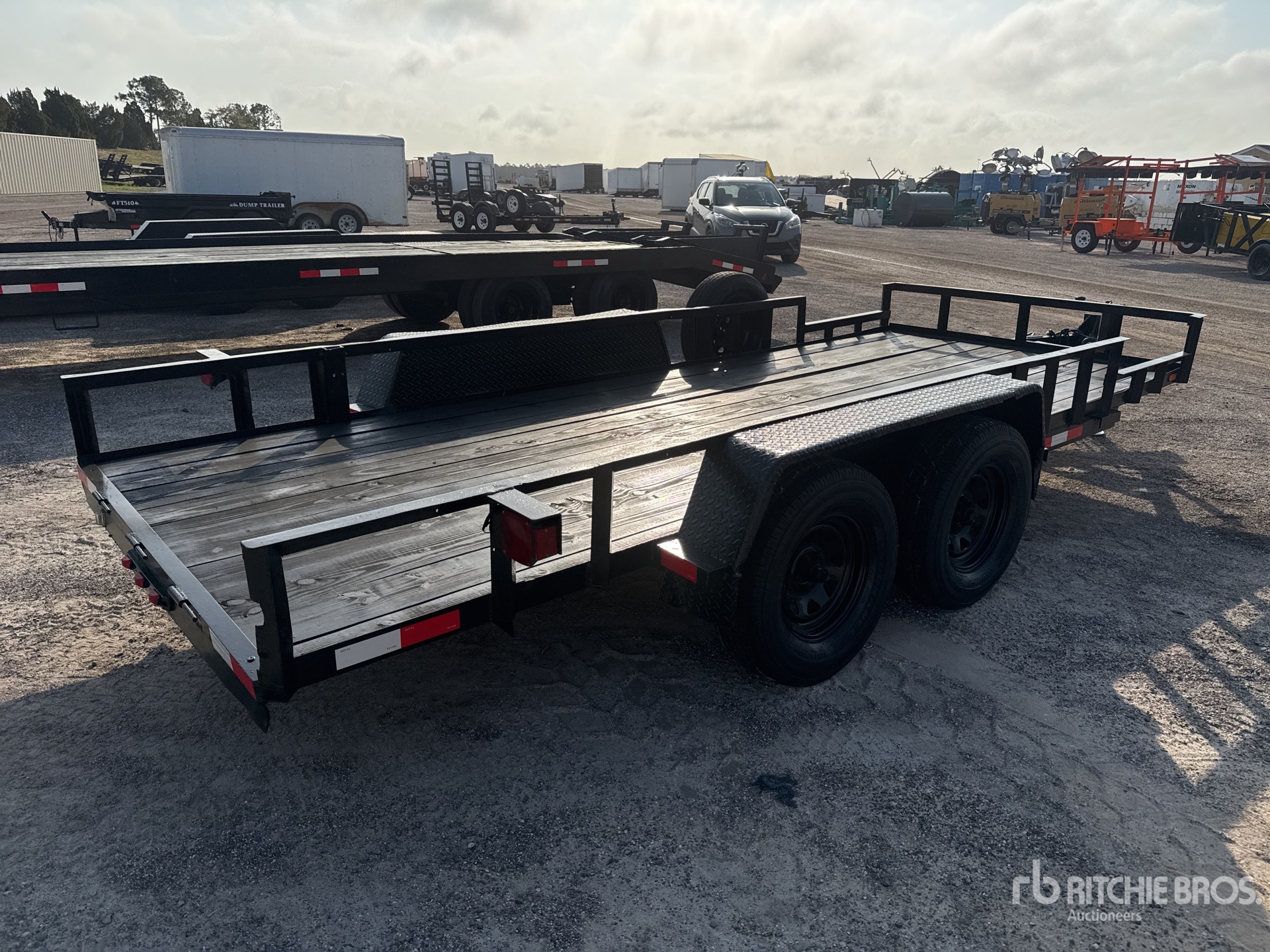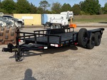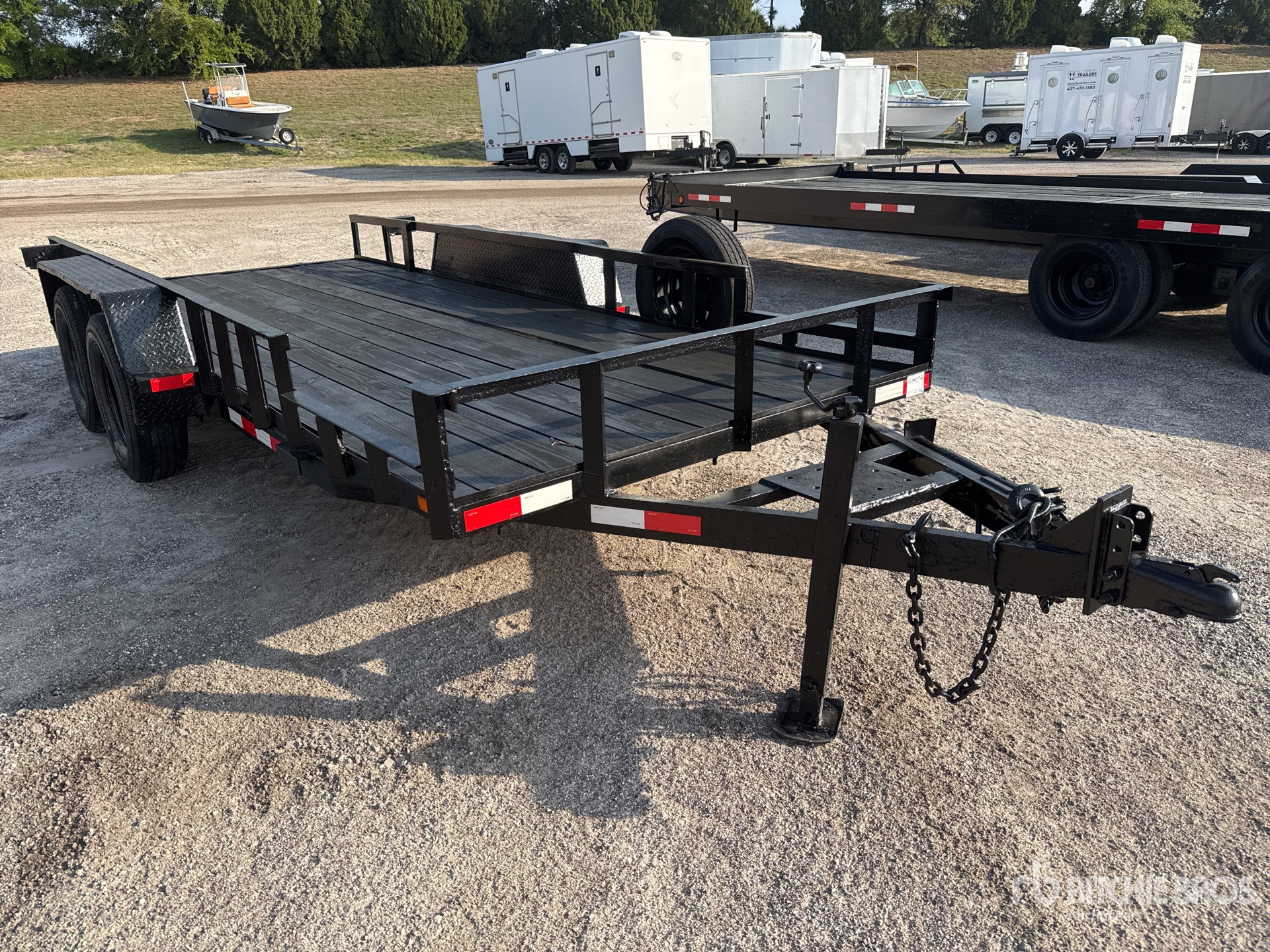 Attelage à boule, suspension à ressorts, plateau principal de 4,88 m (16 pi), largeur utile du plateau de 1,83 m (72 po), largeur totale du plateau de 2,44 m (96 po), plancher en bois, pneus 225/75R15