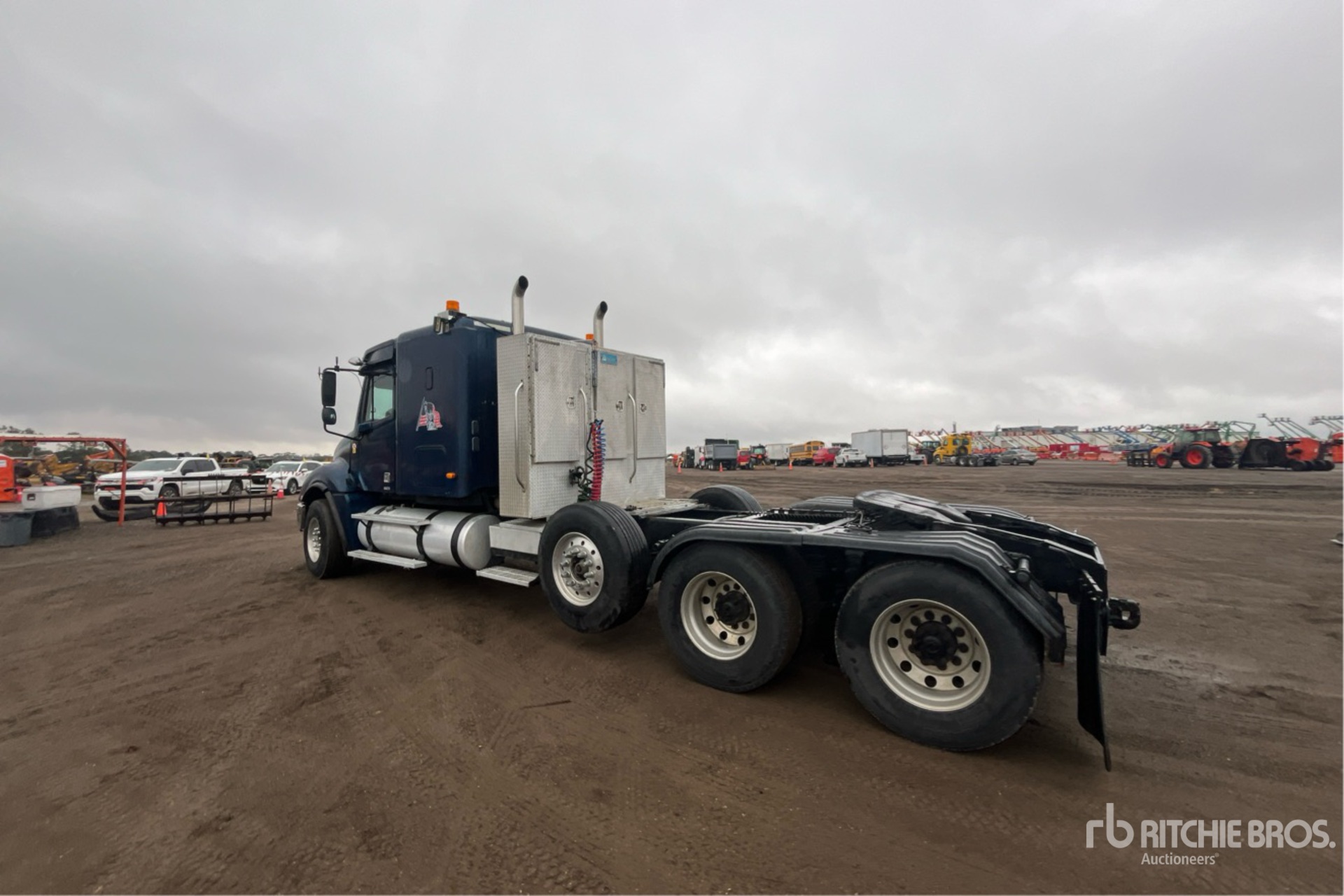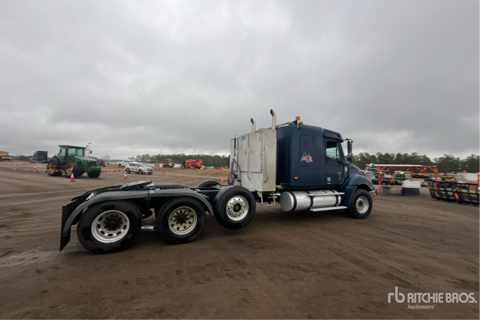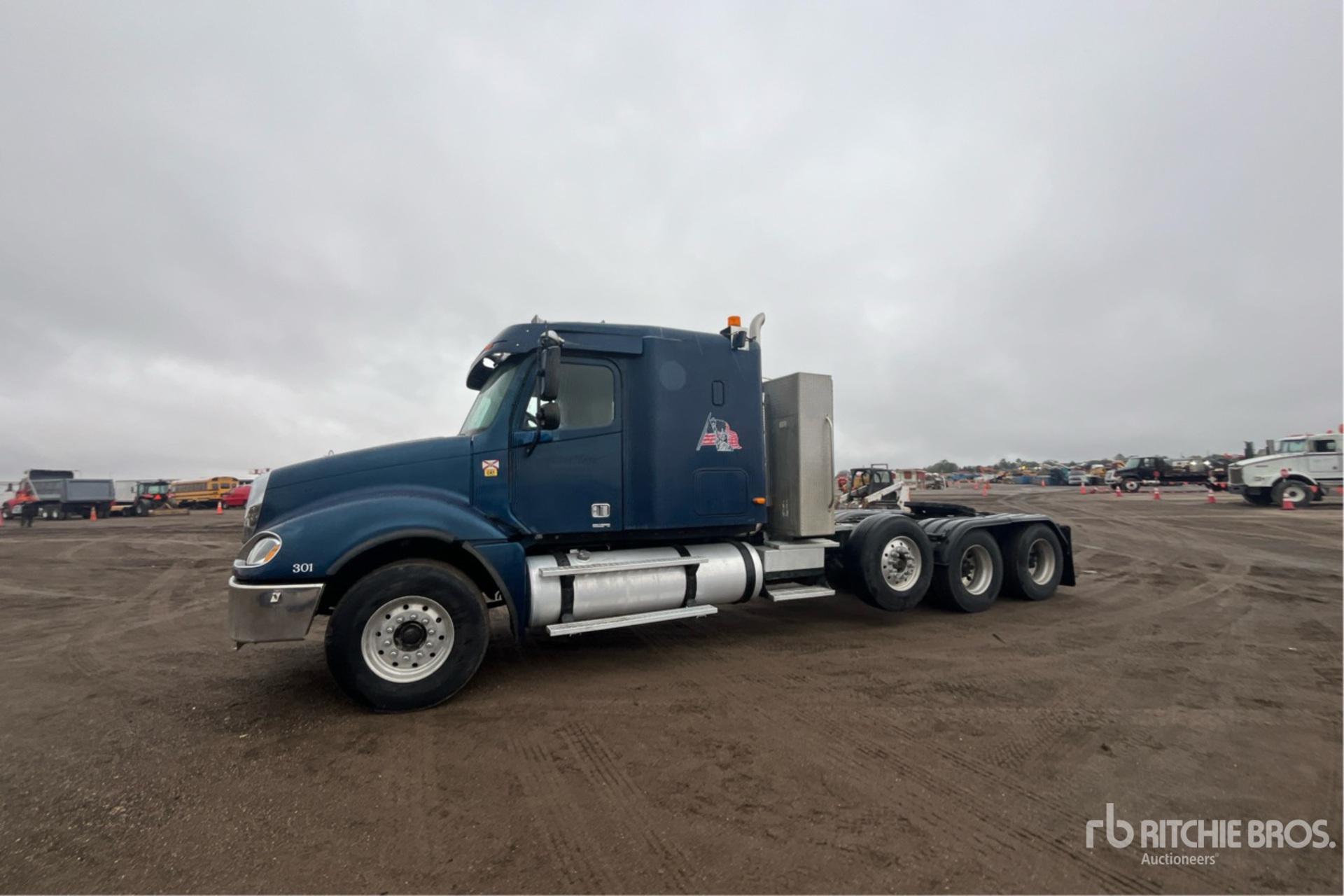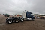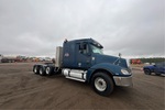 Situé sur la voie 74, emplacement 12, moteur Cat C15 de 525 ch, étiquette EPA américaine de 2003, 35 657 heures de fonctionnement, transmission manuelle Eaton Fuller à 18 vitesses, essieu avant de 5 987 kg, cabine couchette à toit plat de 122 cm, empattement de 681 cm, suspension pneumatique, essieu porteur relevable pneumatique, jantes en aluminium, pneus avant 385/65R22.5, pneus arrière 295/75R22.5, sellette d'attelage coulissante pneumatique, deux réservoirs de carburant, porte-bagages de cabine
