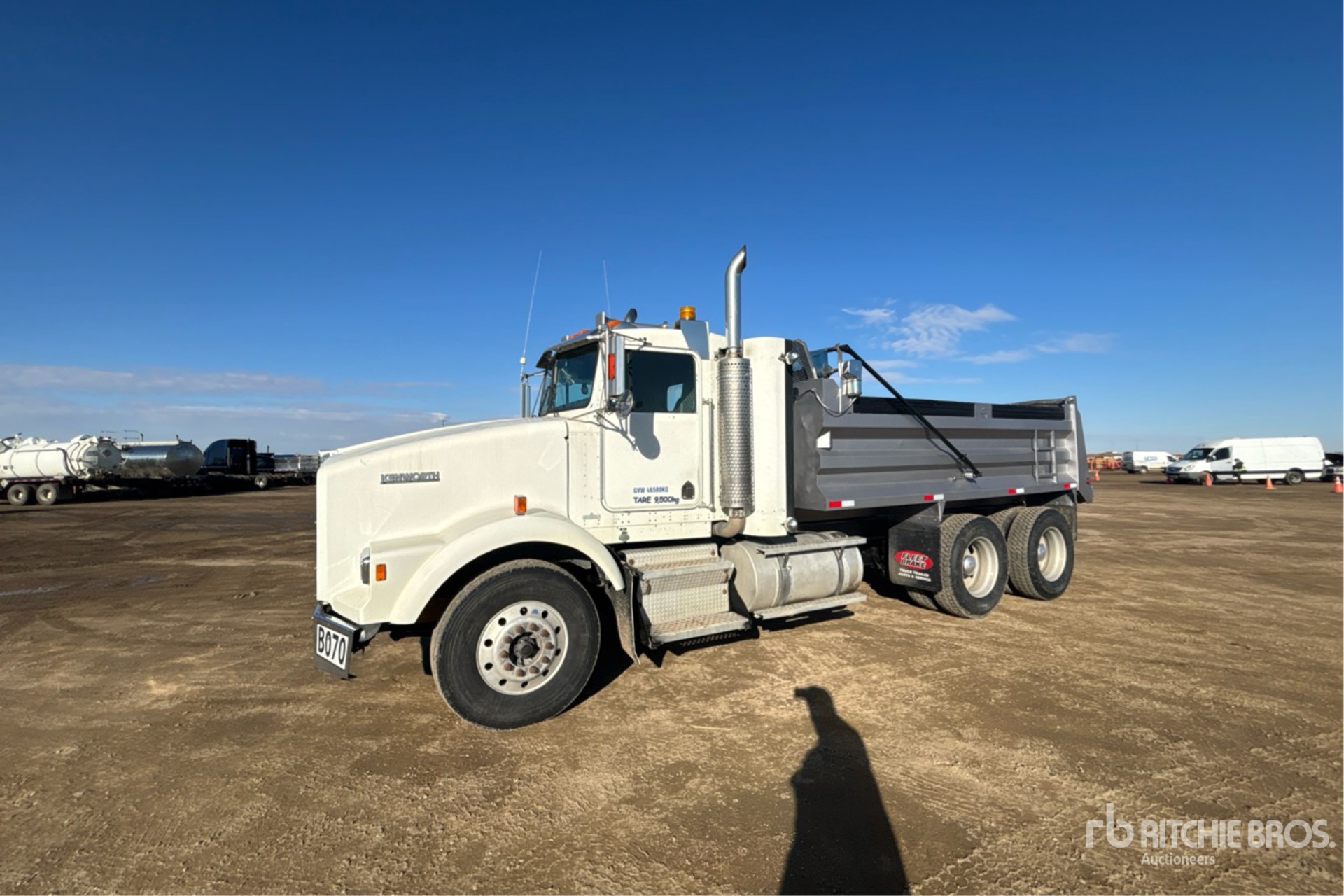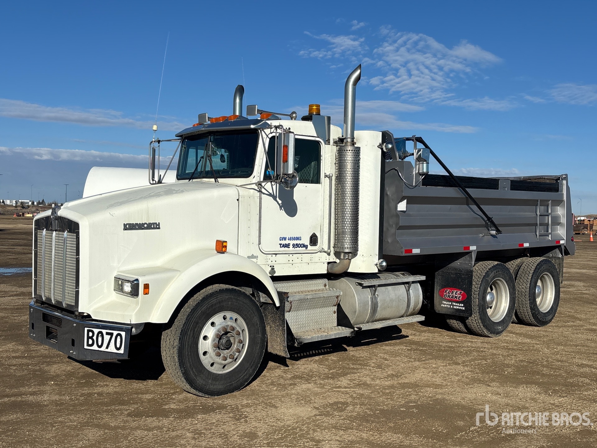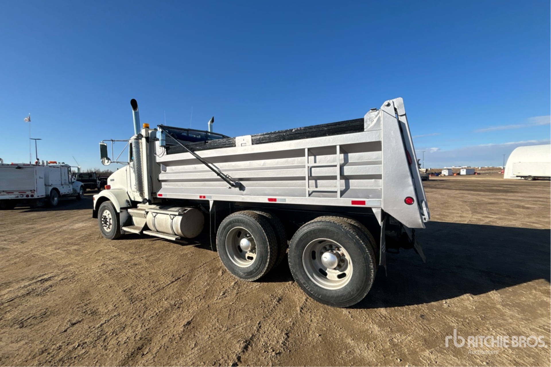 Situé sur la voie 46, emplacement 37, ce camion est équipé d'un moteur diesel Cat C15 6 cylindres de 14,6 L développant 475 ch, d'un frein moteur, d'une transmission manuelle Eaton Fuller RTLO-16918B à 18 rapports, d'un différentiel autobloquant, d'un essieu avant de 5 443 kg, d'essieux arrière de 19 958 kg, d'essieux moteurs Spicer DS463P, d'un rapport de pont de 3,90:1, d'un PTAC de 25 401 kg, d'une cabine à suspension pneumatique, de jantes extérieures en aluminium, de pneus avant 315/80R22.5 et de pneus arrière 11R24.5, d'une suspension pneumatique, d'une prise de force, d'une benne en acier de 4,57 m de long x 0,86 m de haut, d'une bâche à enroulement électrique et d'un attelage à anneau.
