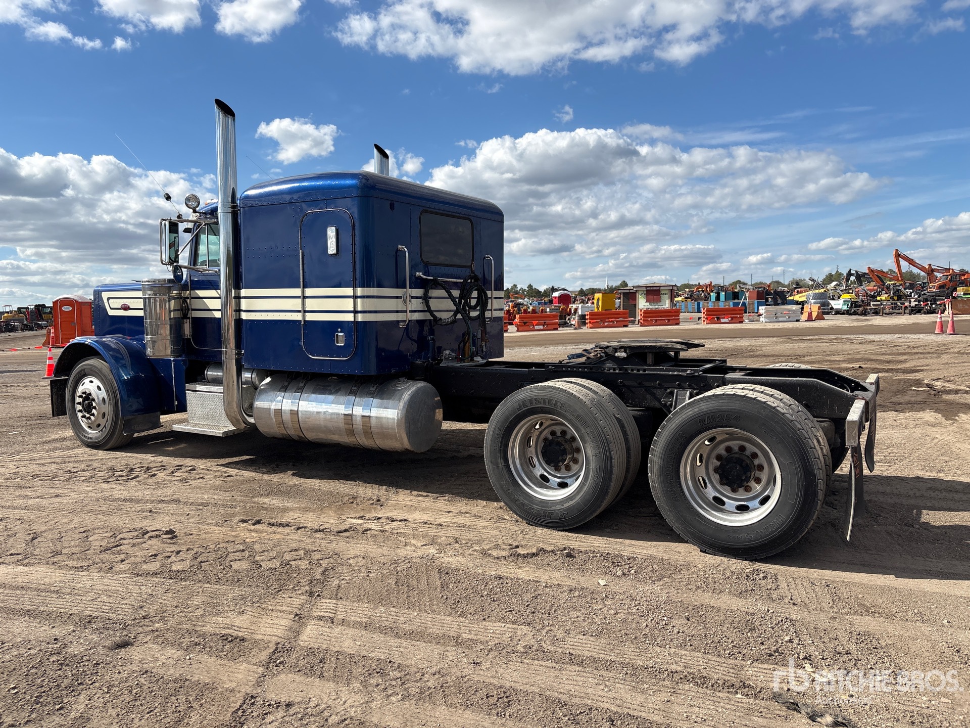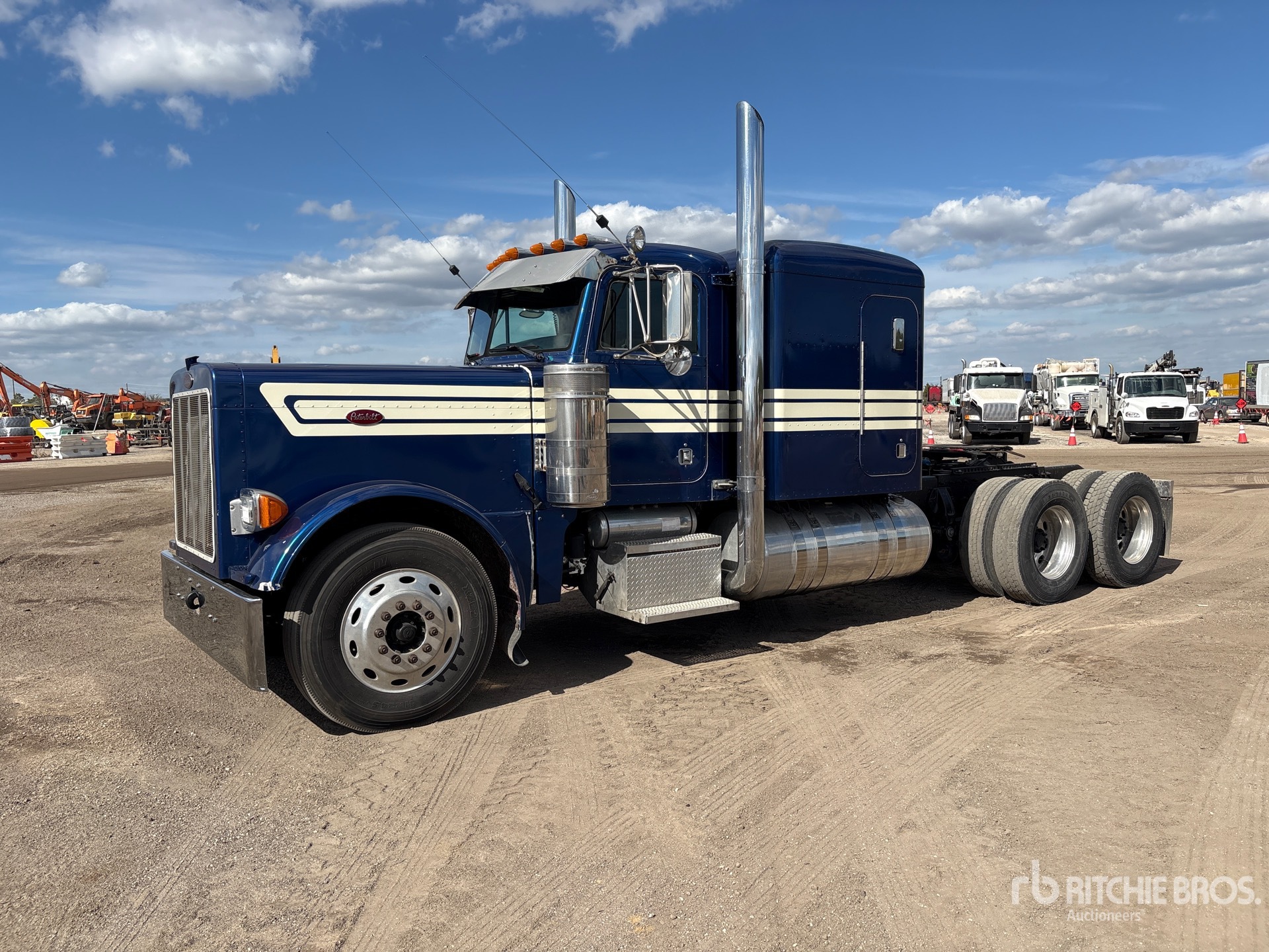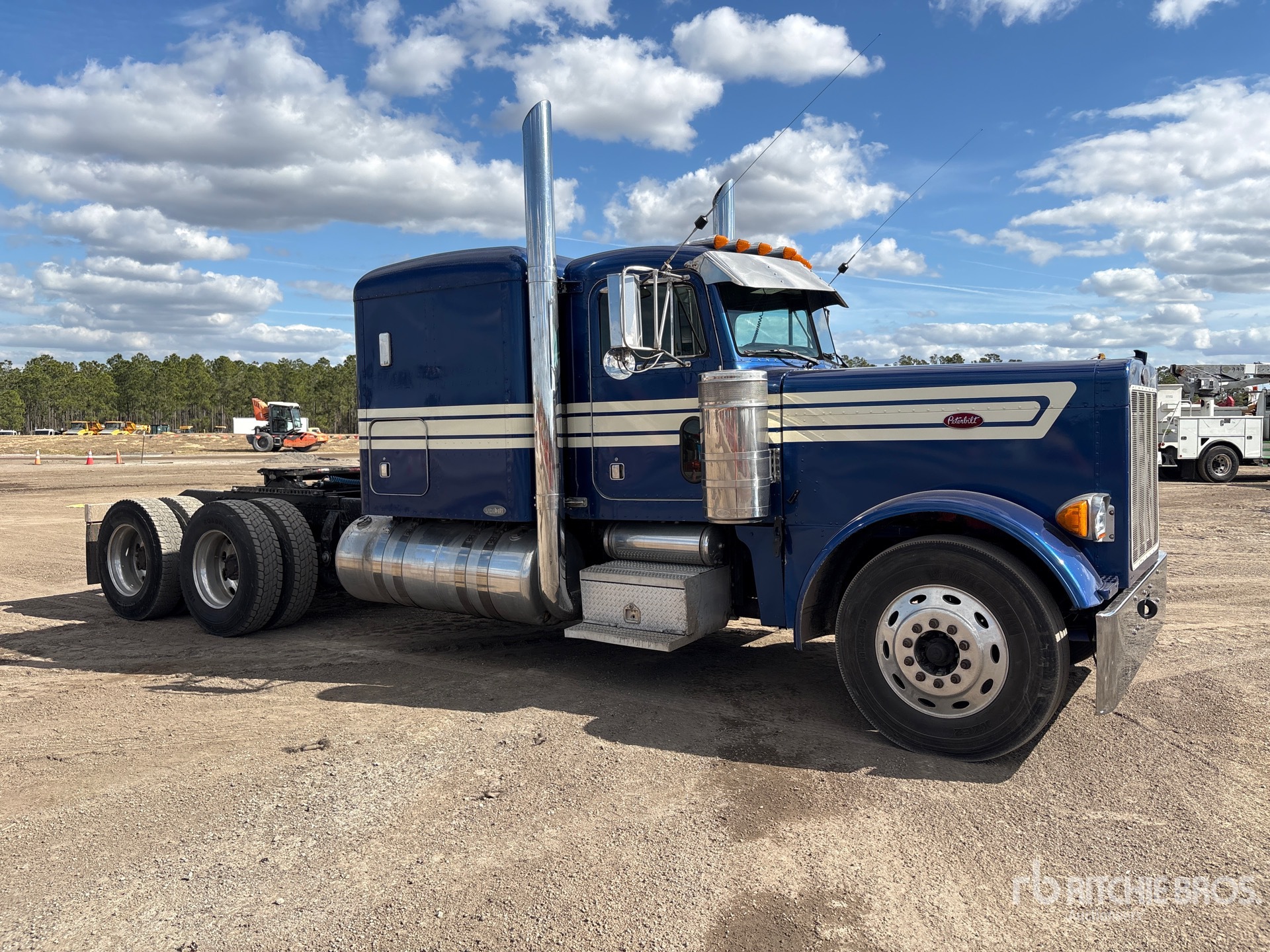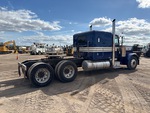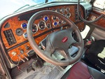 Moteur Caterpillar C15 de 550 ch, homologué EPA (États-Unis) 2004, boîte de vitesses manuelle Eaton Fuller, essieu avant de 5443 kg (12 000 lb), essieu arrière de 17 164 kg (38 000 lb), PTAC de 22 688 kg (50 000 lb), frein moteur, cabine couchette à toit plat de 91,4 cm (36 po), empattement de 640,1 cm (252 po), suspension pneumatique, jantes en aluminium, pneus 11R24.5, système hydraulique, sellette d'attelage coulissante pneumatique