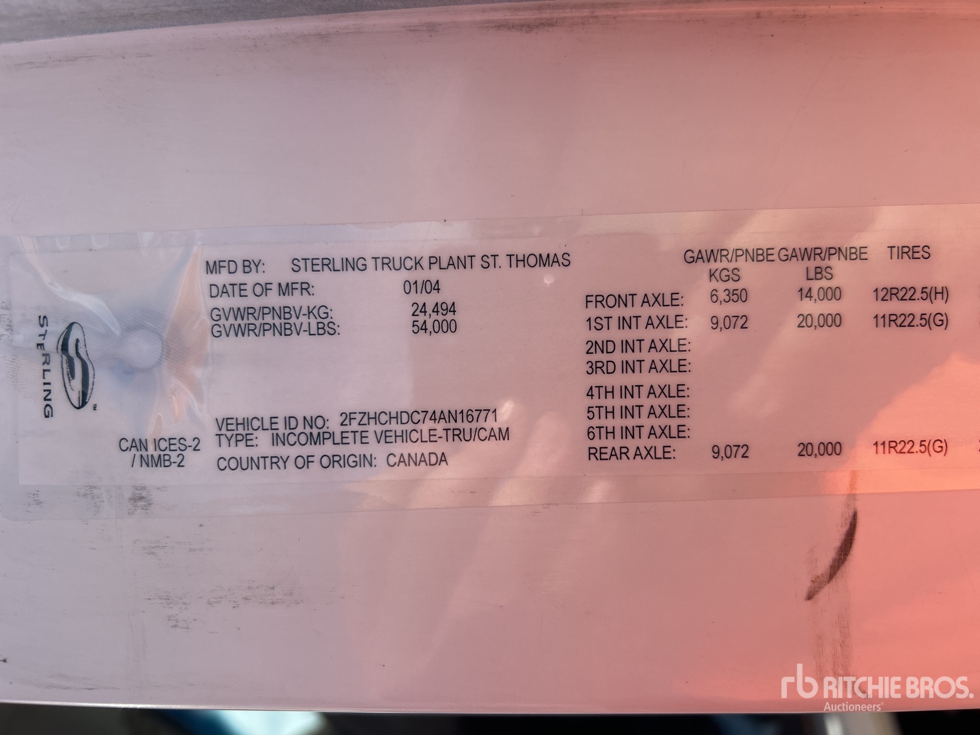 Moteur diesel Cat C7 7,2 L de 300 ch, homologué EPA (États-Unis) 2004, boîte de vitesses manuelle Eaton Fuller, différentiel autobloquant, essieu avant de 6 350 kg, essieu arrière de 18 144 kg, PTAC de 24 450 kg, jantes en aluminium, pneus 11R24.5, suspension à balancier sur silentblocs, empattement de 4,88 m, réservoir en acier United Truck & Equipment de 15 134 litres (2004), pompe hydraulique, rampe d'arrosage de 2,44 m, pulvérisation avant, arrière et latérale