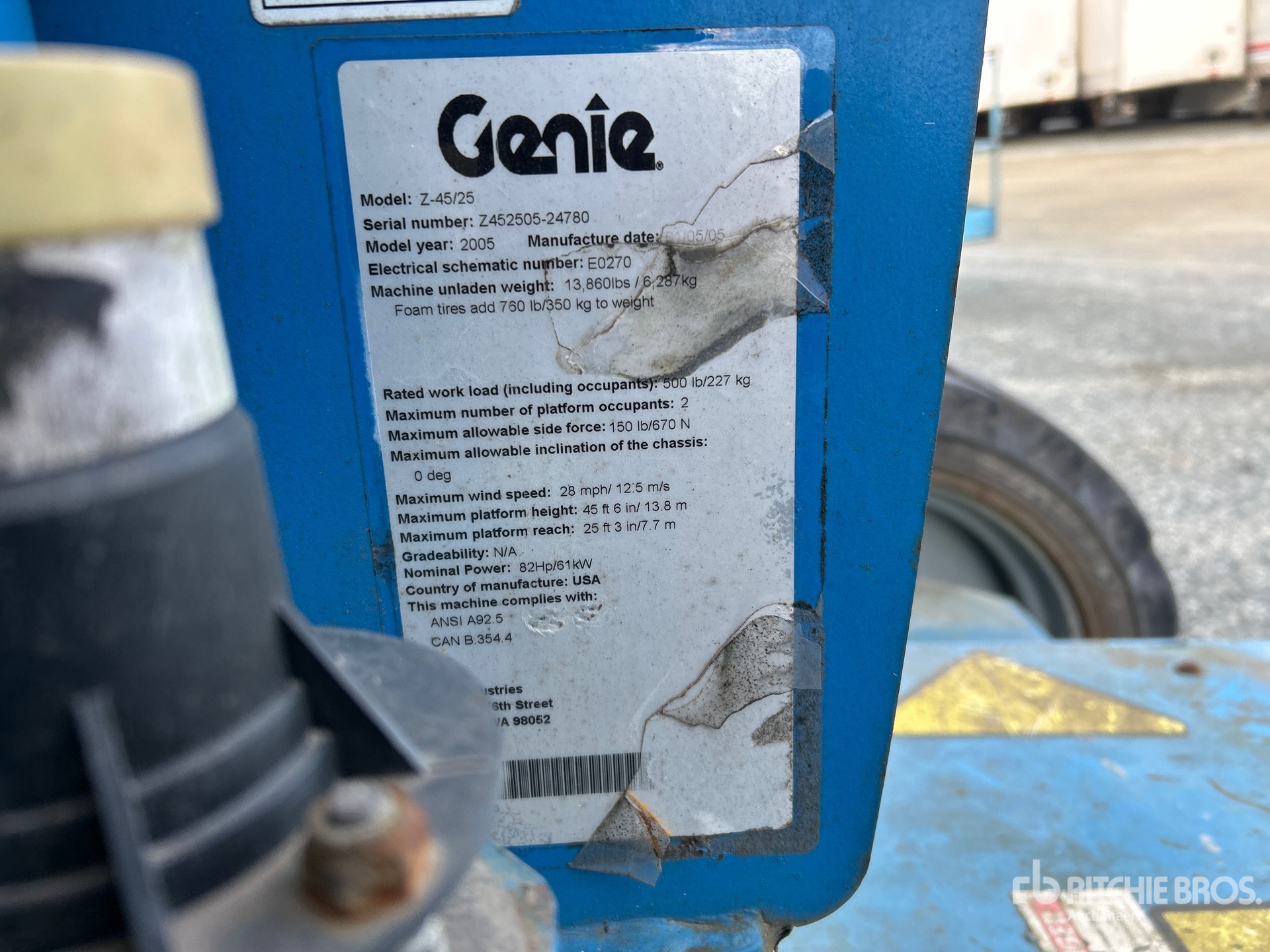 Hauteur maximale de la plateforme : 13,96 m (45 pi 6 po), capacité de charge maximale : 227 kg (500 lb), flèche, alimentation électrique de la plateforme, homologation EPA américaine de 2004, moteur Ford LRG-425 EFI à 4 cylindres bicarburant, pneus NHS 355/55D625