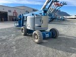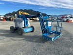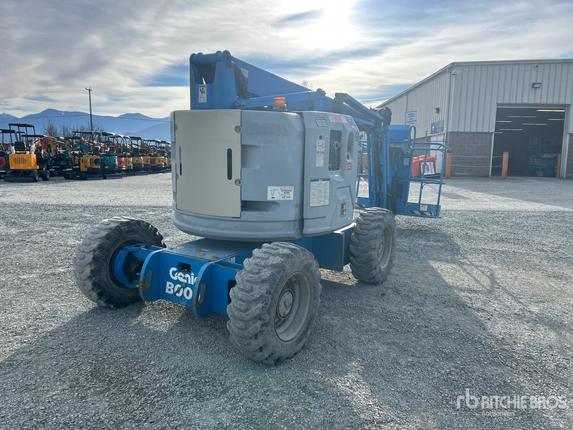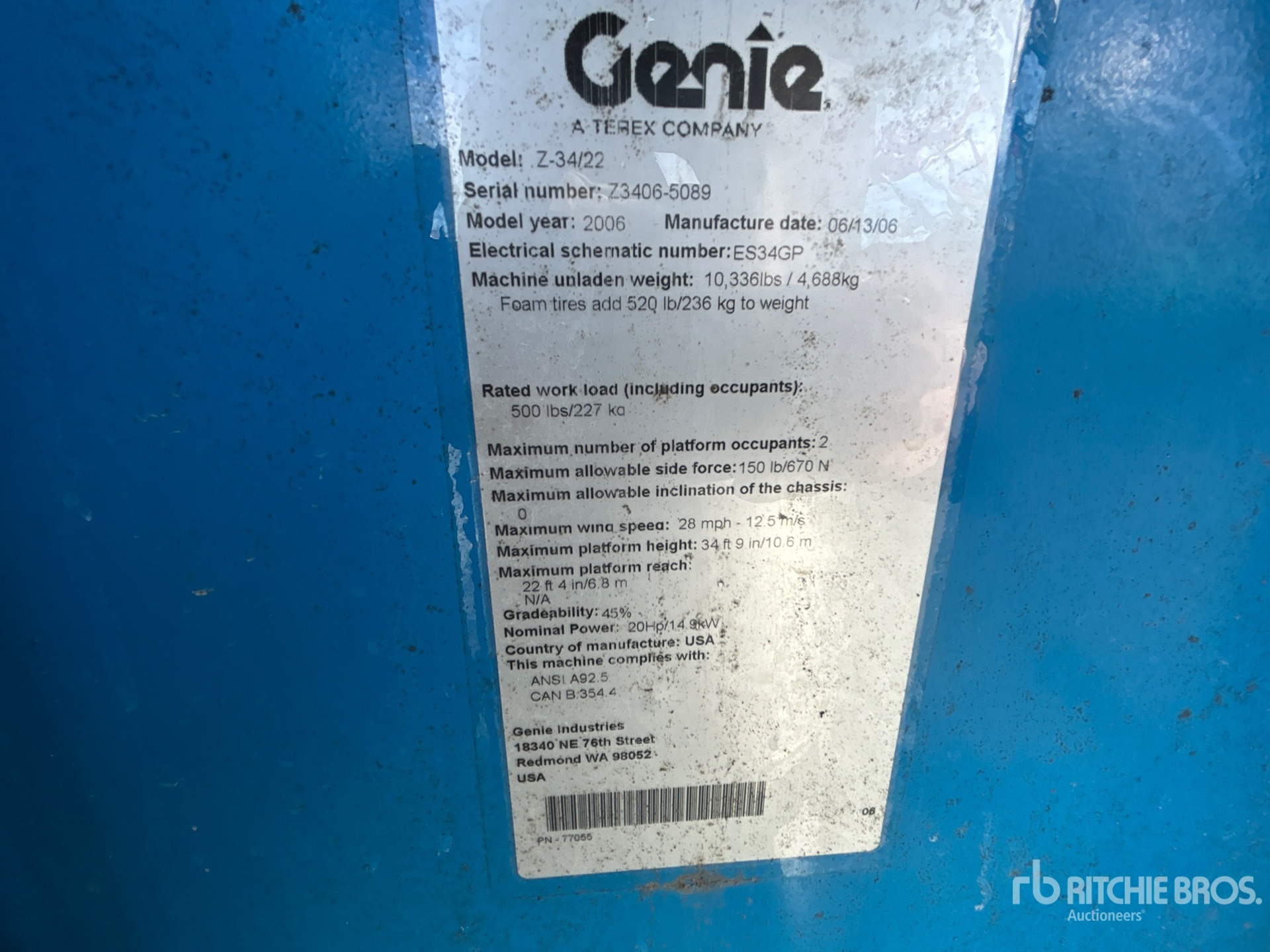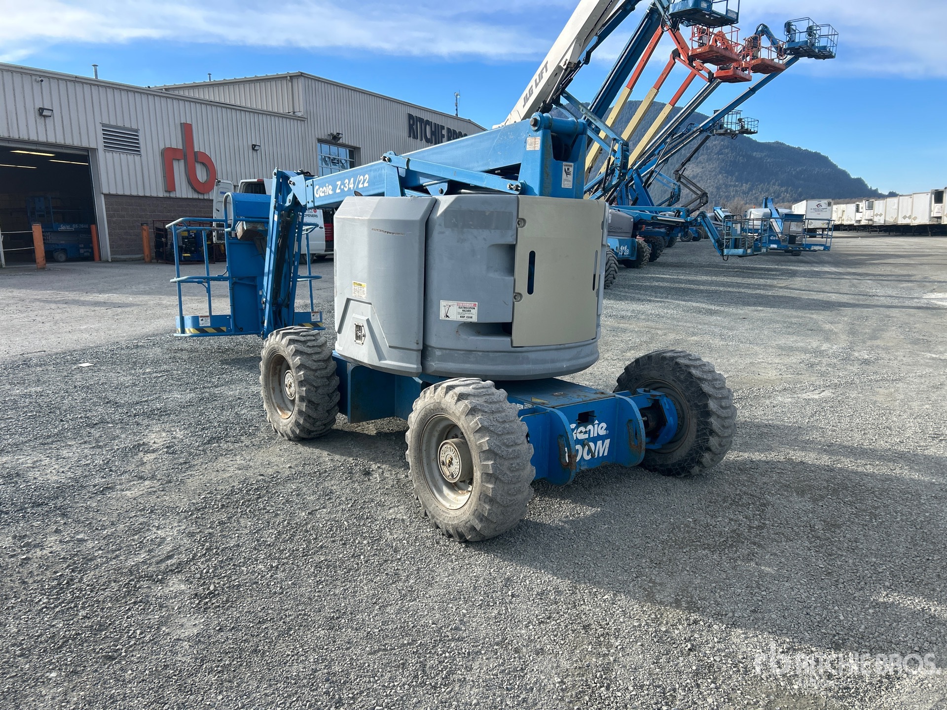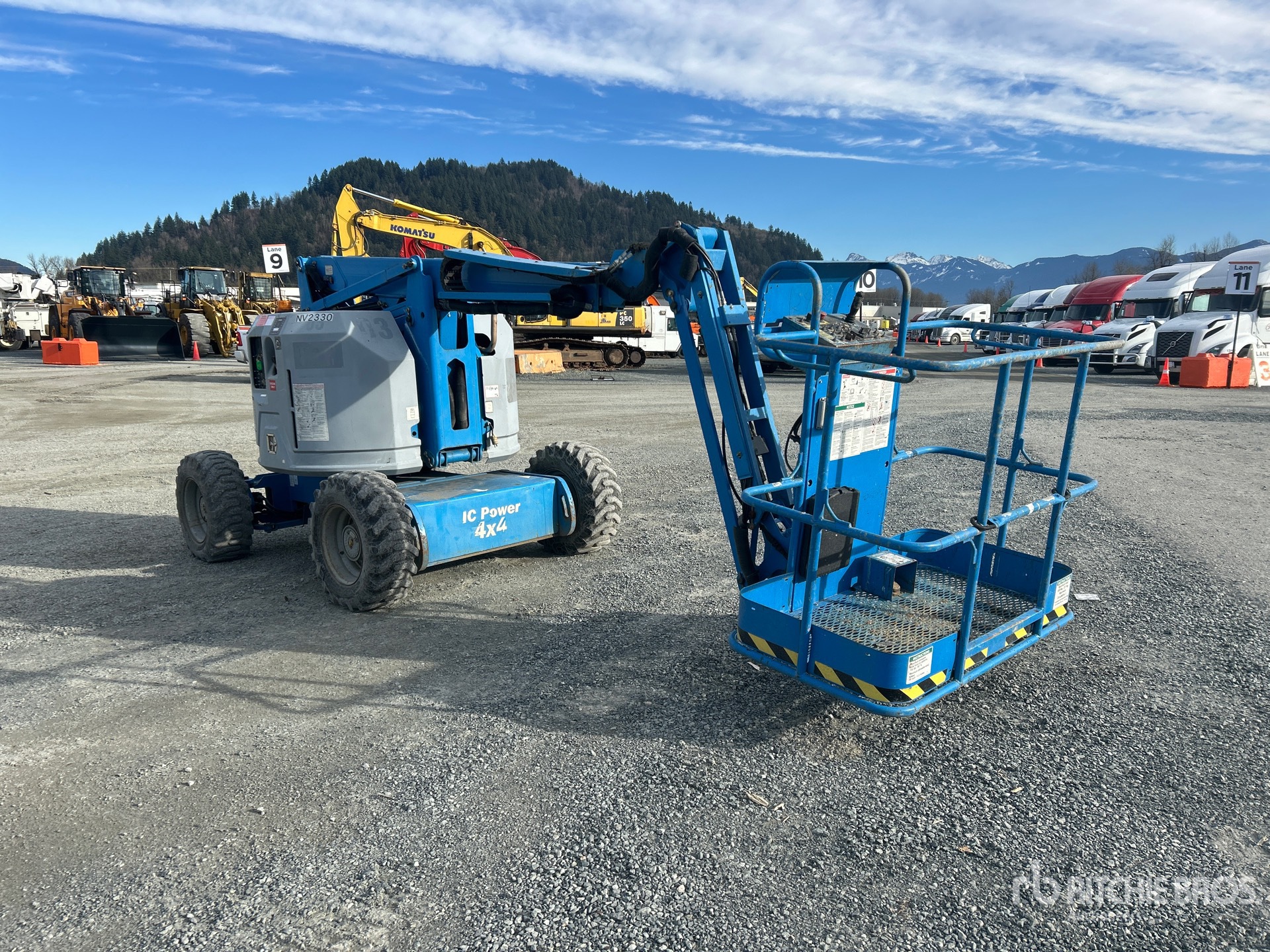 Hauteur de plateforme maximale de 10,6 m (34 pi 9 po), capacité de charge maximale de 227 kg (500 lb), flèche, alimentation électrique de la plateforme, moteur Kubota DF752-E2 à 3 cylindres et double carburant, pneus NHS 10-16,5