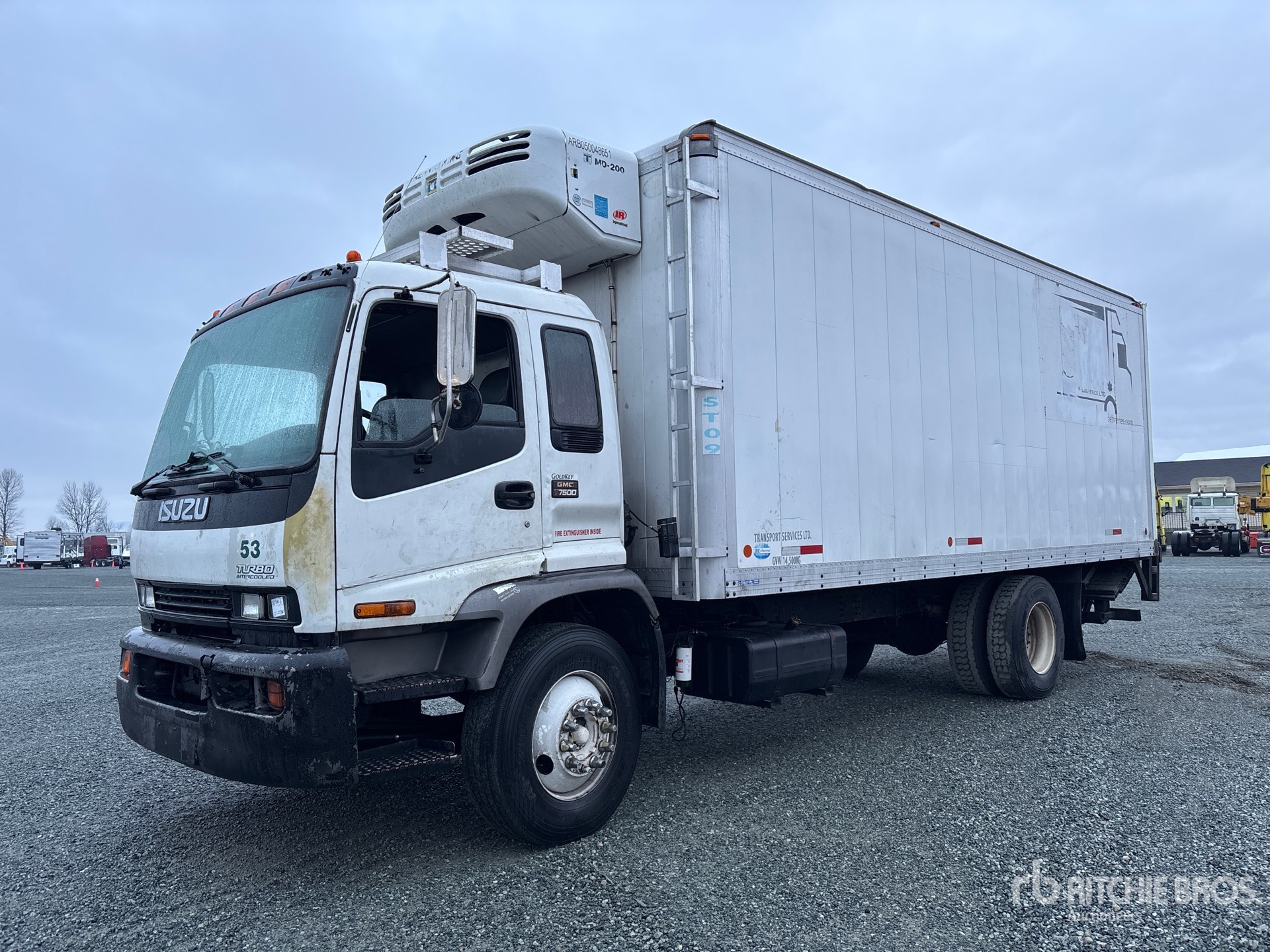 Moteur diesel Isuzu 6HK1X 475 cid 234 ch, homologué EPA US 2006, conforme aux normes CARB, transmission automatique, essieu avant 12 000 lb, essieu arrière 21 000 lb, PTAC 33 000 lb, pneus 11R22.5, suspension à ressorts, empattement 198 po, groupe frigorifique Thermo King MD-200, caisse Minoru 22 pi x 102 po de large x 98 po de hauteur, rampe d'accès