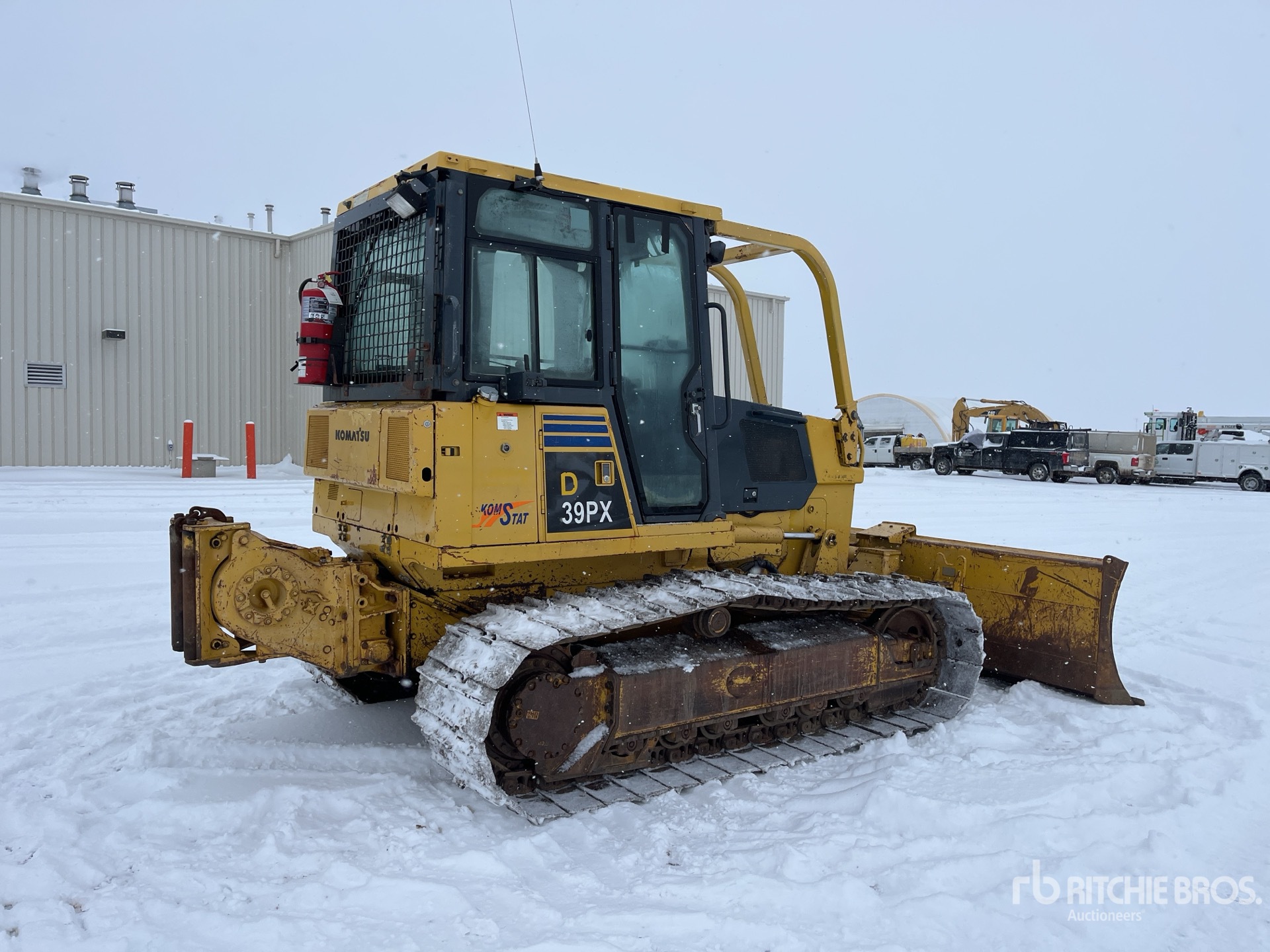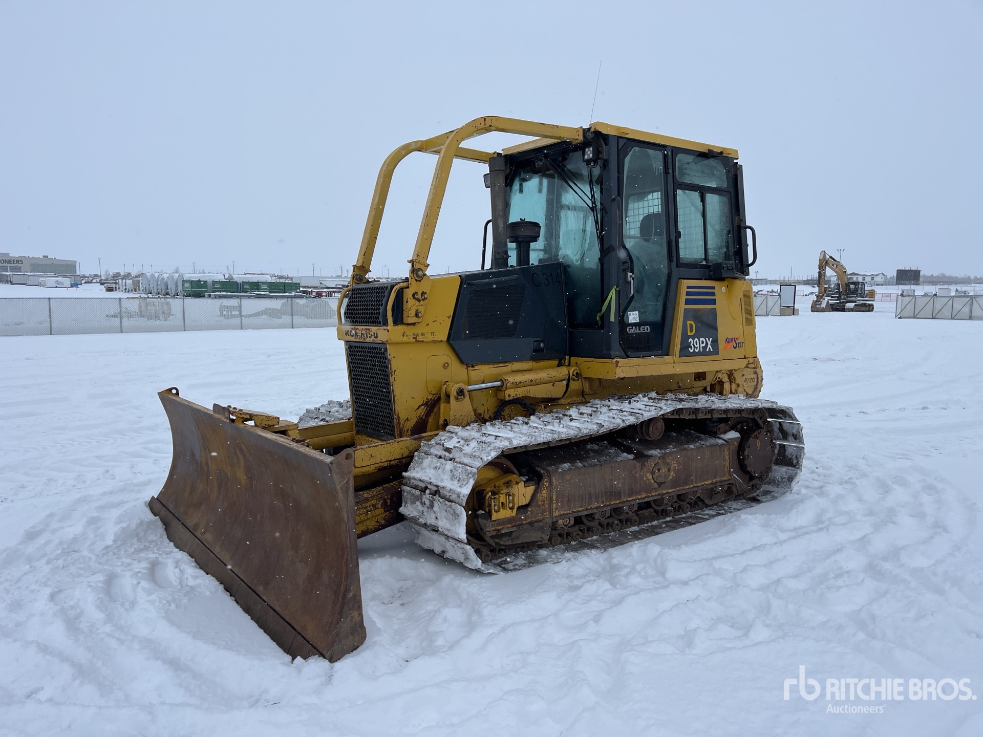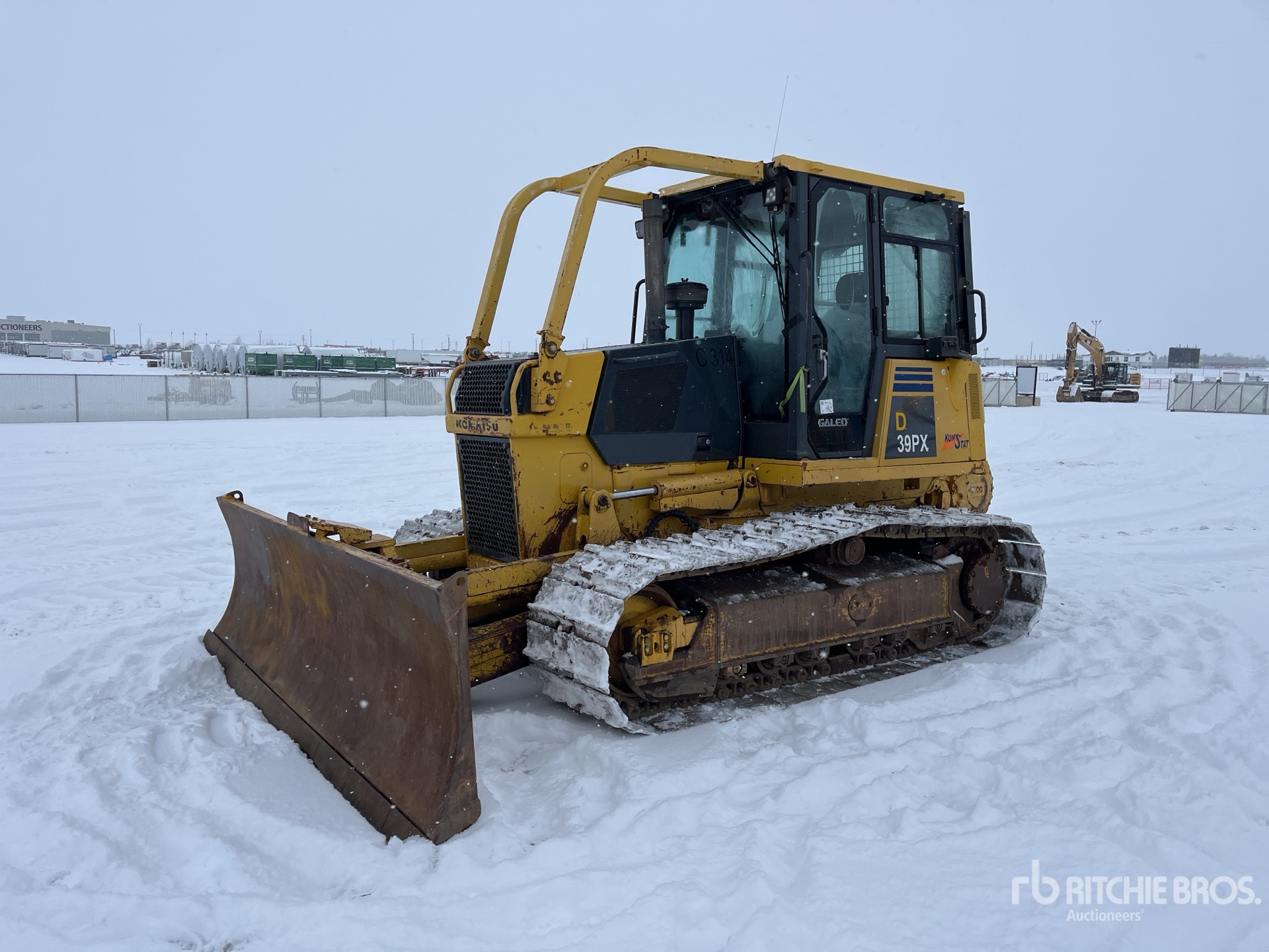 Cabine fermée, climatisation, homologation EPA américaine 2006, conformité CARB, réchauffeur de liquide de refroidissement Eberspacher, balais, lame PAT de 335 cm de large, patins de chenille à crampon simple de 63 cm, treuil Allied W3C