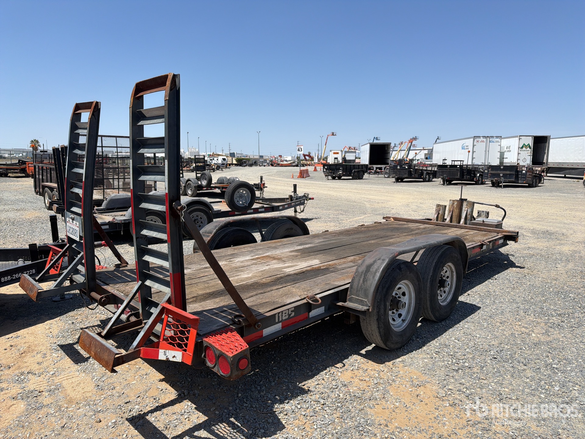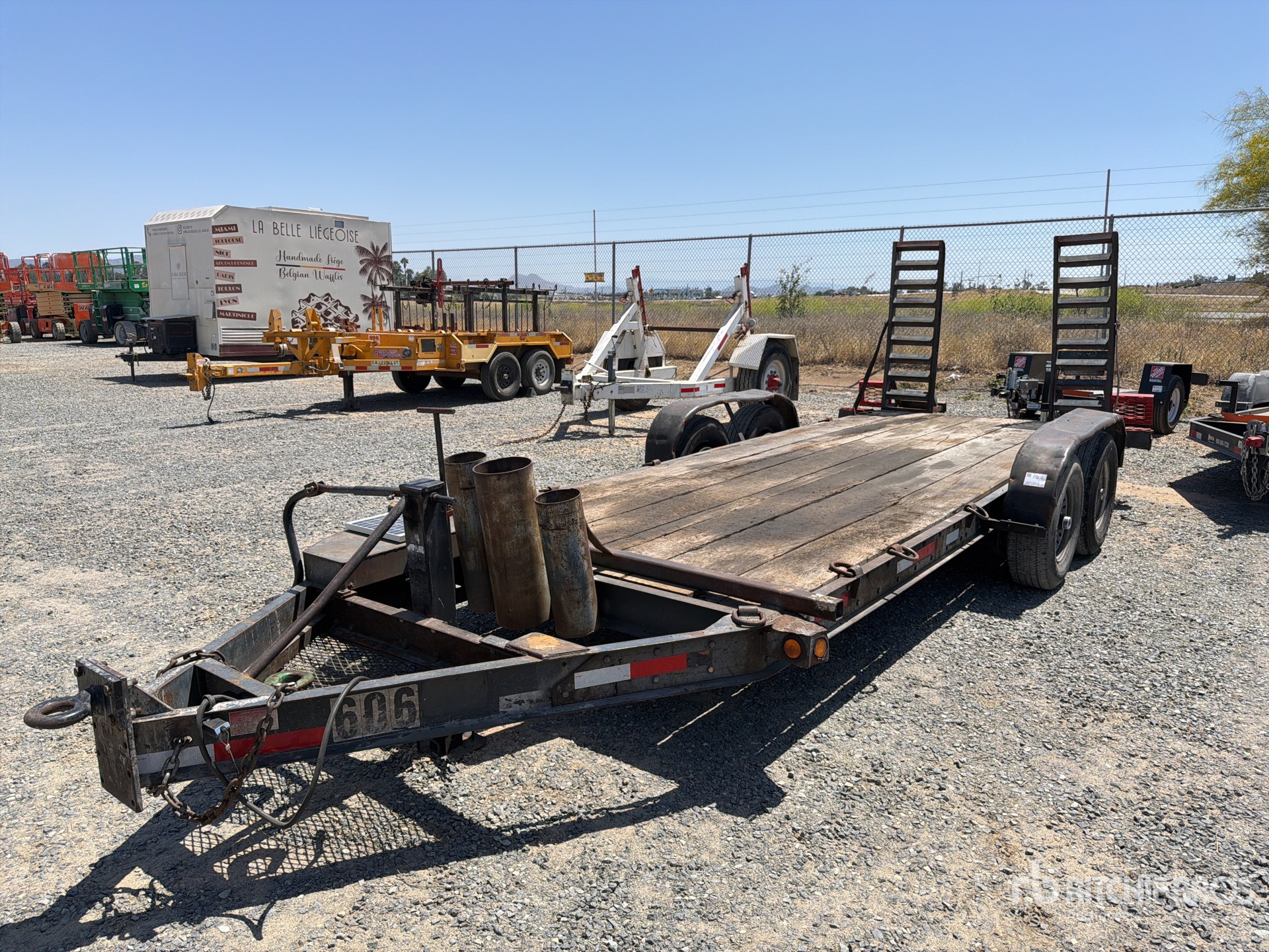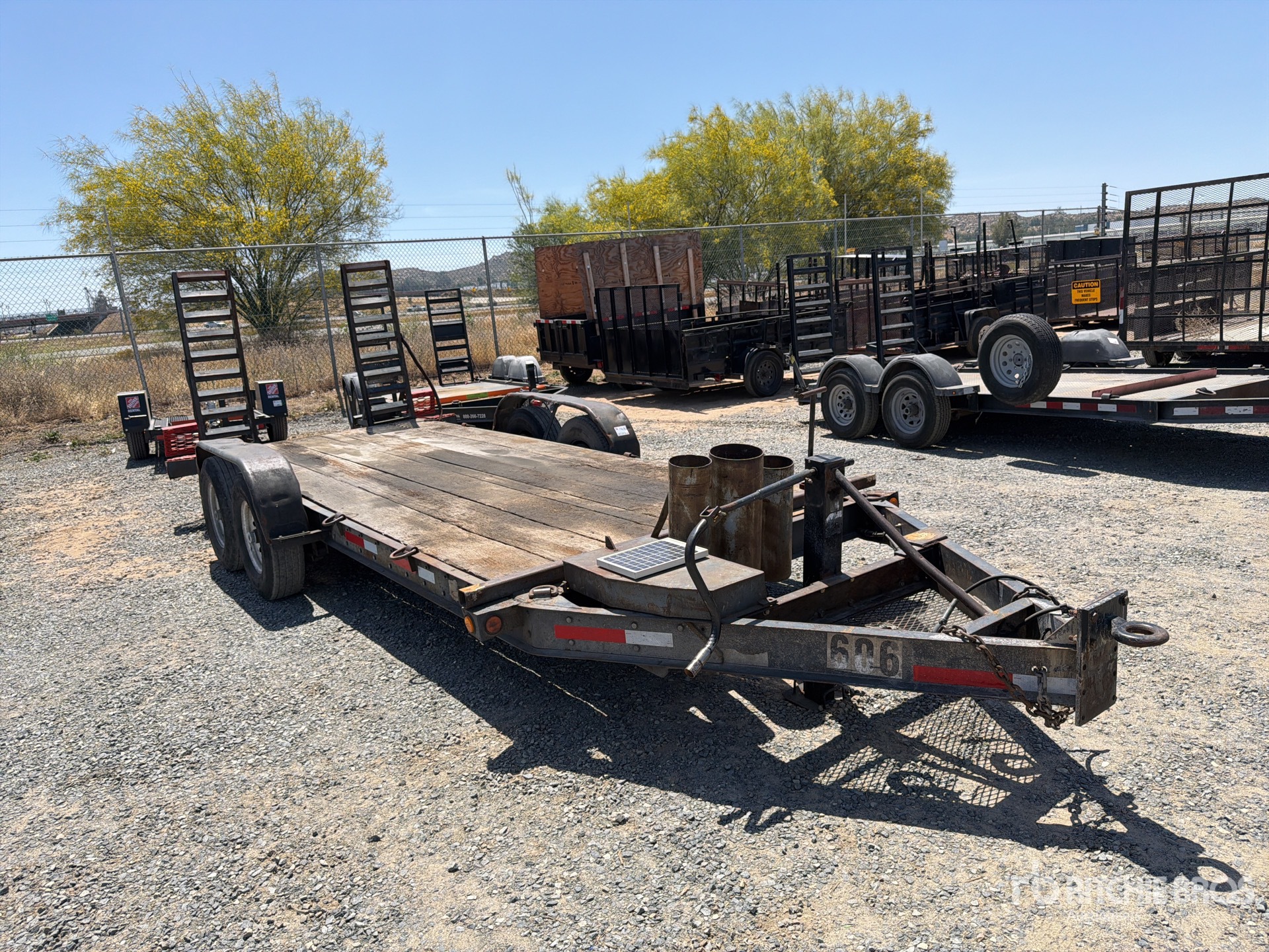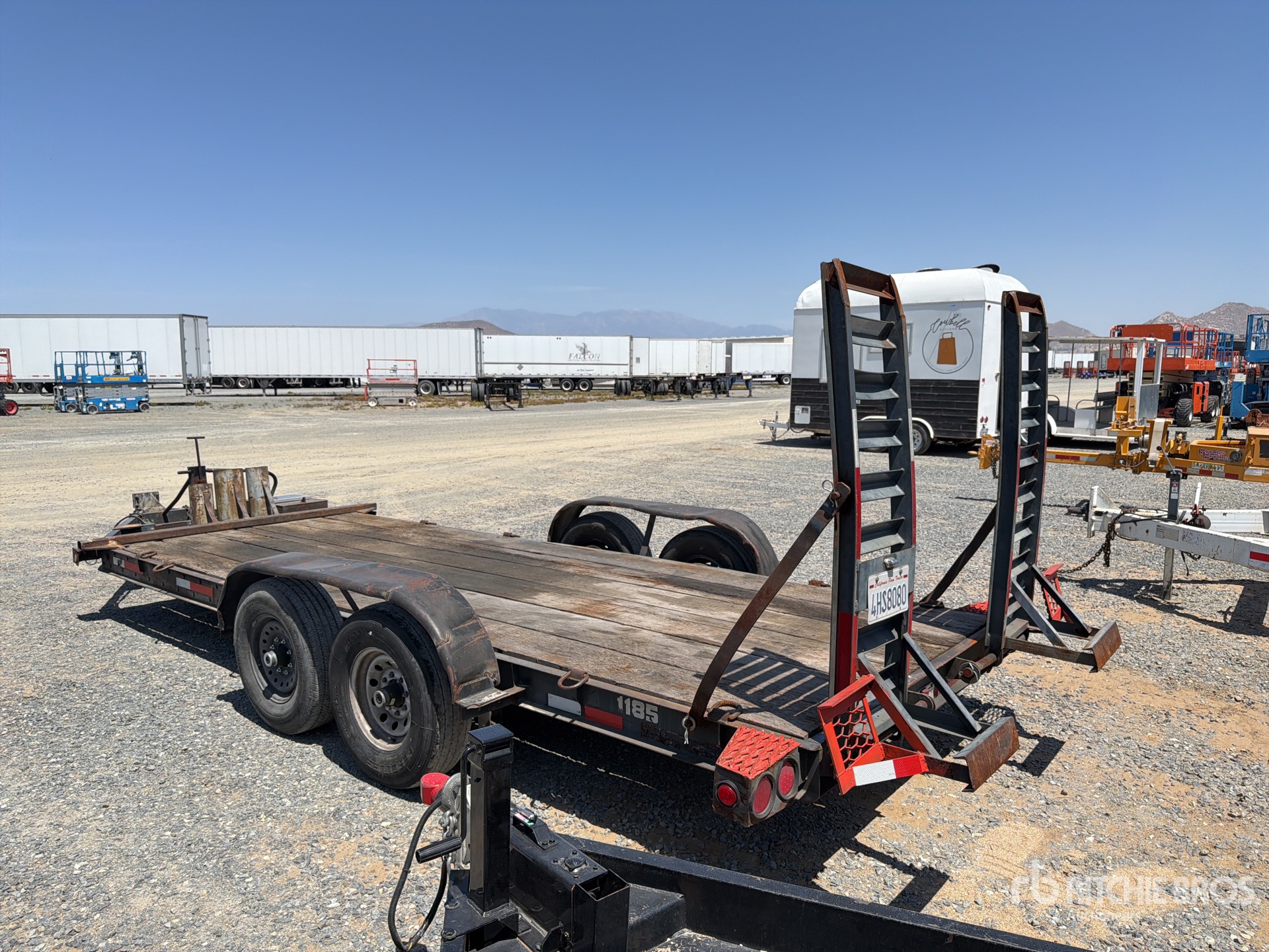 Attelage à anneau Lunette, suspension à ressorts, freins électriques, plateau principal de 5,33 m, largeur utile du plateau de 1,85 m, largeur totale du plateau de 1,98 m, rampes assistées par ressorts, plancher en bois, pneus 235/85R16