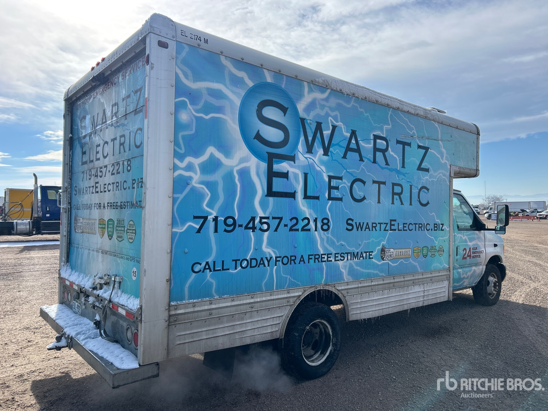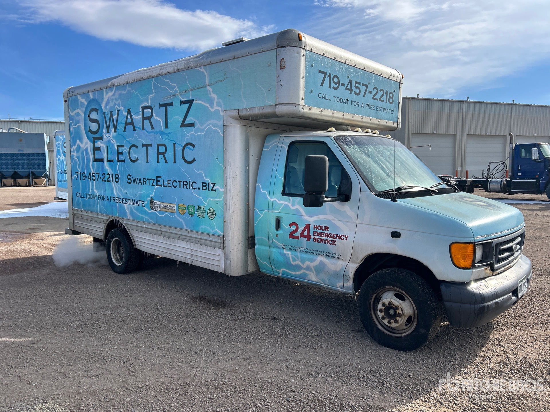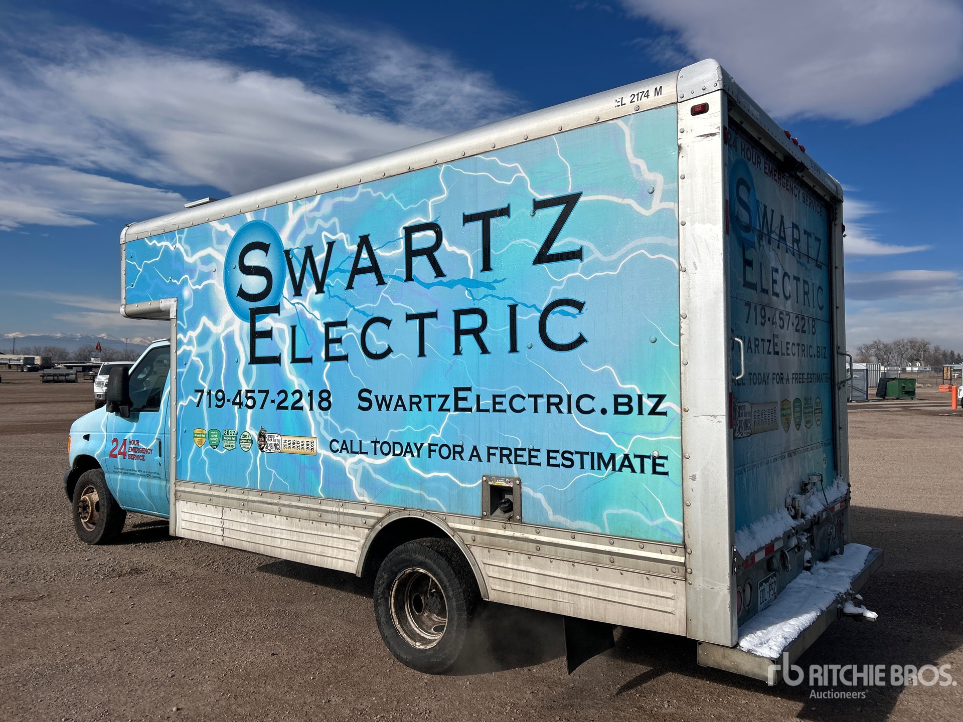 Ford Econoline, moteur à essence 6,8 L, homologation EPA américaine 2007, 768 heures moteur, transmission automatique, essieu avant 2 087 kg, essieux arrière 4 280 kg, PTAC 6 375 kg, pneus 225/75R16.5, suspension à ressorts, empattement 4,47 m, dimensions de la carrosserie : 4,27 m x 2,44 m x 2,08 m (largeur x hauteur).
