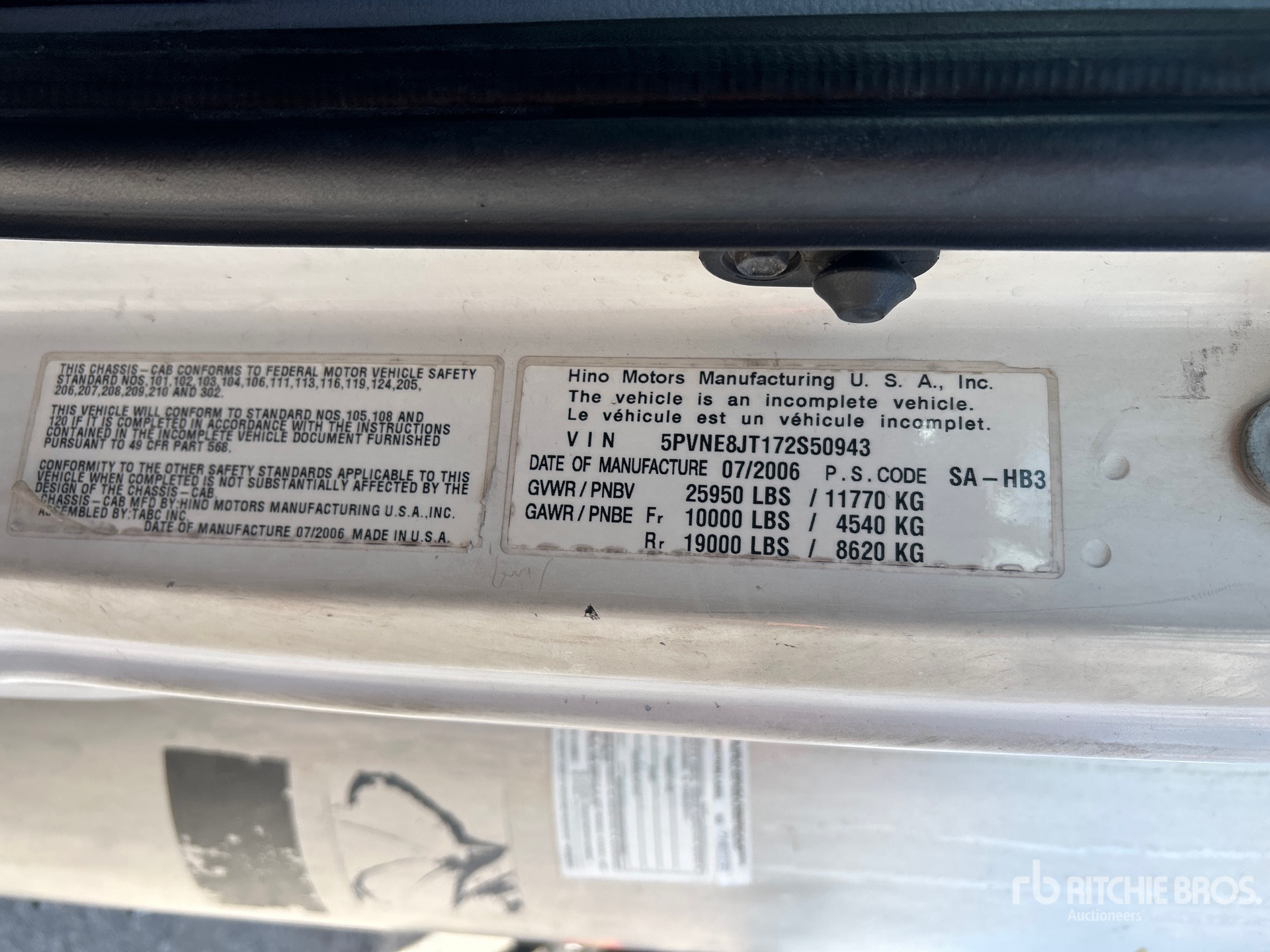 Les Informations détaillées de l’équipement sont d’une portée limitée, et les Encans Ritchie Bros. n’ont inspecté aucun autre aspect ou composant de l’équipement que ceux présentés expressément. Sauf indication précise, nous n’offrons aucune représentation ou garantie, officielle ou implicite, sur l’équipement ou ses composants, sans aucune limite de représentation ou de garantie en ce qui concerne la fonctionnalité, la conformité à toute norme de sécurité ou l’exigence de toute autorité ou agence de régulation en vigueur, l’adaptation à un quelconque usage, ou la valeur commerciale. Il vous est fortement conseillé d’effectuer votre propre inspection détaillée de l’équipement avant d’enchérir.