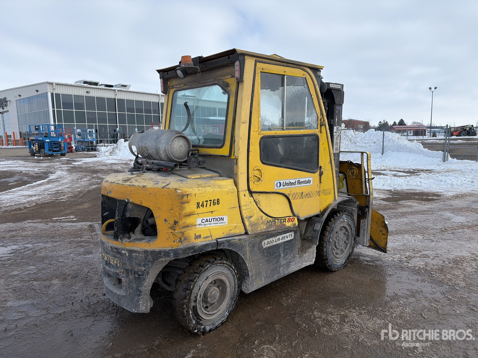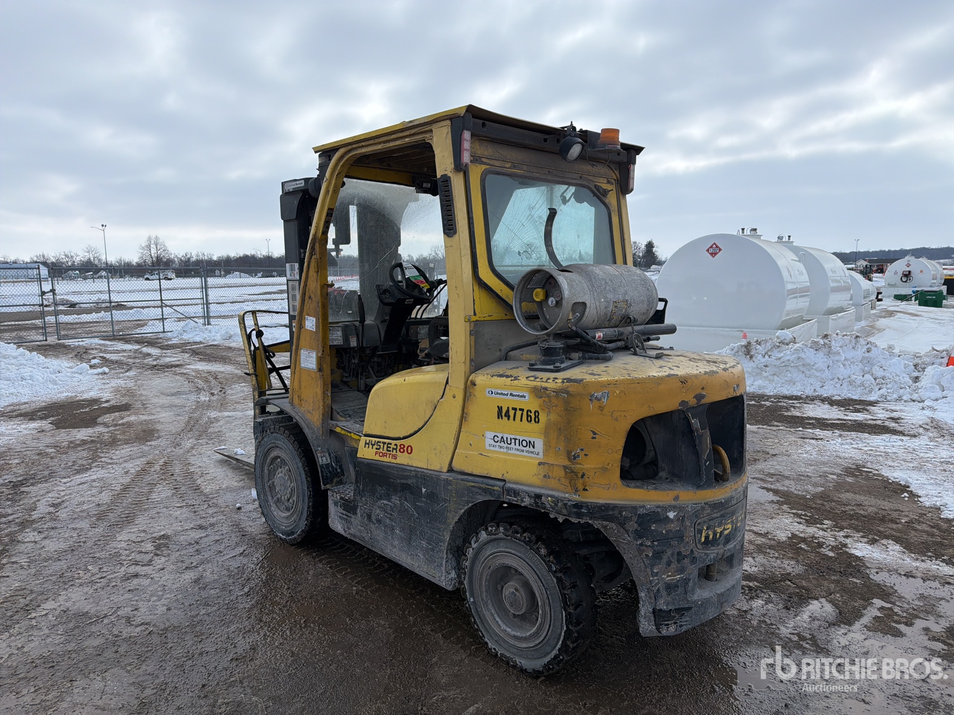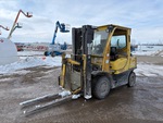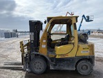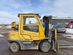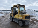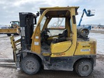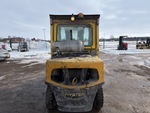 Cabine fermée, mât à 3 sections, hauteur de levage maximale de 441,7 cm, hauteur de mât abaissée de 216 cm, fourches de 142 cm, déport latéral, positionneur de fourches, pneus pleins, conforme à la norme Tier 3, moteur General Motors Vortec 6 cylindres 180 ch 4,3 L GPL