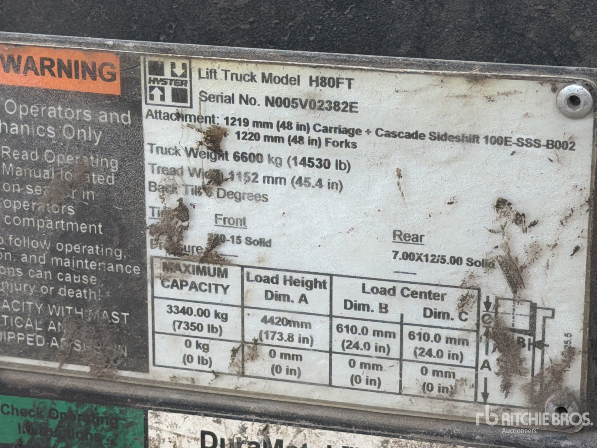 Les Informations détaillées de l’équipement sont d’une portée limitée, et les Encans Ritchie Bros. n’ont inspecté aucun autre aspect ou composant de l’équipement que ceux présentés expressément. Sauf indication précise, nous n’offrons aucune représentation ou garantie, officielle ou implicite, sur l’équipement ou ses composants, sans aucune limite de représentation ou de garantie en ce qui concerne la fonctionnalité, la conformité à toute norme de sécurité ou l’exigence de toute autorité ou agence de régulation en vigueur, l’adaptation à un quelconque usage, ou la valeur commerciale. Il vous est fortement conseillé d’effectuer votre propre inspection détaillée de l’équipement avant d’enchérir.