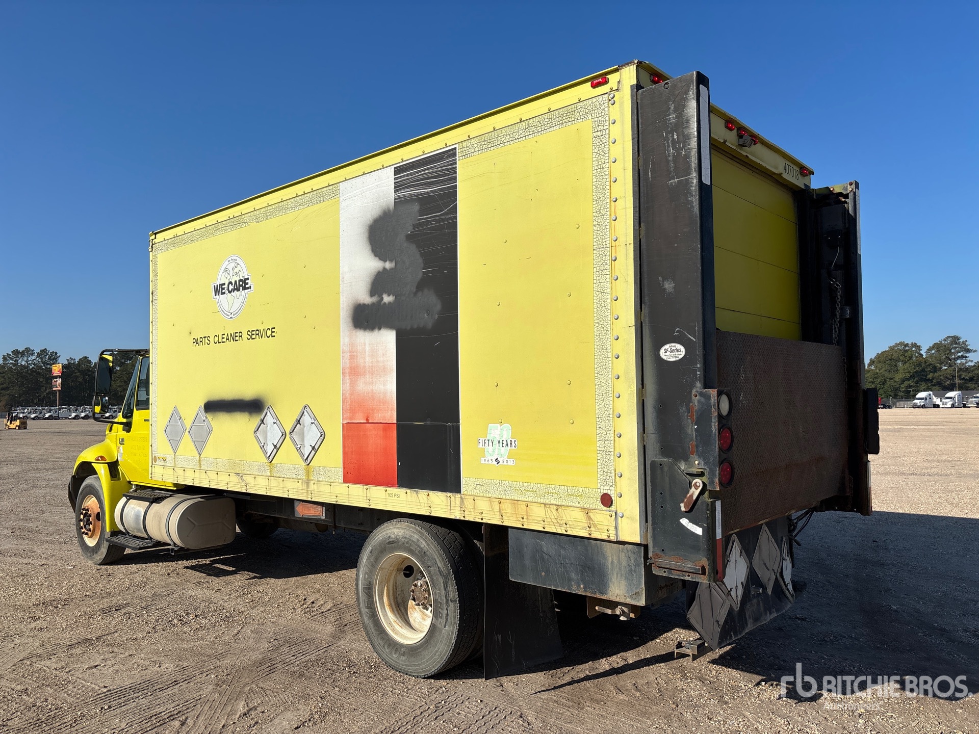 Moteur diesel International DT466 à 6 cylindres, homologué EPA (États-Unis) 2006, 18 505 heures de fonctionnement, boîte de vitesses manuelle Eaton Fuller, huile moteur 11R22.5, suspension à ressorts, empattement de 5,54 m (218 pouces), châssis Marion de 5,49 m (18 pieds) de long, 2,59 m (102 pouces) de large et 2,31 m (91 po) de haut, hayon élévateur