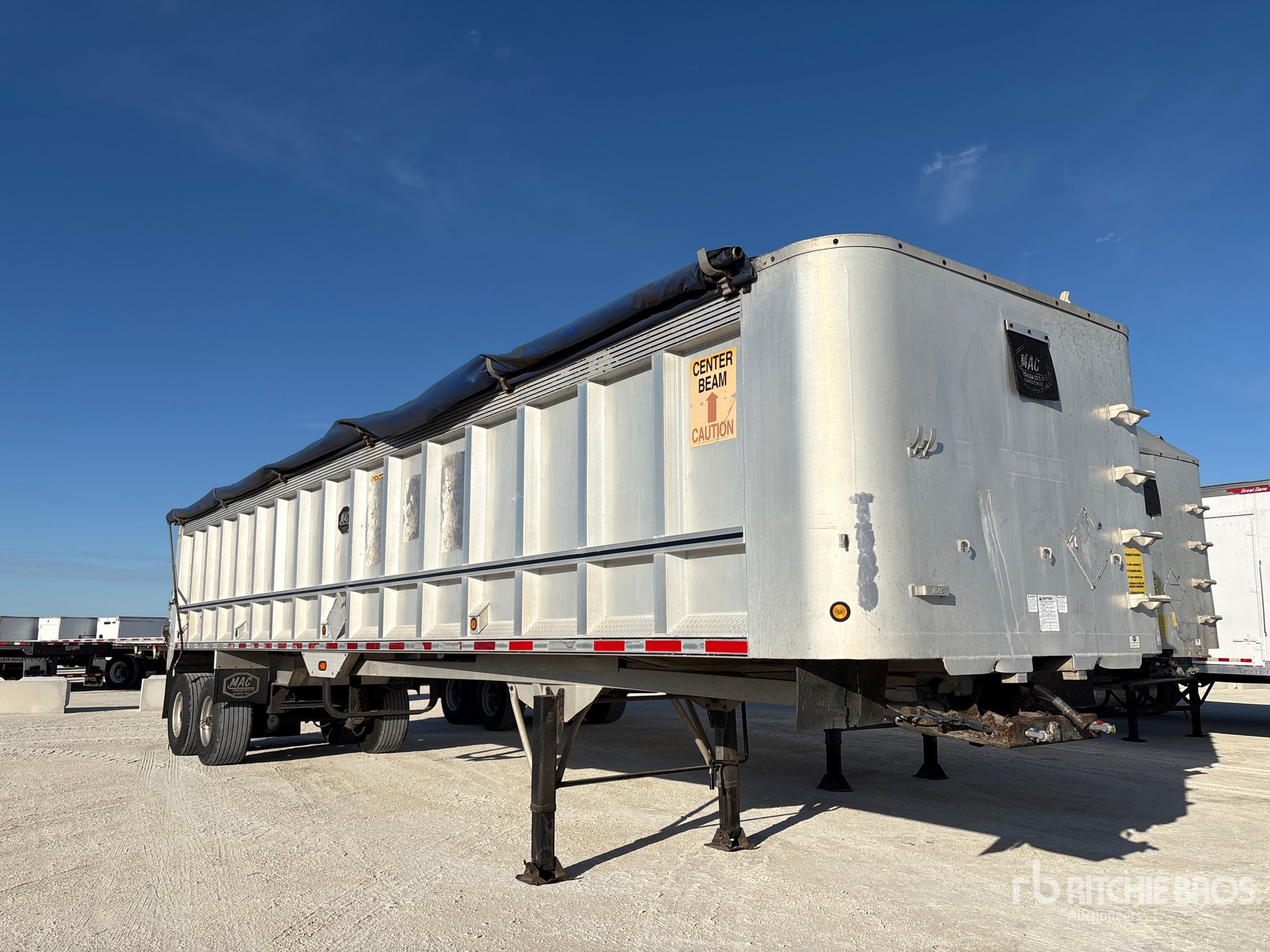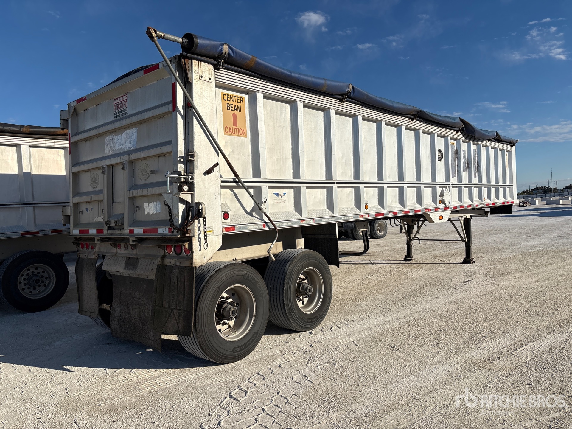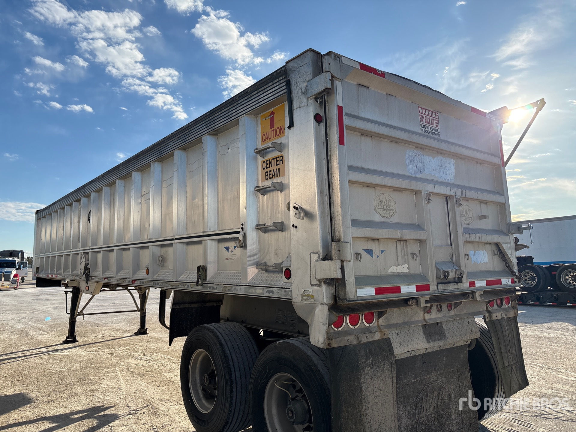 Cadre en aluminium, suspension pneumatique, caisse de 12,2 m (40 pi), parois latérales de 1,65 m (65 po), caisse en aluminium, bâche à enroulement manuel, hayon battant, pneus Super Single 455/55T-22.5, PTAC de 36 300 kg (80 000 lb)