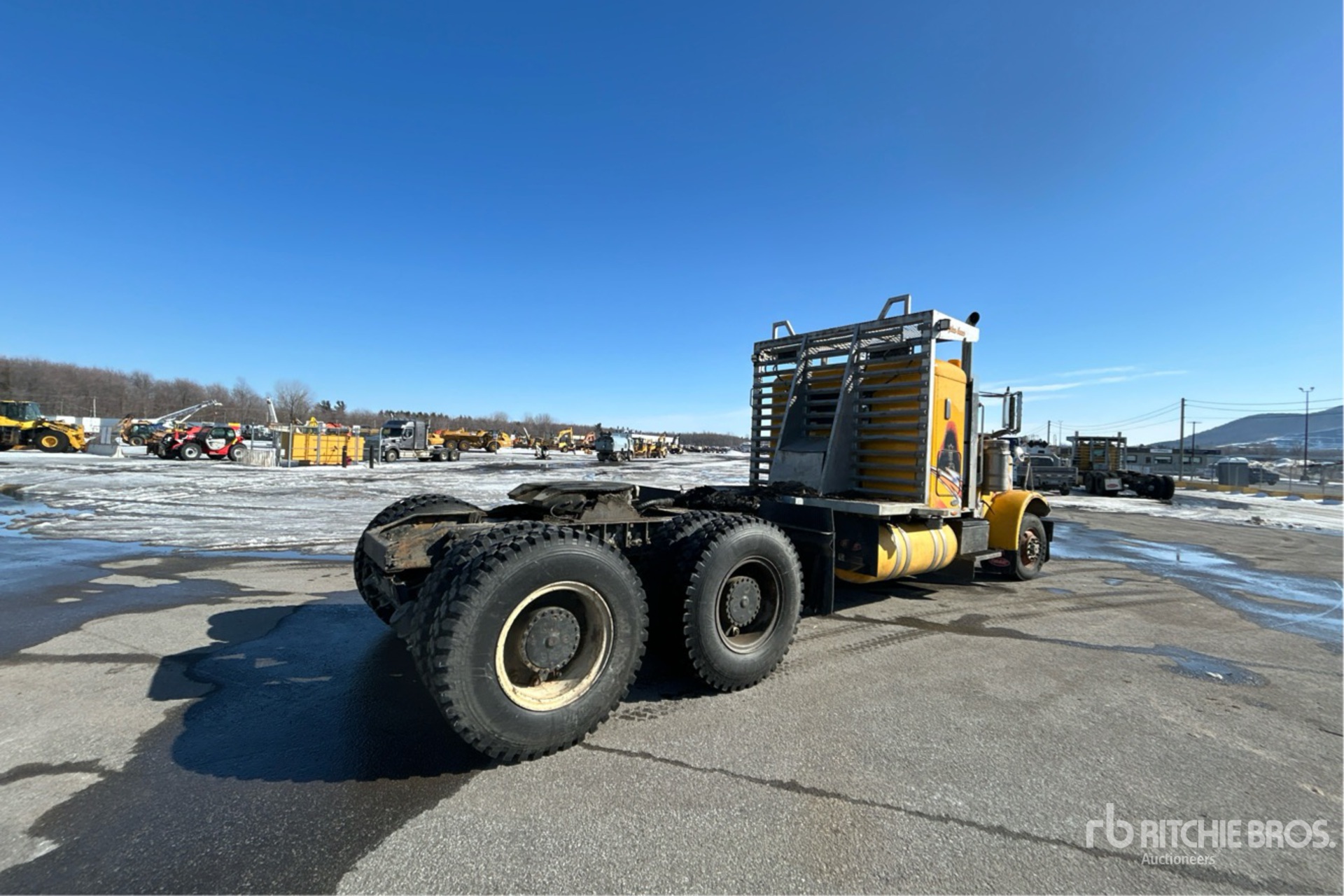 Moteur Cummins ISX 600 ch, transmission manuelle Eaton Fuller à 18 rapports, essieu avant de 7 257 kg, essieu arrière de 27 162 kg, frein moteur, double blocage de différentiel, cabine couchette à toit plat de 91,4 cm, empattement de 6 911 mm, suspension à balancier, roues avant en aluminium, pneus avant 385/65R22.5, pneus arrière 12.00R24, porte-bagages de cabine
