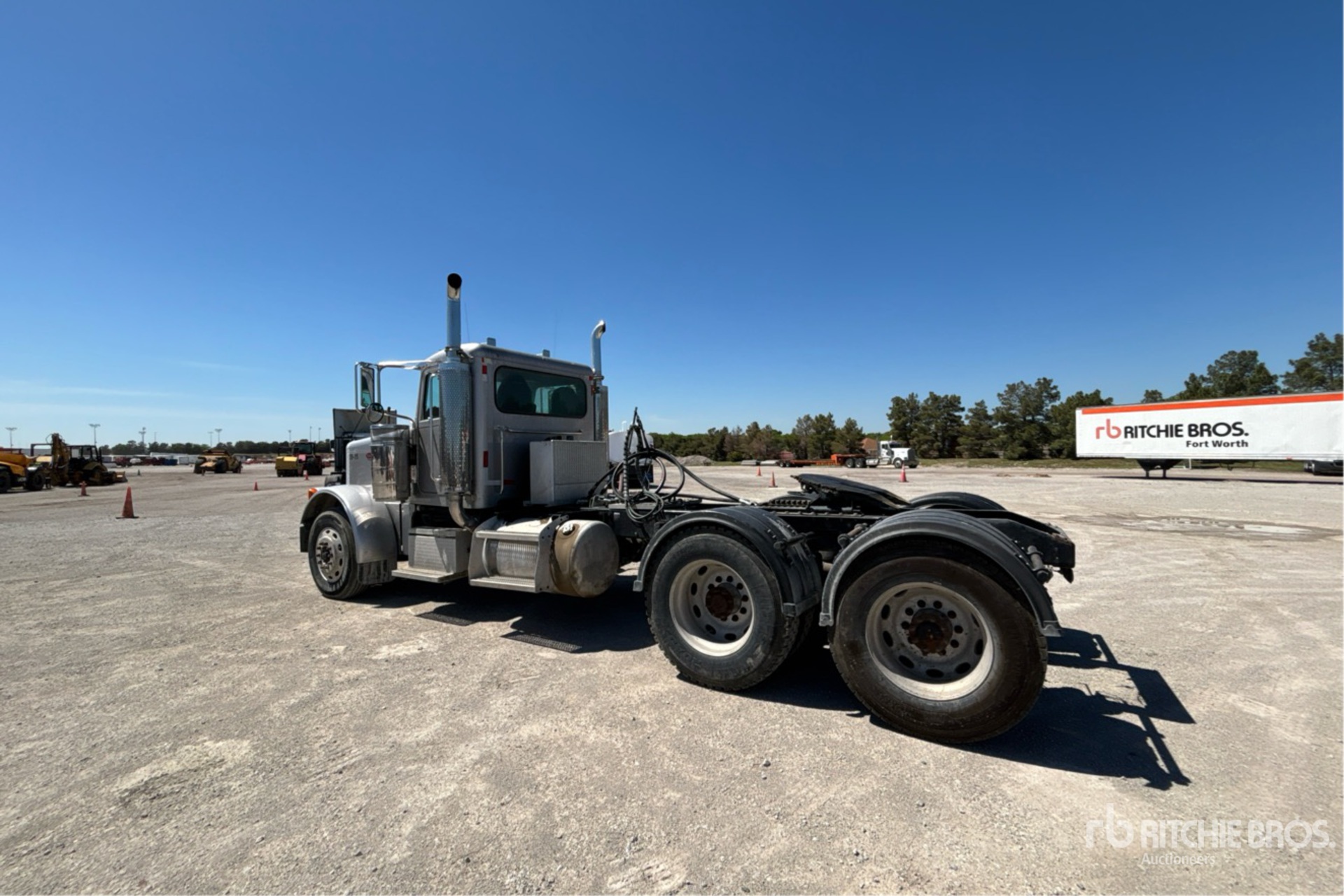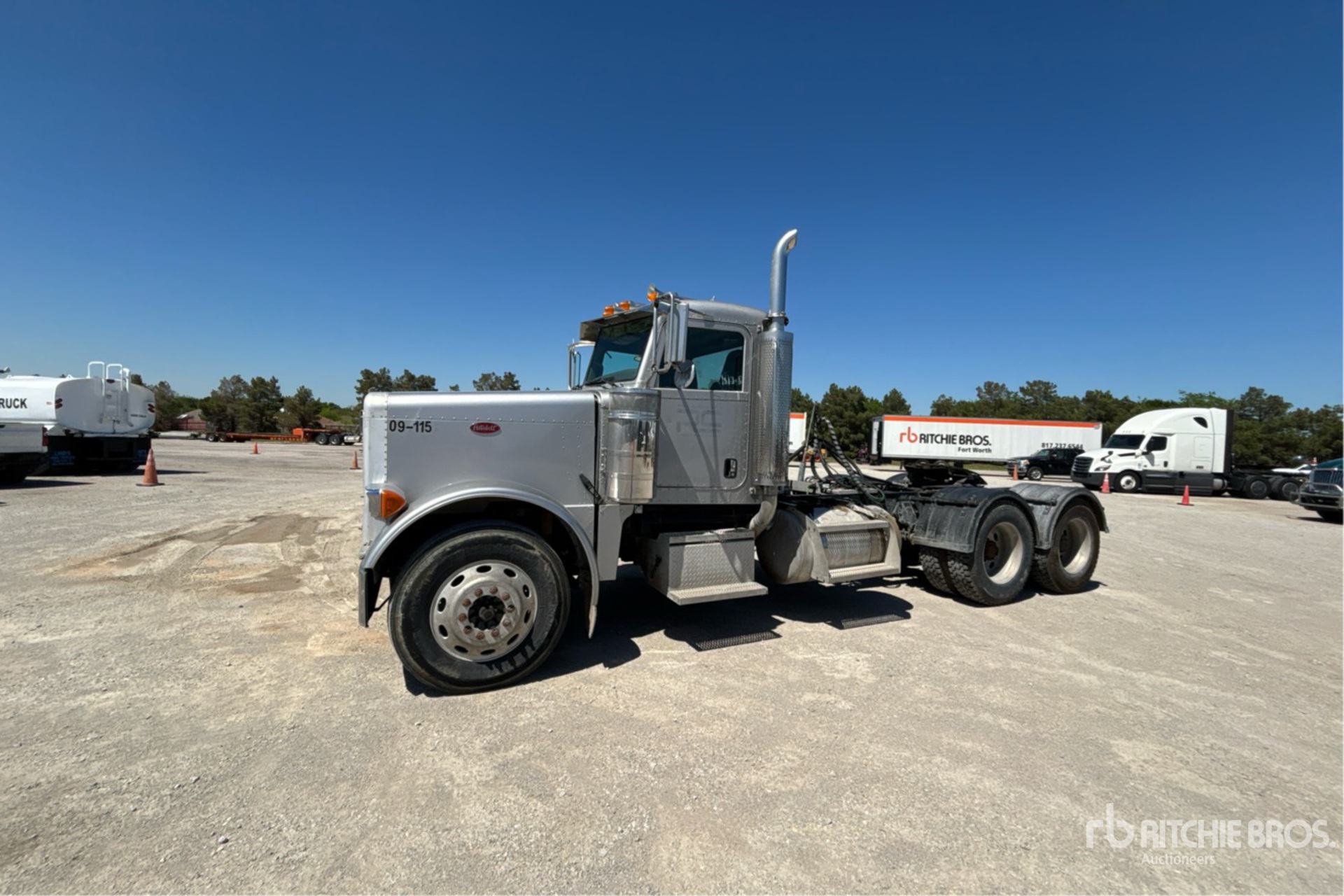 Moteur Caterpillar C15, 34 233 heures de fonctionnement, boîte de vitesses manuelle Eaton Fuller, essieu avant de 5 443 kg, essieu arrière de 16 332 kg, PTAC de 21 772 kg, frein moteur, empattement de 5,69 m, suspension pneumatique, jantes extérieures en aluminium, pneus 11R24.5, système hydraulique, sellette d'attelage coulissante pneumatique, double réservoir de carburant