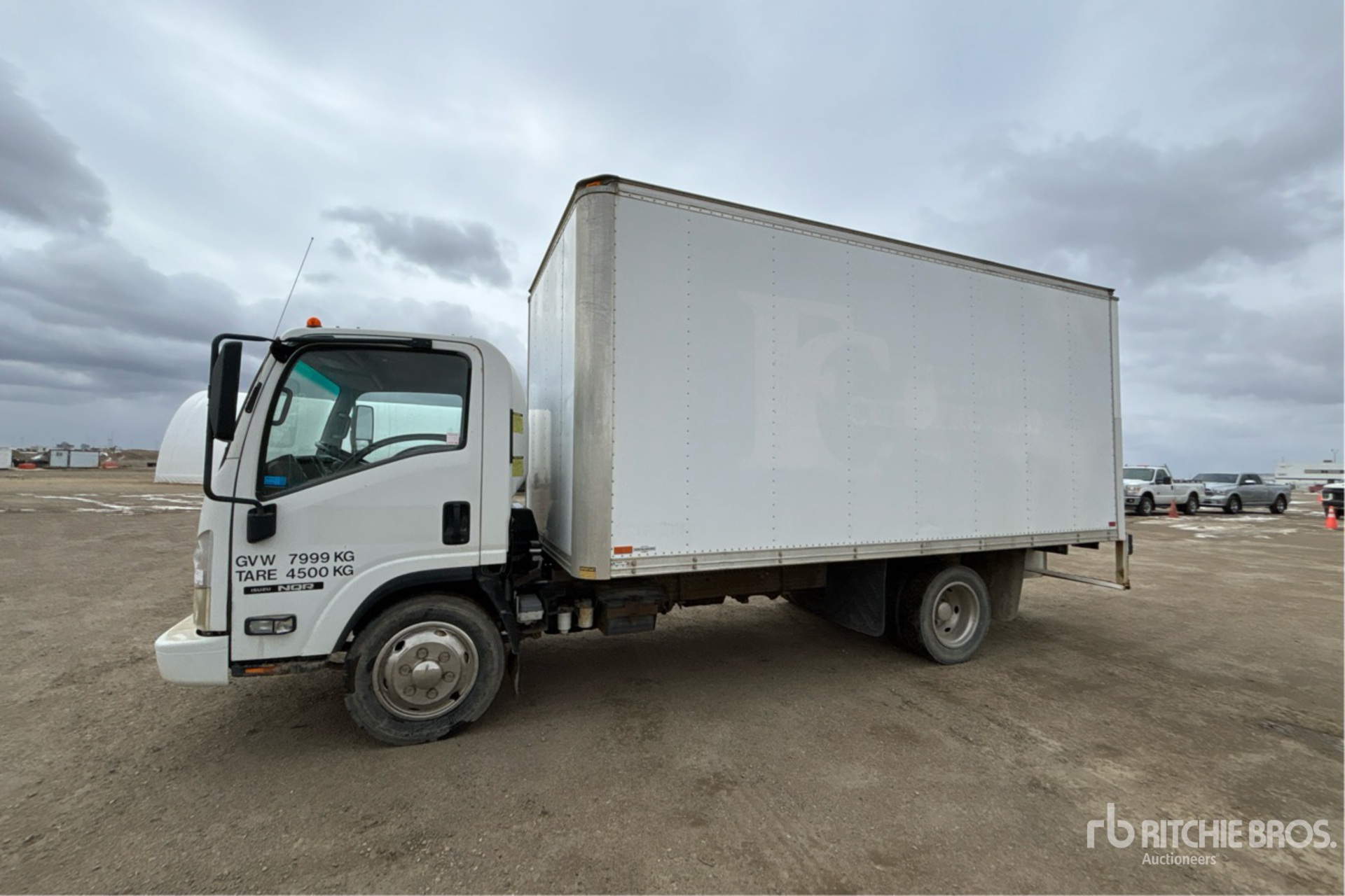 Camion Isuzu 4HK1TC, moteur diesel 4 cylindres 5,2 L 200 ch, homologué EPA (États-Unis) 2007, conforme aux normes CARB, frein moteur, transmission automatique, essieu avant 3 100 kg, essieux arrière 5 850 kg, PTAC 8 120 kg, pneus 225/70R19.5, suspension à ressorts, empattement 3,84 m, benne Thermo King 4,88 m x 2,44 m x 2,13 m, rampe d'accès