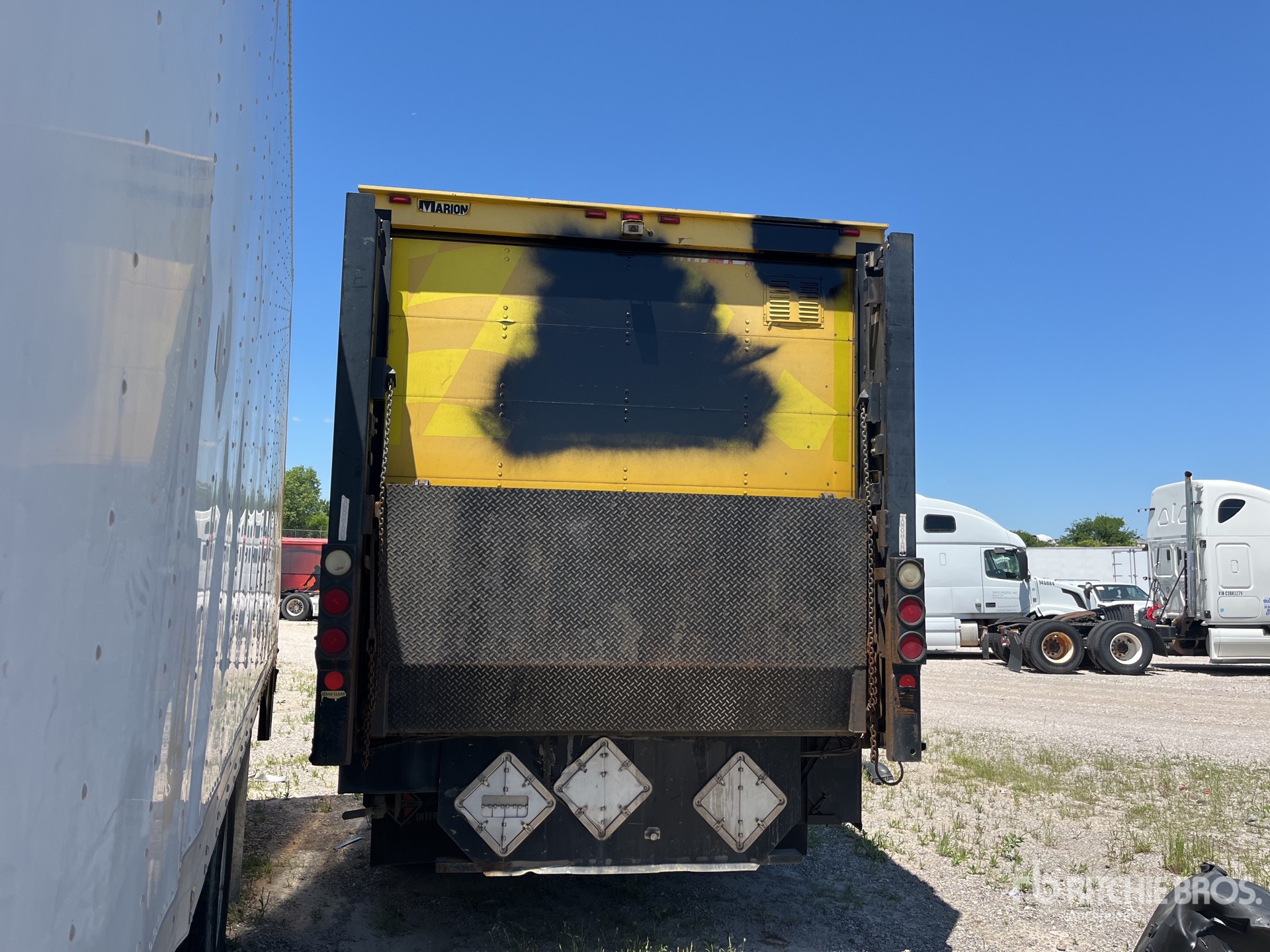 Moteur diesel, transmission manuelle Eaton Fuller, essieu avant de 5443 kg, essieux arrière de 9525 kg, PTAC de 1499 kg, jantes en aluminium, pneus 11R22.5, suspension à ressorts, empattement de 554 mm, carrosserie Marion de 5,49 m x 2,31 m de large x 2,59 m de haut, hayon élévateur