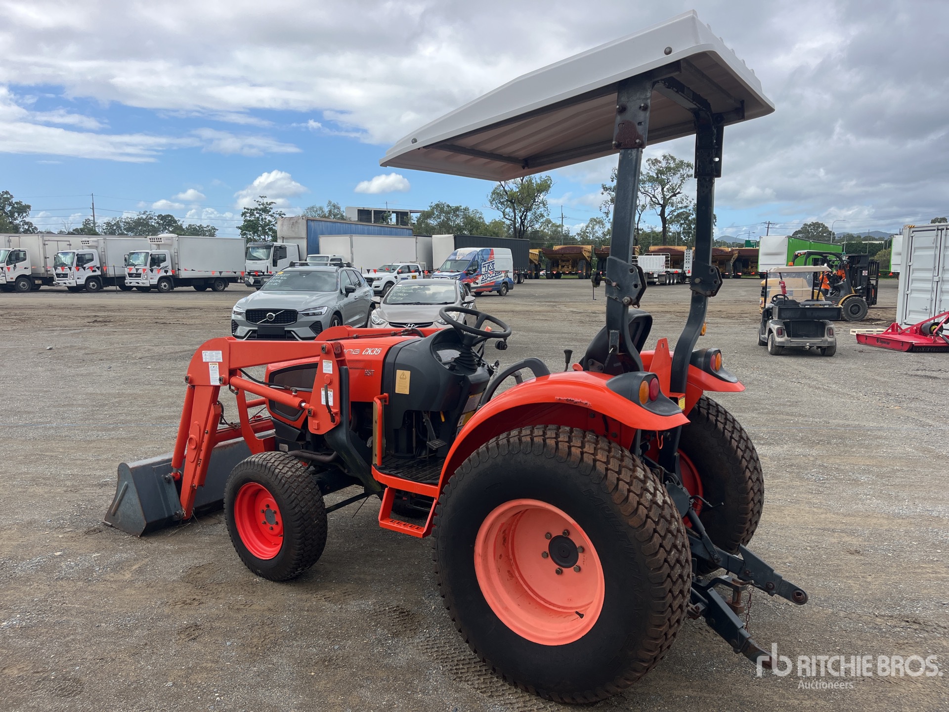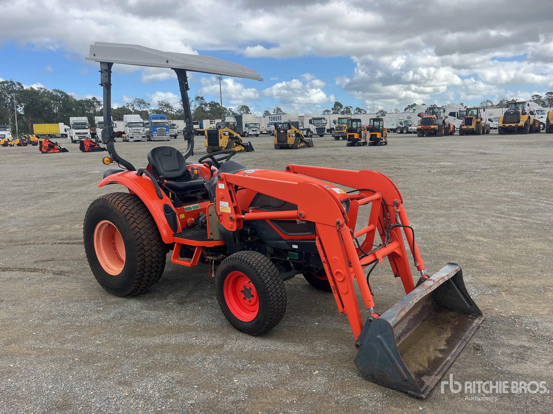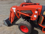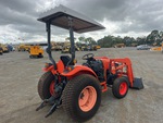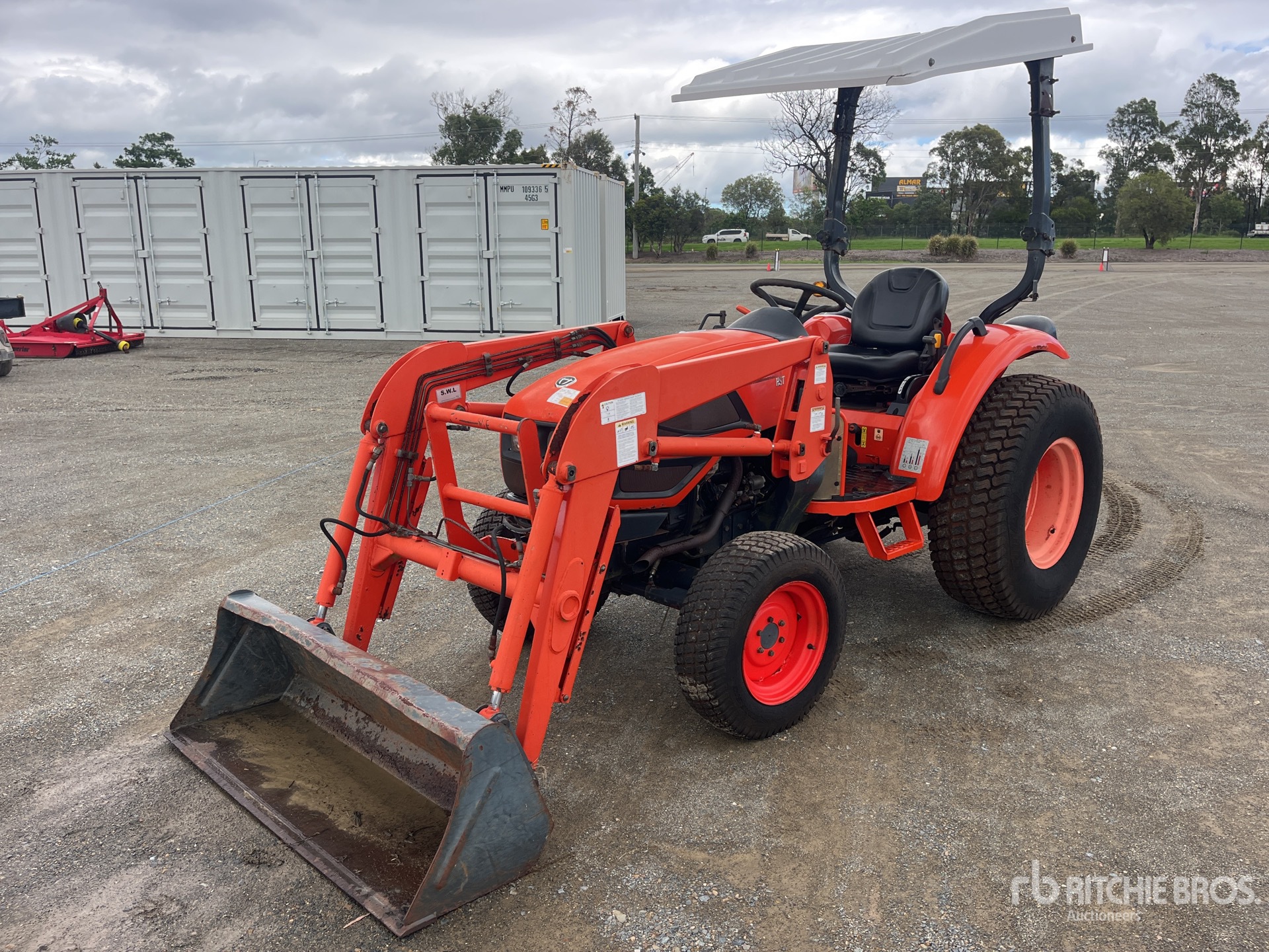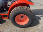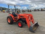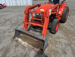 Transmission hydrostatique, inverseur de marche, moteur de 34 ch, homologué EPA 2010 (États-Unis), chargeur Ansung AL25, godet de 1380 mm, 1 distributeur hydraulique arrière, prise de force 540 tr/min, attelage trois points, barre de traction, pneus avant 27x8.50-15, pneus arrière 41x13.00