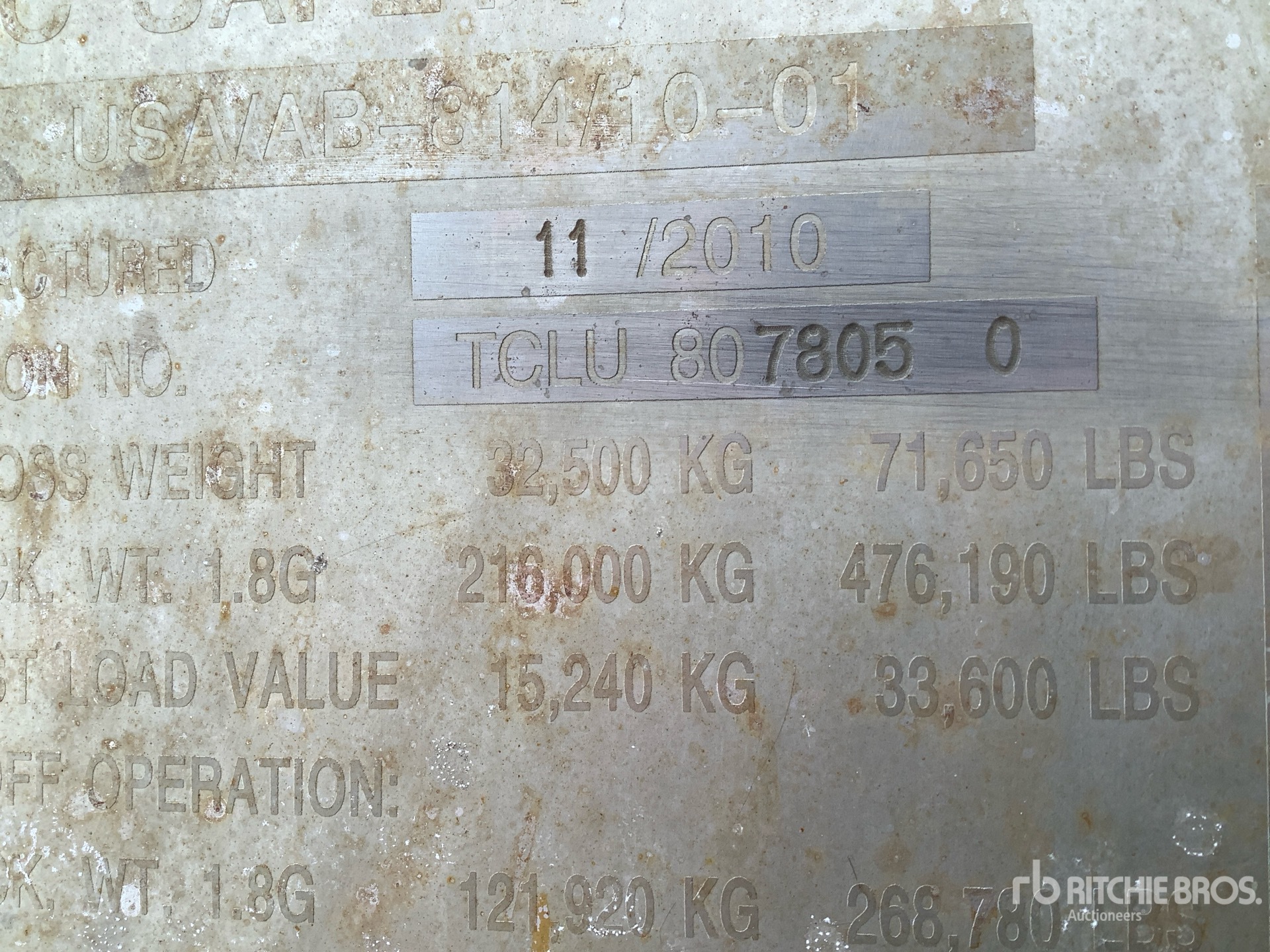 Les Informations détaillées de l’équipement sont d’une portée limitée, et les Encans Ritchie Bros. n’ont inspecté aucun autre aspect ou composant de l’équipement que ceux présentés expressément. Sauf indication précise, nous n’offrons aucune représentation ou garantie, officielle ou implicite, sur l’équipement ou ses composants, sans aucune limite de représentation ou de garantie en ce qui concerne la fonctionnalité, la conformité à toute norme de sécurité ou l’exigence de toute autorité ou agence de régulation en vigueur, l’adaptation à un quelconque usage, ou la valeur commerciale. Il vous est fortement conseillé d’effectuer votre propre inspection détaillée de l’équipement avant d’enchérir.