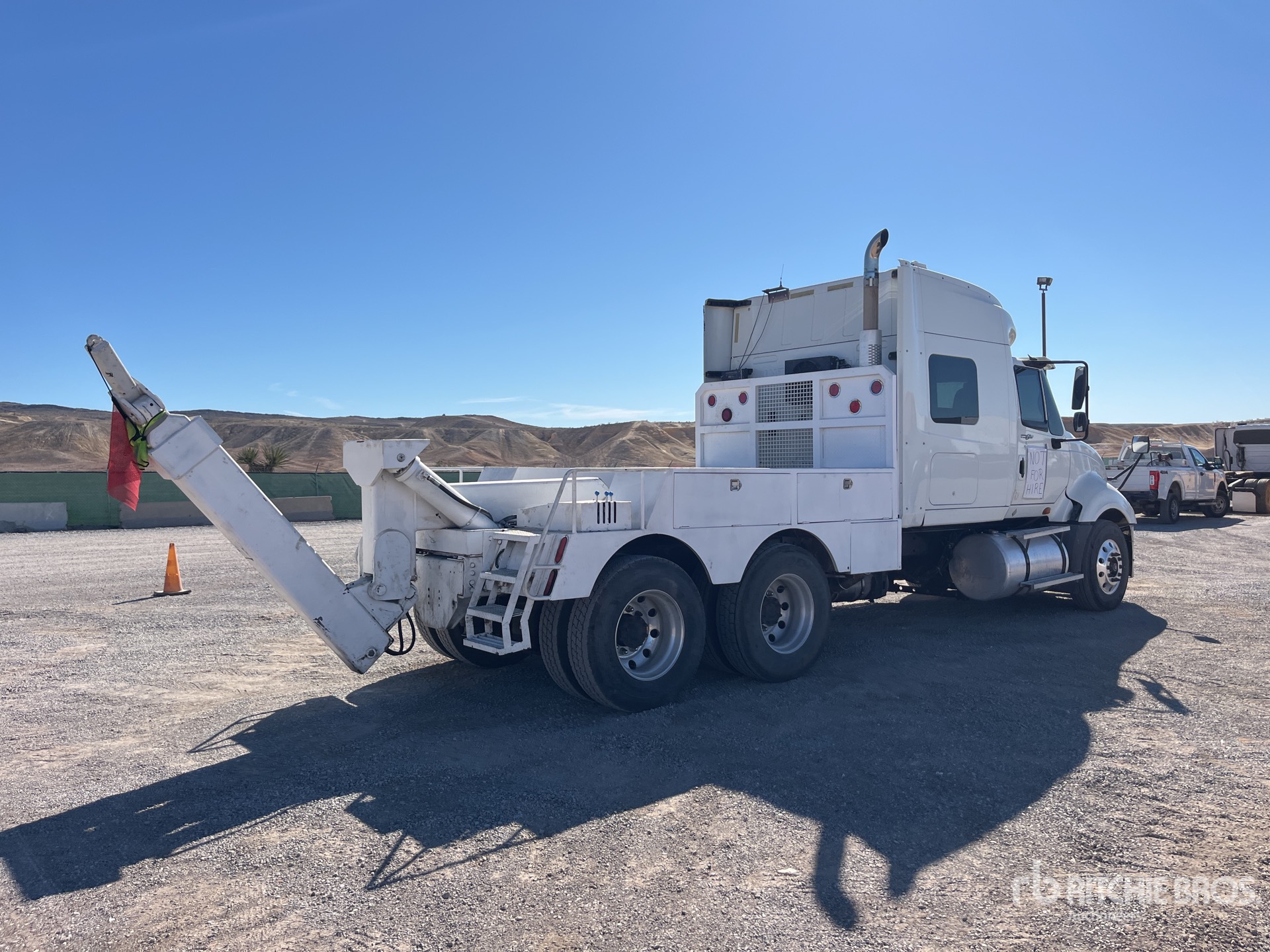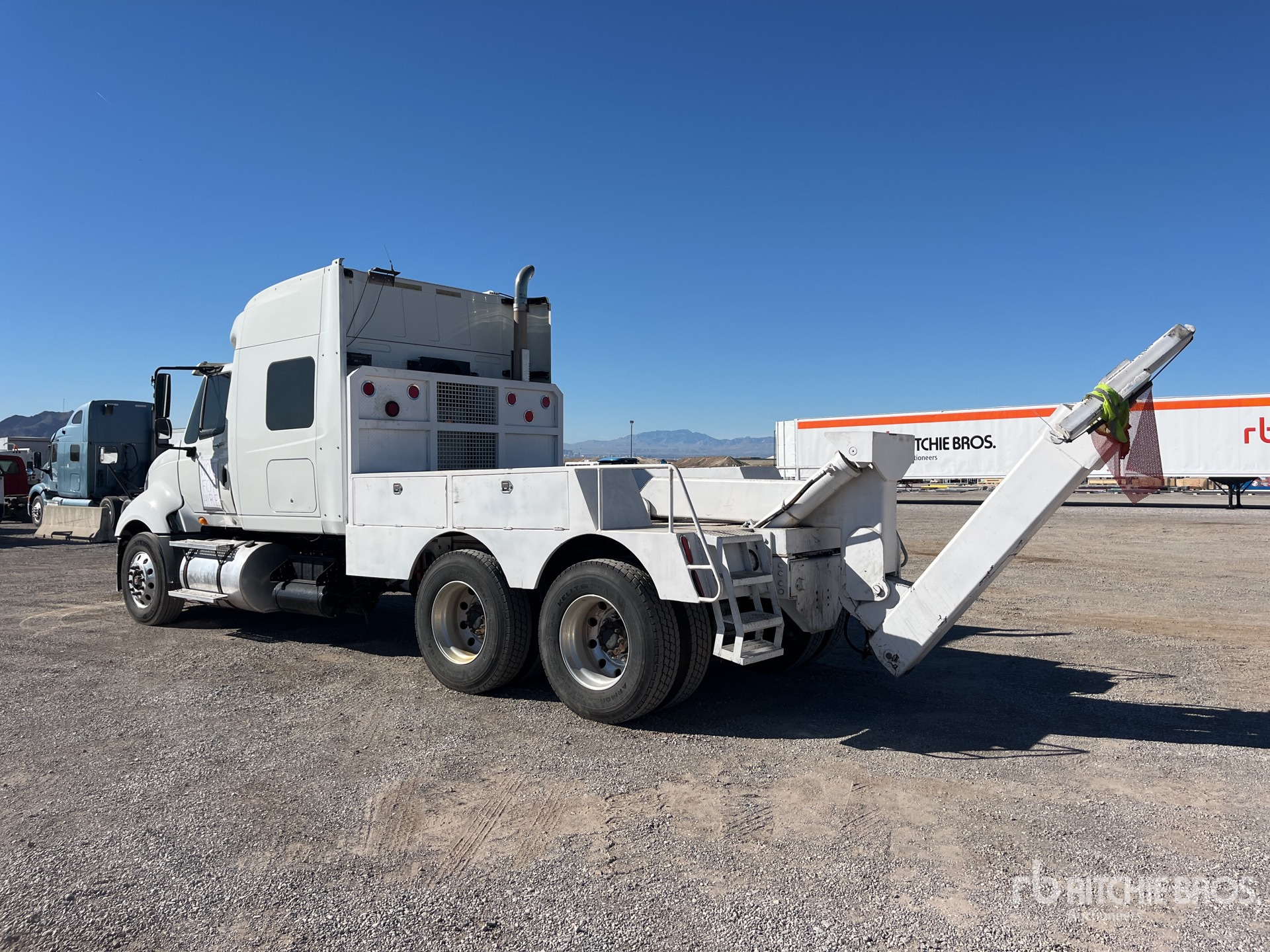 Moteur diesel Cummins ISX 6 cylindres 15,0 L 400 ch, homologué EPA 2009, 15 220 heures de fonctionnement, frein moteur, transmission automatisée, essieu avant 5 600 kg, essieux arrière 18 144 kg, PTAC 23 700 kg, pneus avant 275/80R22.5, pneus arrière 295/75R22.5, suspension pneumatique, empattement de 584 mm, plateau de dépannage en acier