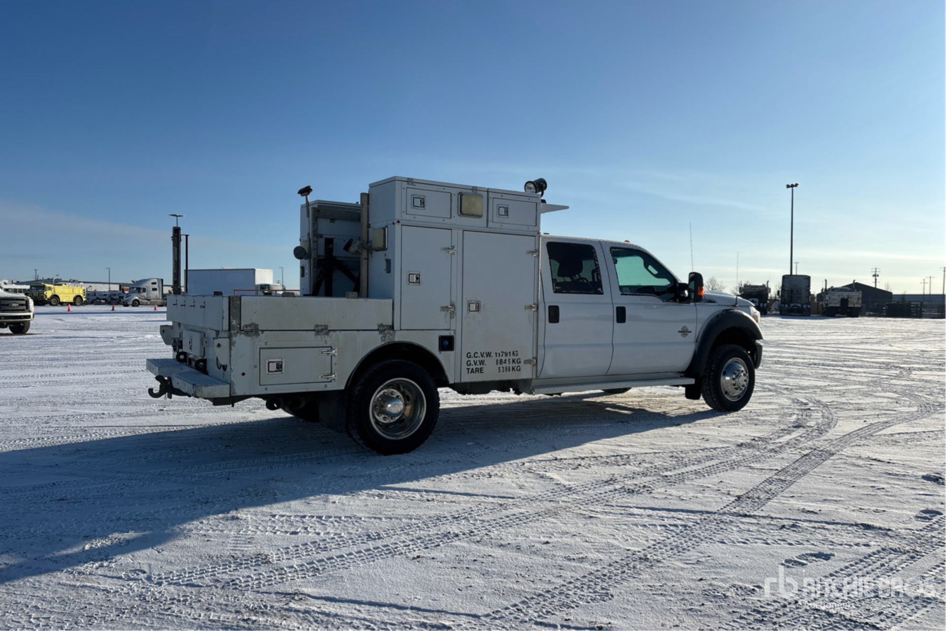 Situé sur la voie 41, emplacement 24, moteur diesel V8 de 6,7 L, homologué EPA 2011, nécessite un fluide d'échappement diesel, système de coupure d'air positif, 10 626 heures moteur, transmission automatique, essieu avant de 3 175 kg, essieux arrière de 6 670 kg, PTAC de 8 845 kg, jantes en aluminium, pneus 225/70R19.5, suspension à ressorts, empattement de 4 470 cm, hauteur de caisse de 2,82 m.