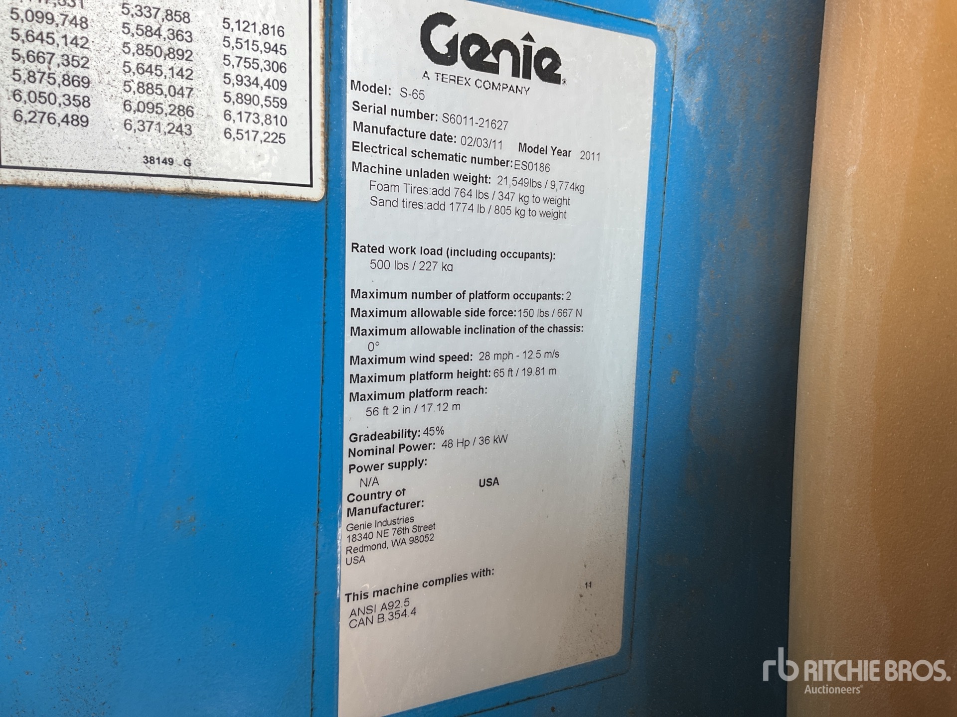 Hauteur maximale de la plateforme : 19,8 m (65 pi), capacité de charge maximale : 227 kg (500 lb), flèche, alimentation électrique de la plateforme, homologation EPA américaine 2010, moteur diesel Deutz à 3 cylindres