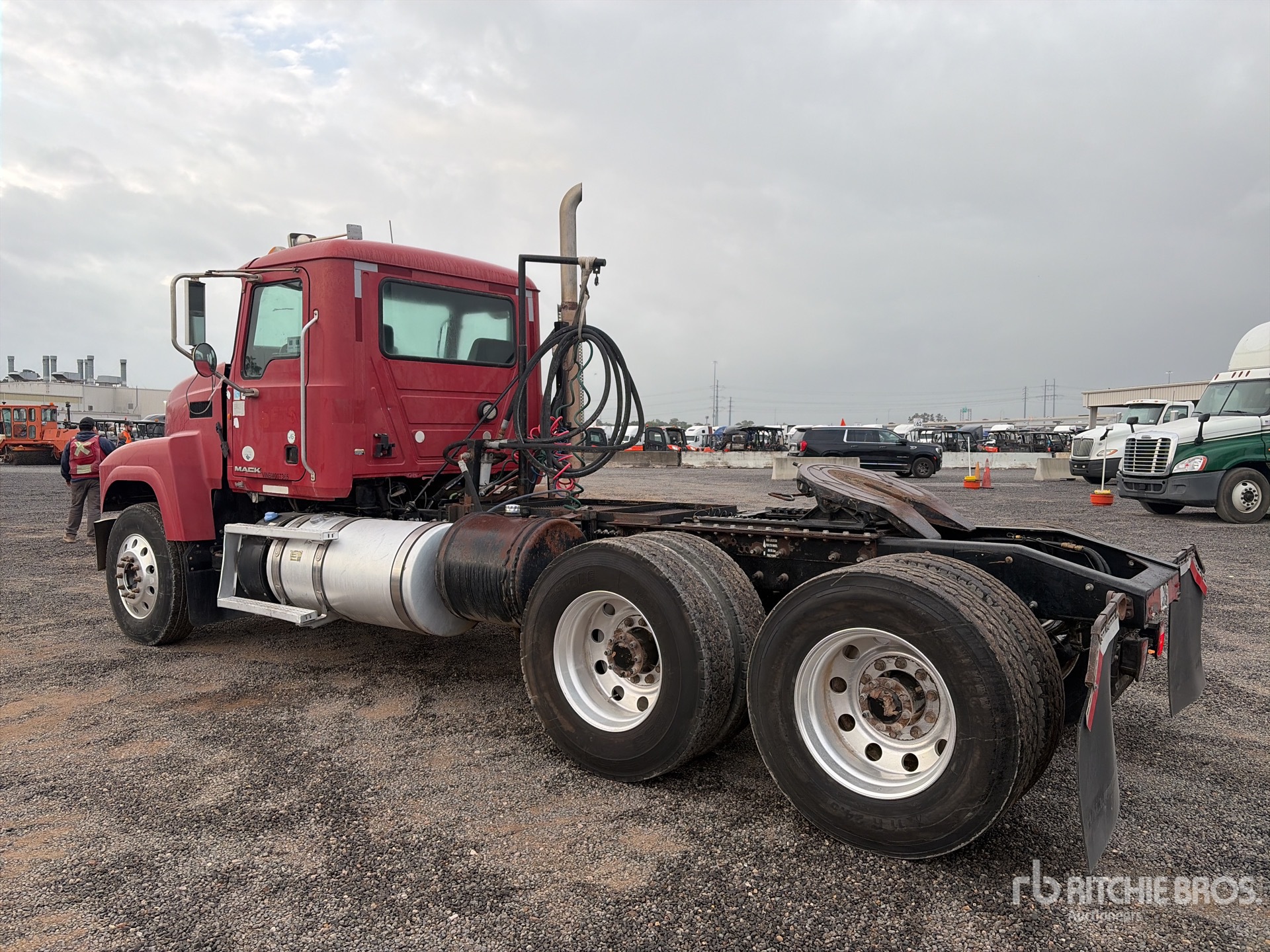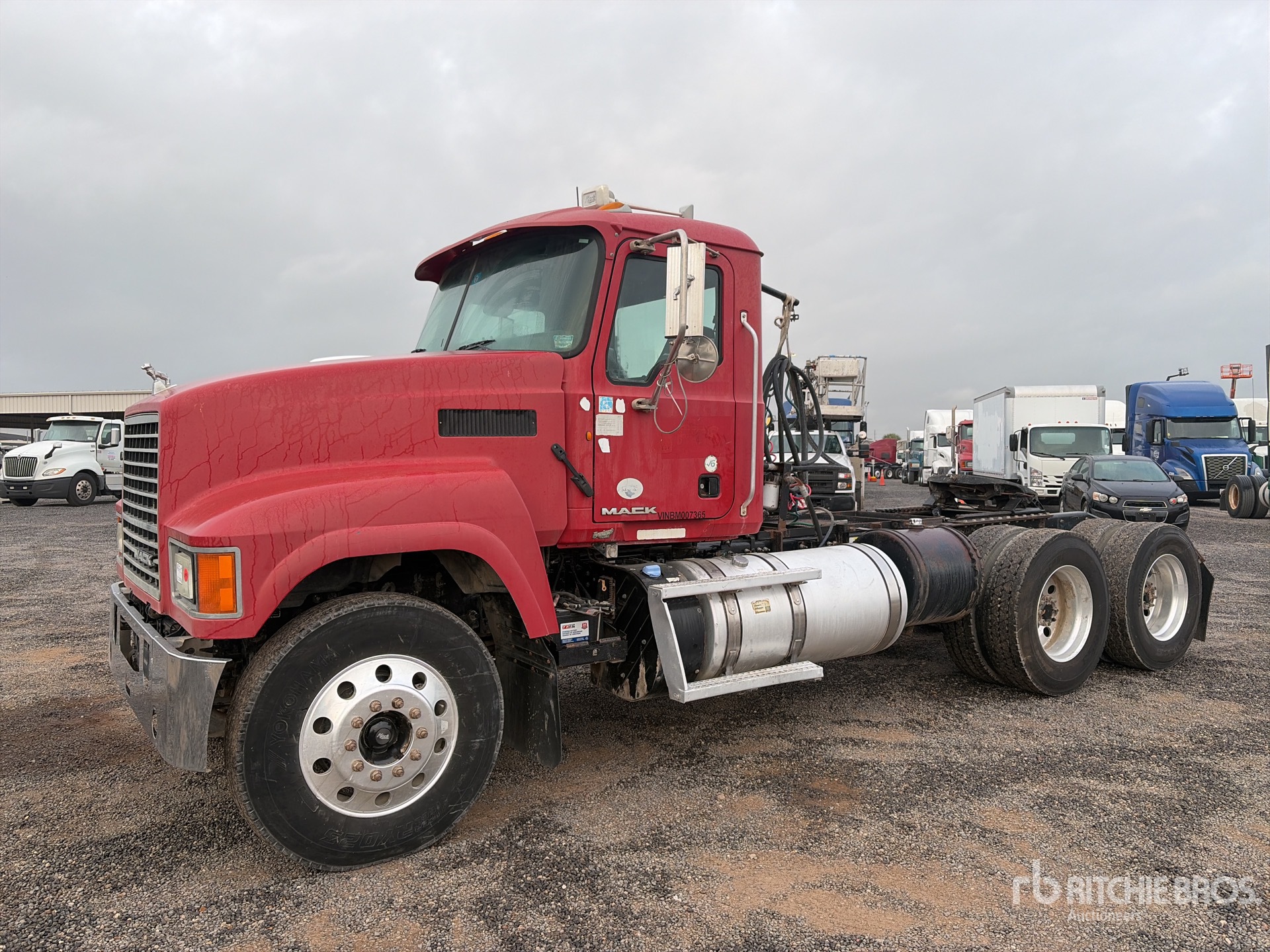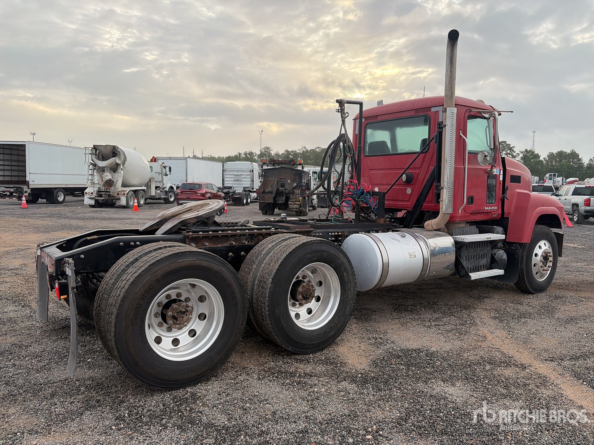 Moteur Mack MP8 de 415 ch, homologué EPA 2010, 8 258 heures de fonctionnement, boîte de vitesses manuelle Eaton Fuller 8LL, essieu avant de 6 500 kg, essieu arrière de 20 000 kg, PTAC de 26 400 kg, frein moteur, empattement de 5,31 m, suspension à balancier, jantes extérieures en aluminium, pneus 11R24.5, système hydraulique, sellette d'attelage coulissante pneumatique, deux réservoirs de carburant.