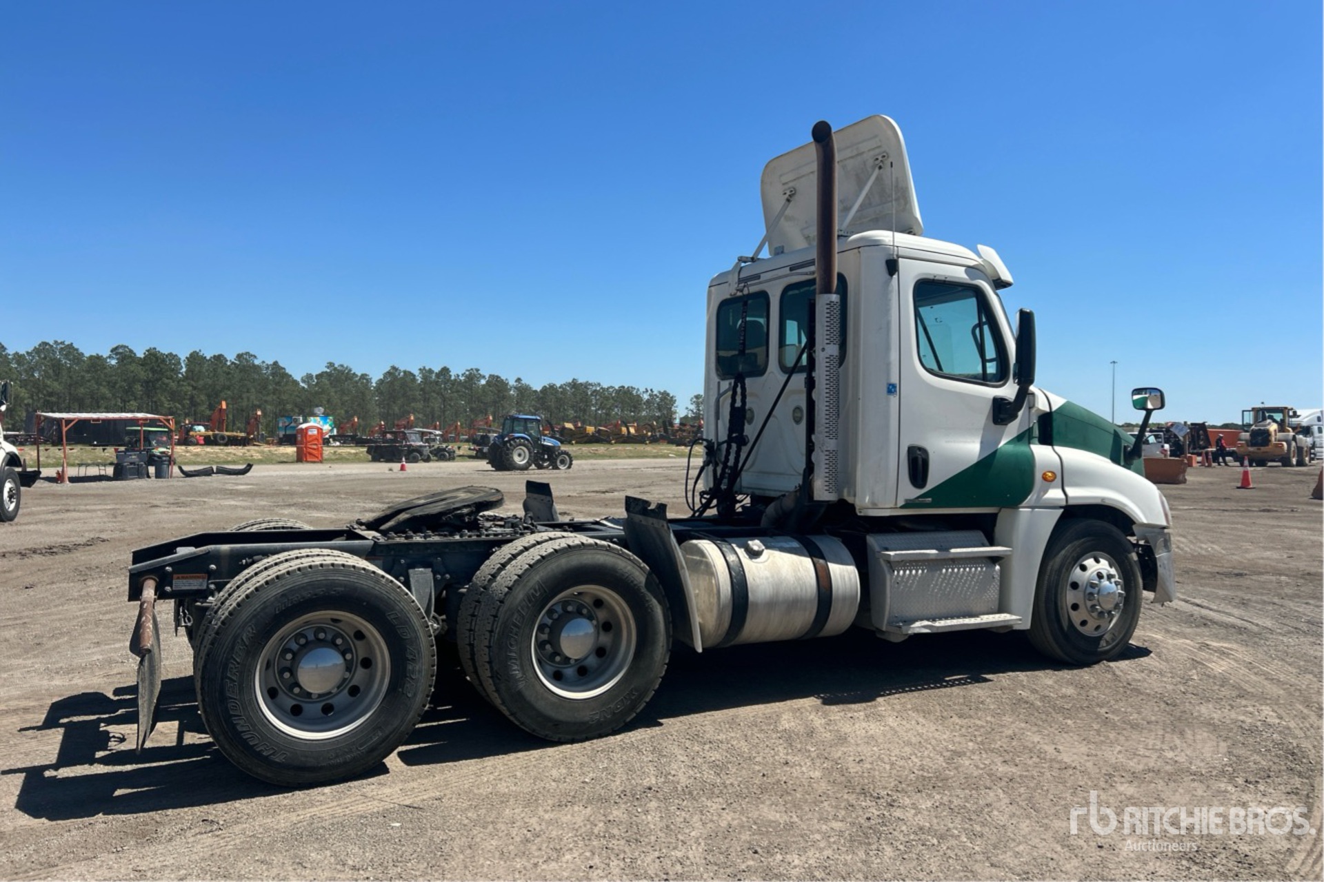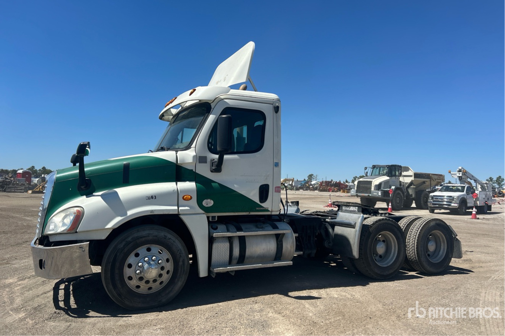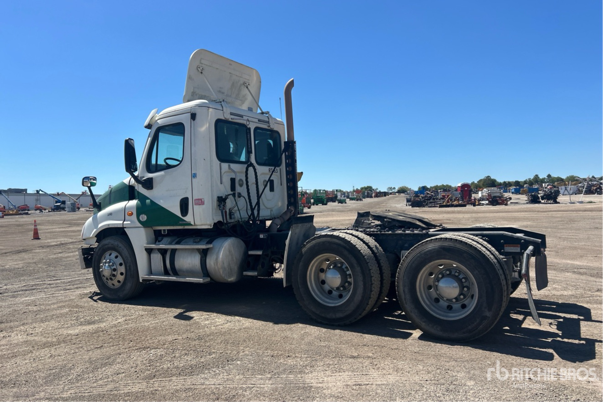Moteur Detroit DD13 de 435 ch, transmission manuelle Eaton Fuller FR-14210B à 10 vitesses, essieu avant de 12 000 lb, essieux arrière de 40 000 lb, PTAC de 52 000 lb, frein moteur, empattement de 176 po, suspension pneumatique, jantes en aluminium, pneus 11R22.5, sellette d'attelage coulissante pneumatique, deux réservoirs de carburant.