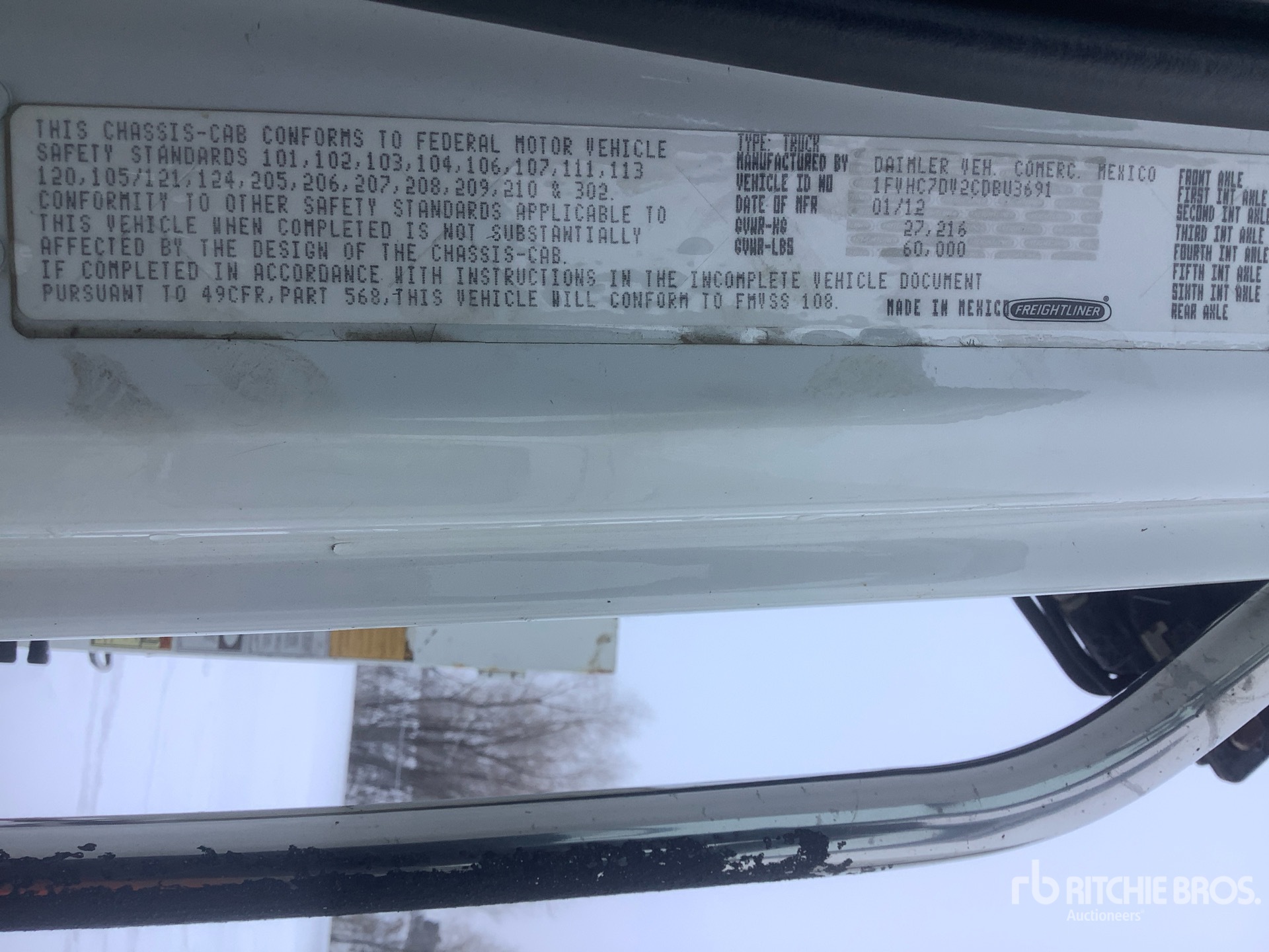 Moteur diesel Detroit DD13 6 cylindres 12,8 cid 410 ch, homologué EPA 2012, nécessite un additif pour réservoirs de diesel, 9 095 heures de fonctionnement, climatisation, régulateur de vitesse, frein moteur, boîte de vitesses manuelle Eaton Fuller RTO-16908LL 8LL, blocage de différentiel, essieu avant 20 000 lb, essieux arrière 40 000 lb, rapport de pont 3,90:1, PTAC 60 000 lb, cabine à suspension pneumatique, roues avant en aluminium, pneus avant 425/65R22.5, pneus arrière 11R22.5, double direction, châssis renforcé, suspension pneumatique, empattement 207 po, prise de force, caisse de 14 pi 6 po, stabilisateurs hydrauliques, grue hydraulique IMT 17/117SLK4 11 465 lb à 6 sections, télécommande sans fil
