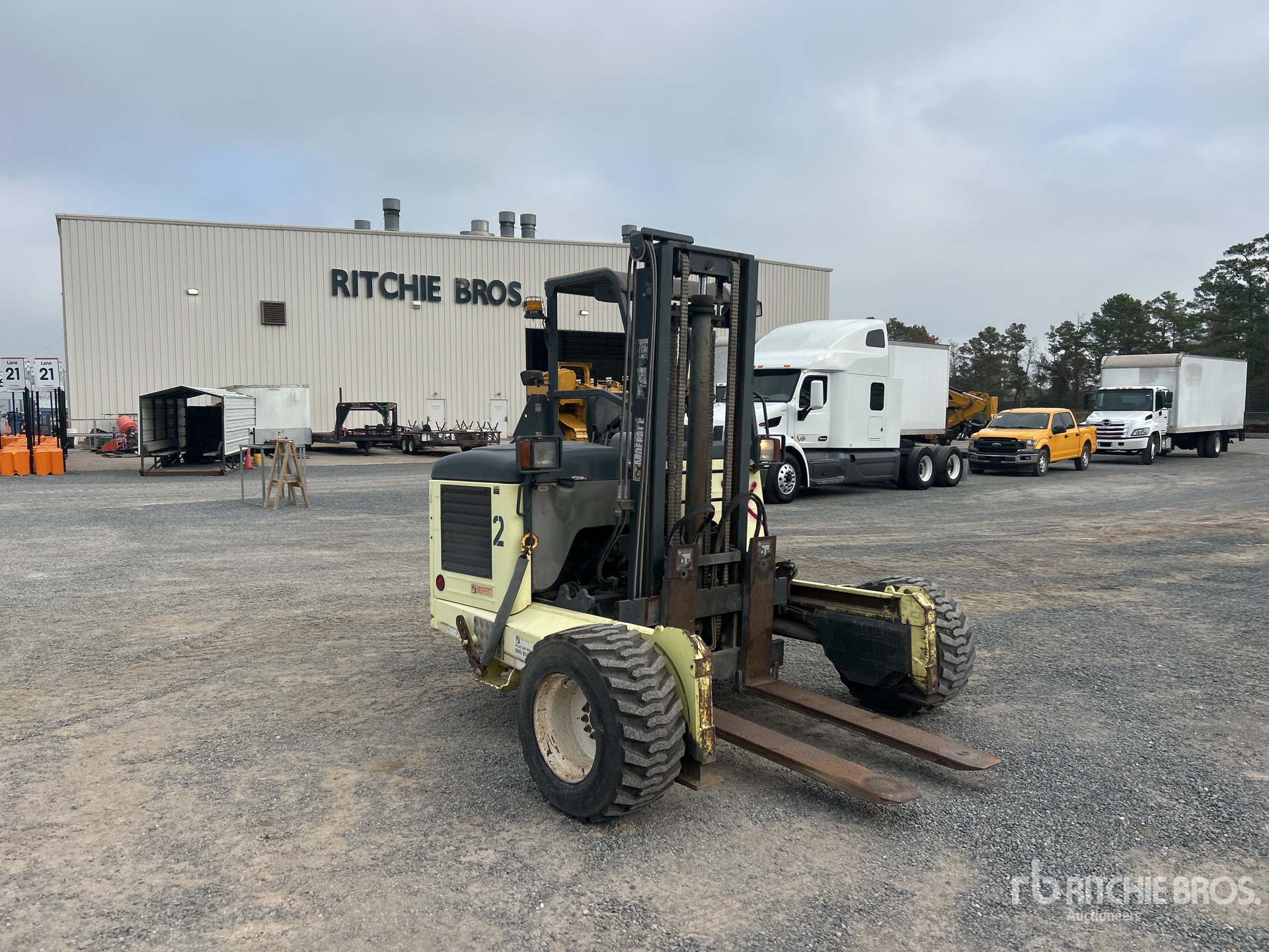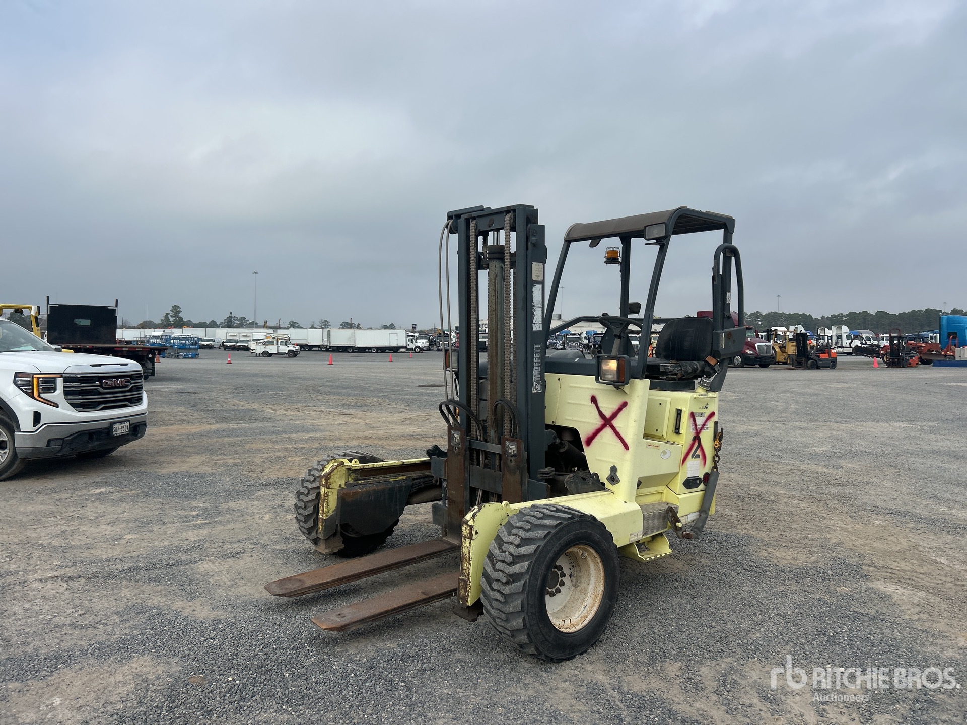 Mât à deux étages, mât de hauteur abaissé de 97 pouces, fourches de 54 pouces, déport latéral, moteur diesel