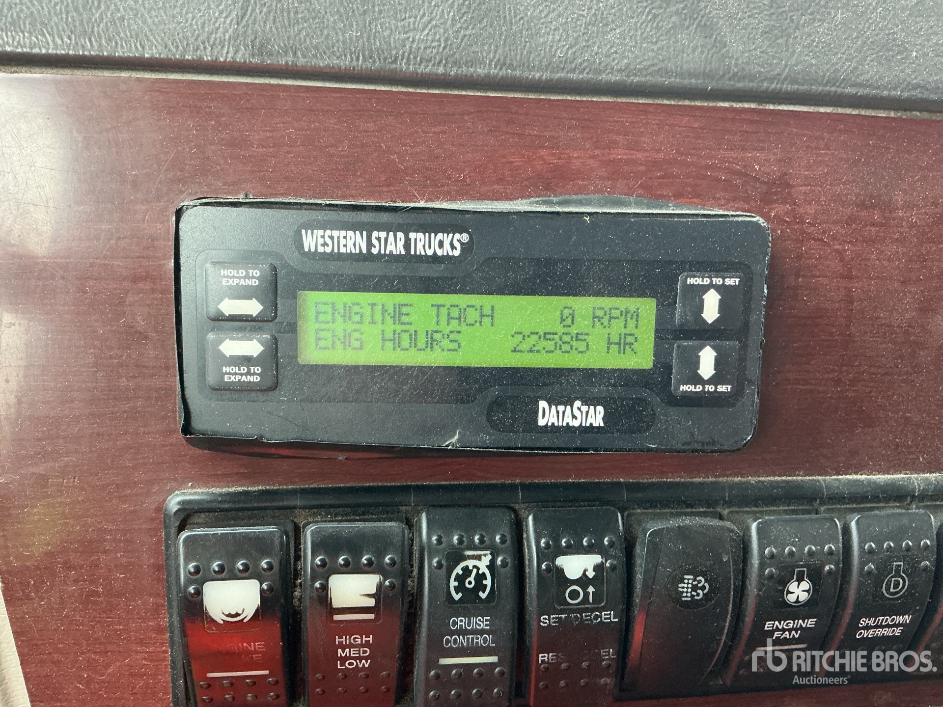 22 585 heures moteur, transmission manuelle Eaton Fuller à 18 vitesses, cabine couchette à toit plat de 137 cm, chauffage de couchette, roues extérieures en aluminium, pneus avant 425/65R22.5, pneus arrière 275/80R22.5, double direction, châssis renforcé, sellette d'attelage coulissante pneumatique, porte-bagages de toit