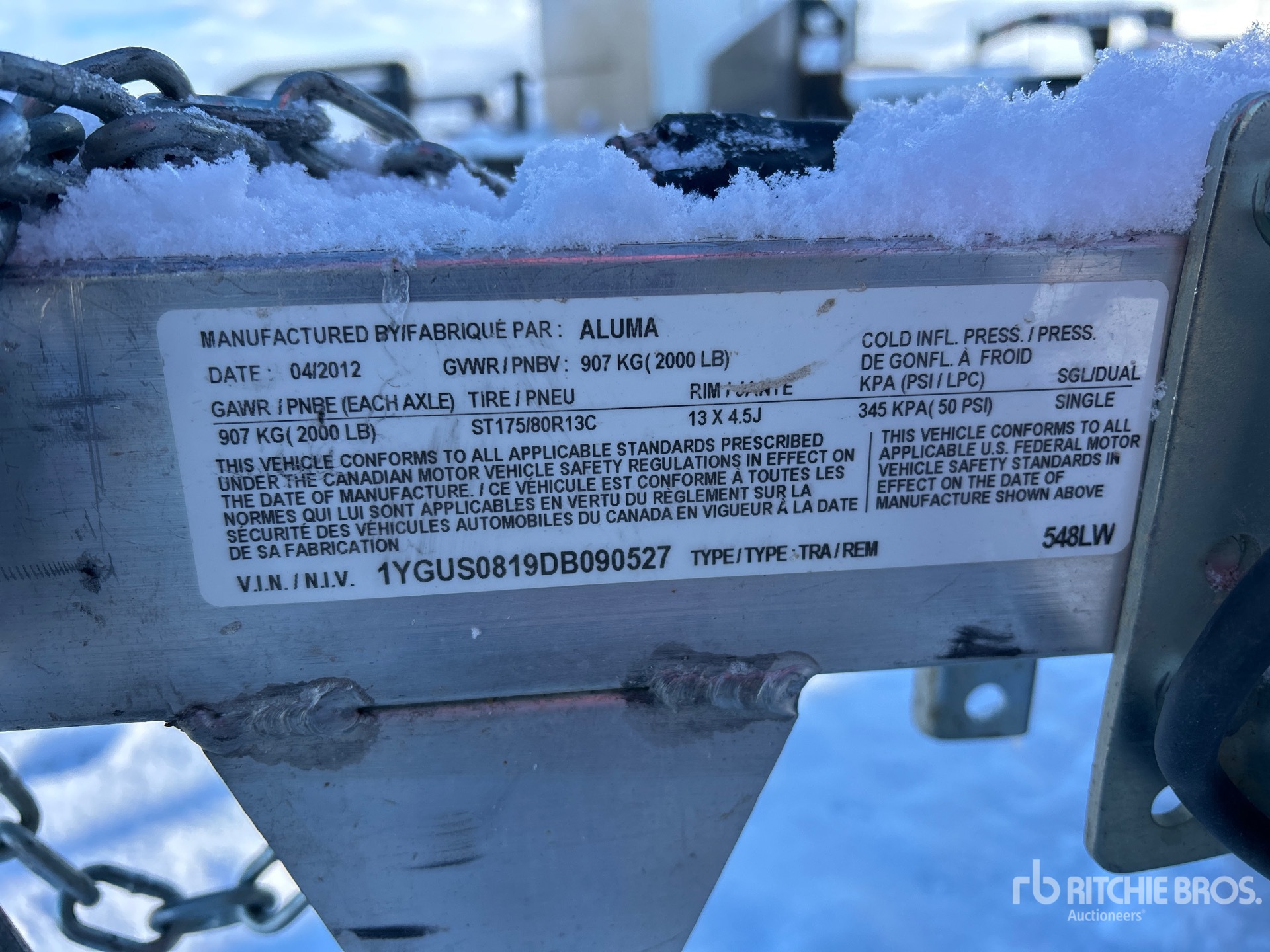 Cadre en aluminium, attelage à boule, essieu de torsion, freins électriques, largeur de plateau de 130 cm, largeur hors tout de 142 cm, plancher en aluminium, pneus 175/80R13, PTAC de 907 kg