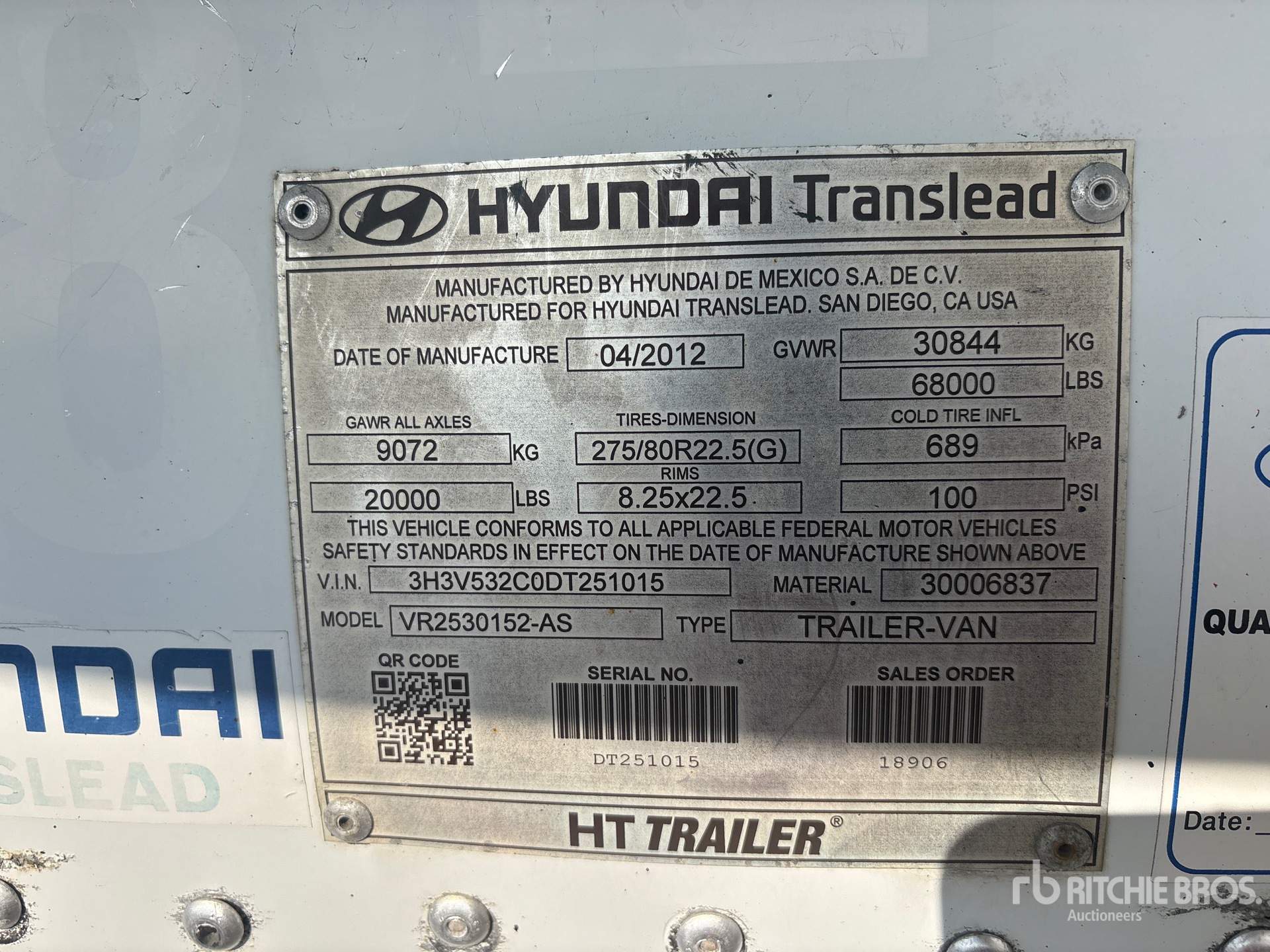 Les Informations détaillées de l’équipement sont d’une portée limitée, et les Encans Ritchie Bros. n’ont inspecté aucun autre aspect ou composant de l’équipement que ceux présentés expressément. Sauf indication précise, nous n’offrons aucune représentation ou garantie, officielle ou implicite, sur l’équipement ou ses composants, sans aucune limite de représentation ou de garantie en ce qui concerne la fonctionnalité, la conformité à toute norme de sécurité ou l’exigence de toute autorité ou agence de régulation en vigueur, l’adaptation à un quelconque usage, ou la valeur commerciale. Il vous est fortement conseillé d’effectuer votre propre inspection détaillée de l’équipement avant d’enchérir.