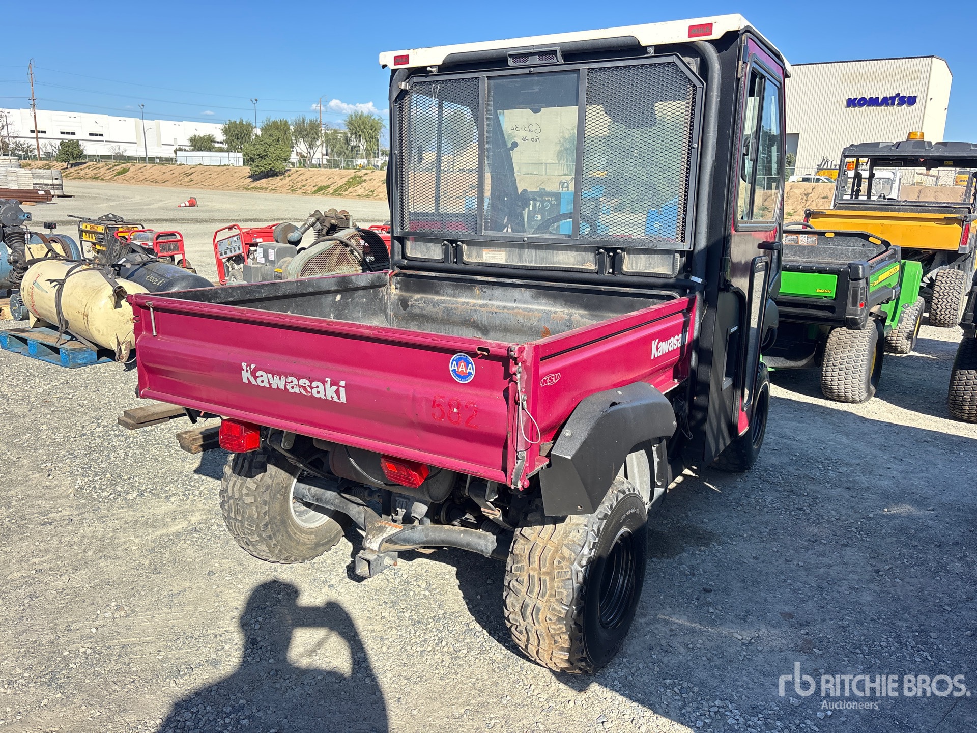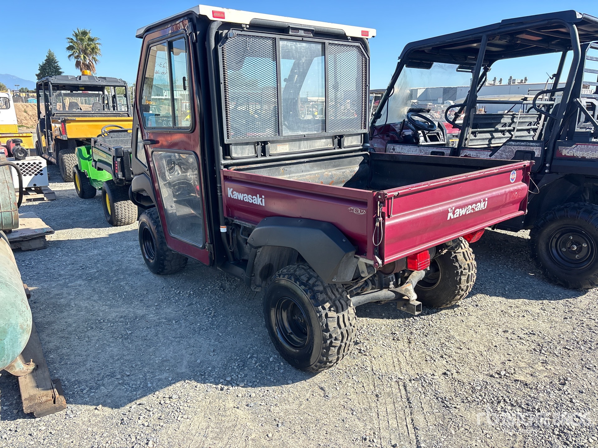 Cabine fermée, 2 places, pare-brise, pare-buffle, attelage, benne basculante manuelle, homologation EPA américaine 2015, moteur à essence Kawasaki 2 cylindres