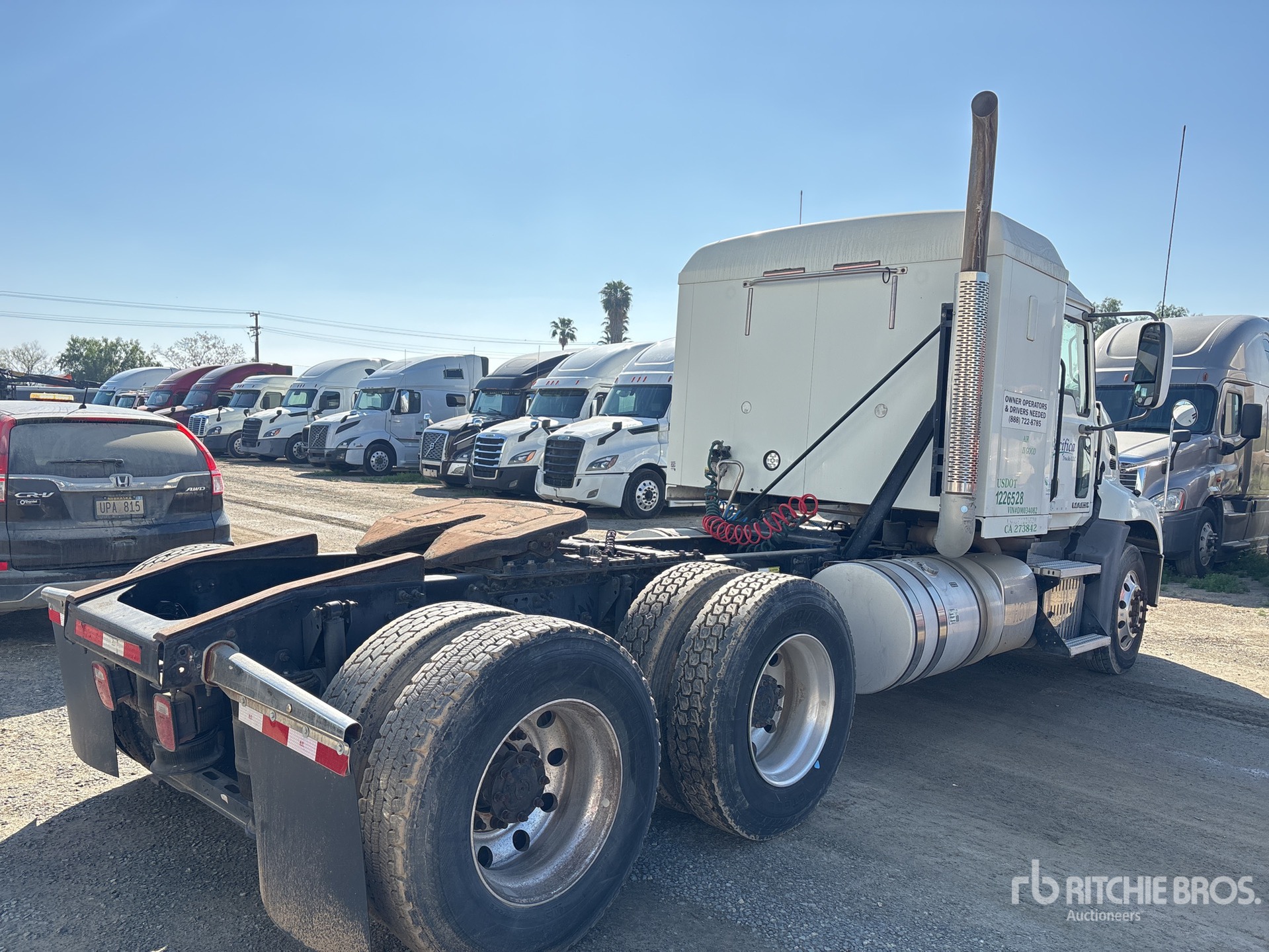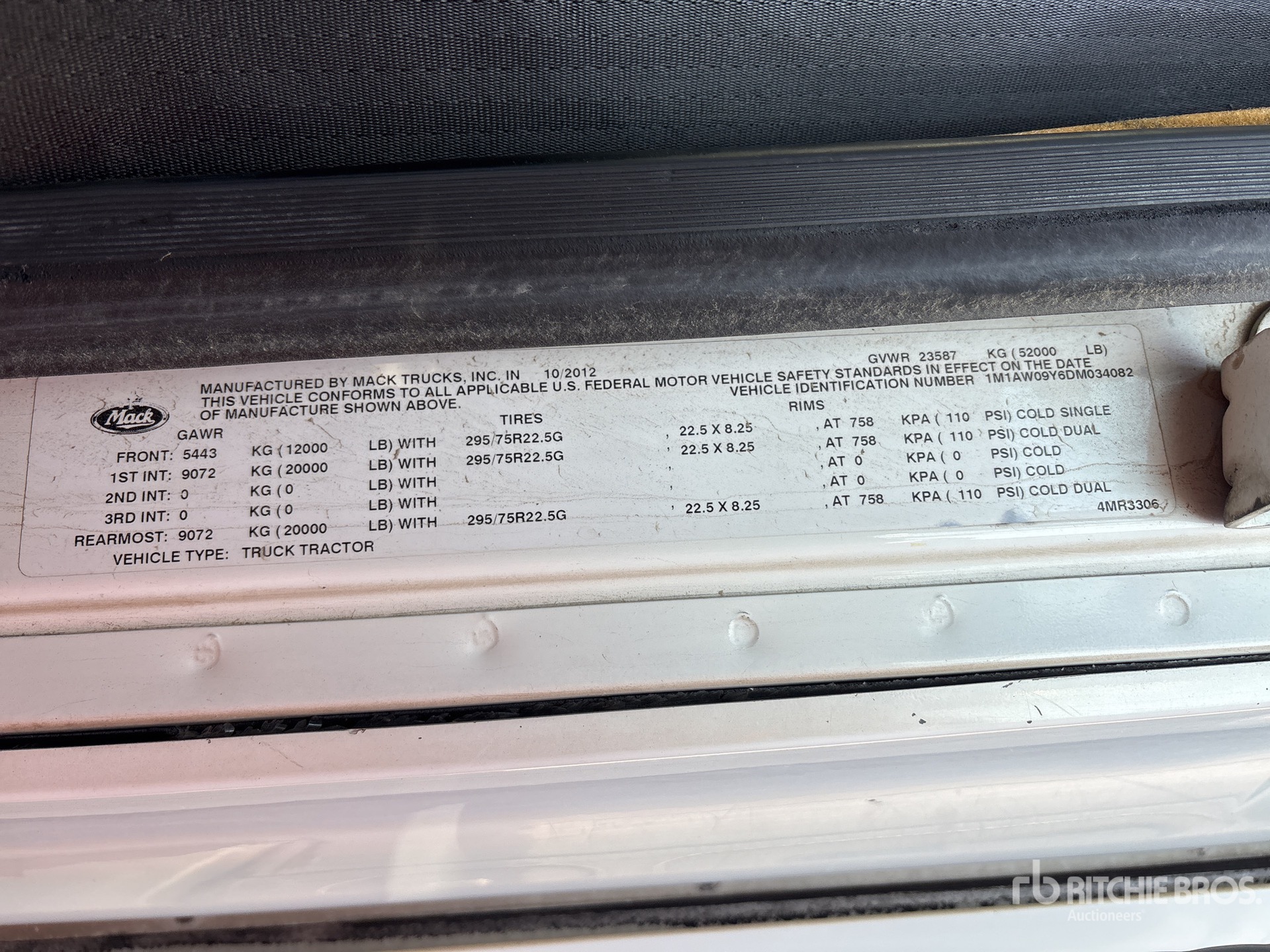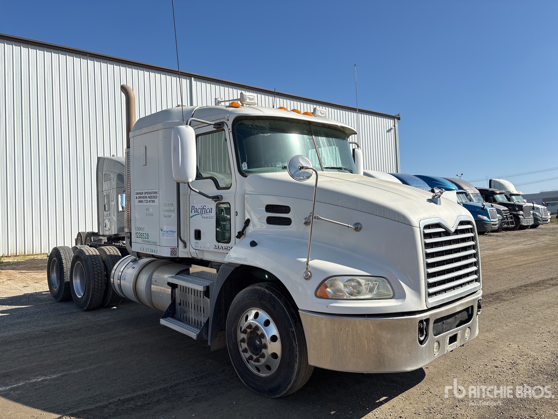 Moteur Mack MP8 de 415 ch, homologué EPA 2012, 17 704 heures moteur, transmission manuelle, essieu avant de 5 443 kg, essieux arrière de 18 144 kg, PTAC de 23 591 kg, frein moteur, cabine couchette à toit plat de 122 cm, empattement de 516 cm, suspension pneumatique, jantes en aluminium, pneus 295/75R22.5, sellette d'attelage coulissante pneumatique, deux réservoirs de carburant, rampes surbaissées