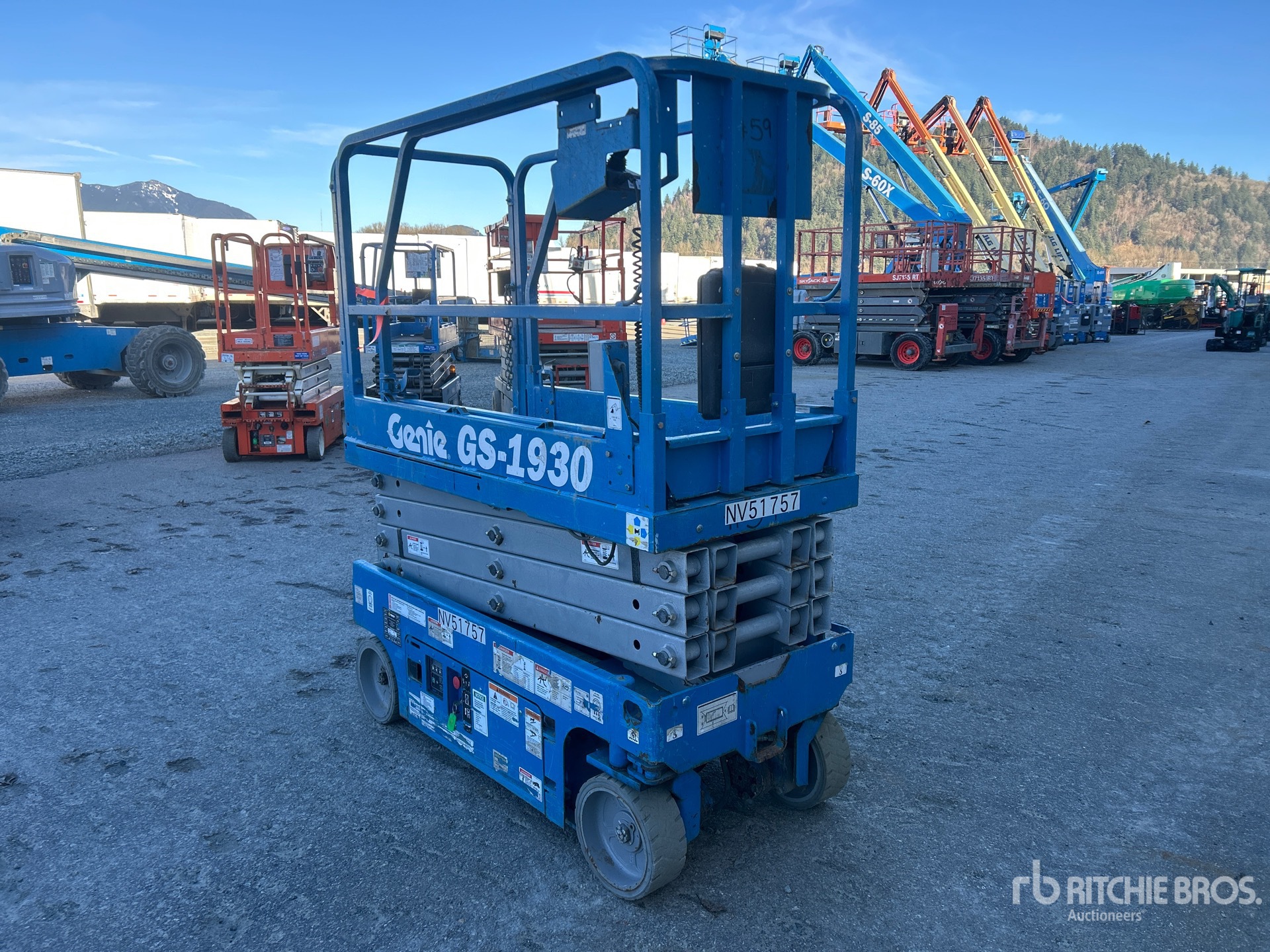 Hauteur maximale de la plateforme : 19 pi, capacité de charge maximale : 500 lb, rallonge de la plateforme, alimentation électrique, pneus pleins non marquants, boîtier de commande supérieur