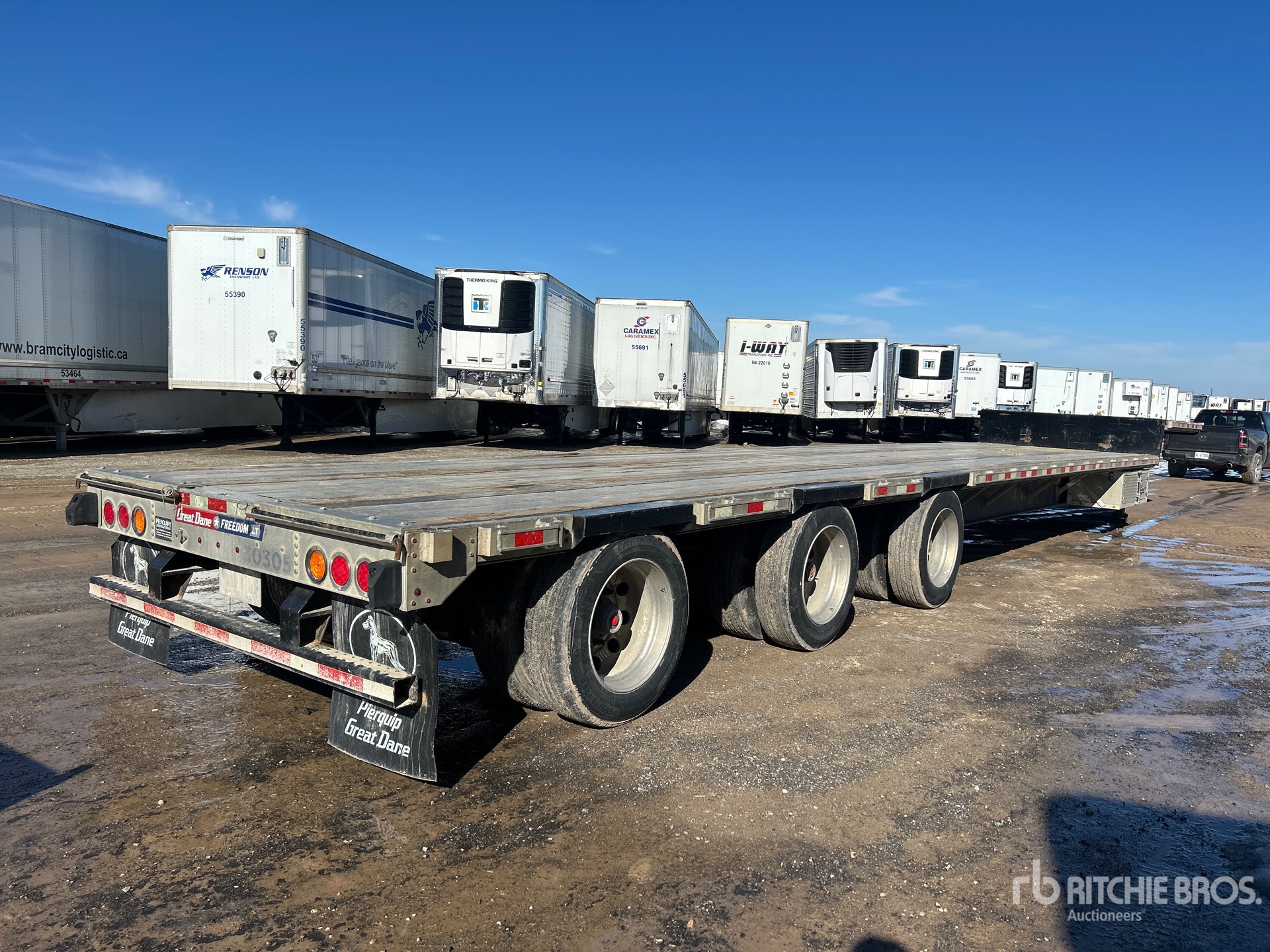 Suspension pneumatique, plateau supérieur de 3,35 m, plateau principal de 12,80 m, largeur utile du plateau de 2,46 m, largeur totale du plateau de 2,59 m, plateau au-dessus des pneus, plancher en aluminium avec lattes de bois, jantes en aluminium, pneus 275/70R22.5, PTAC de 43 090 kg