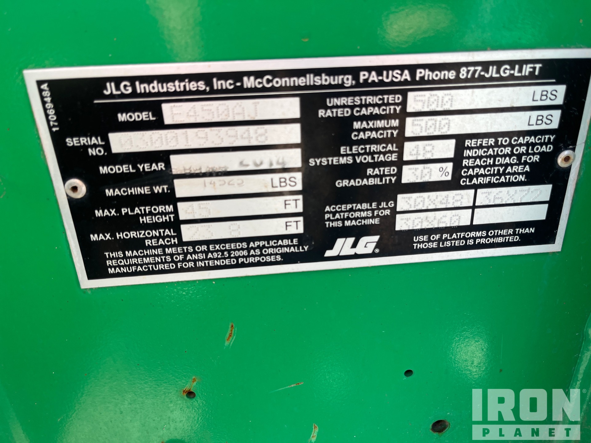 Hauteur maximale de la plateforme : 12 m (40 pi), capacité de charge maximale : 227 kg (500 lb), flèche, alimentation électrique de la plateforme, pneus 240/55D 17,5 remplis de mousse