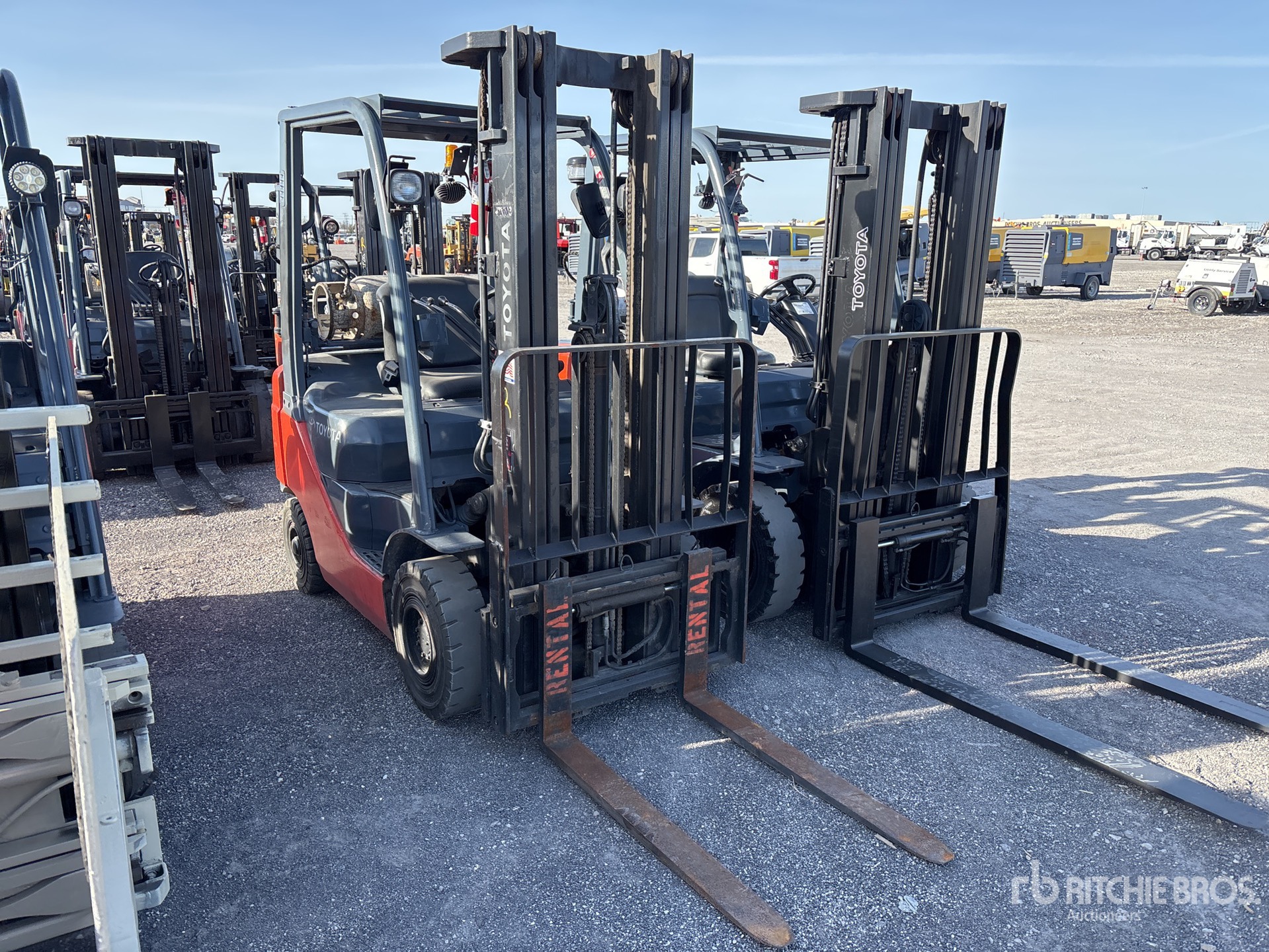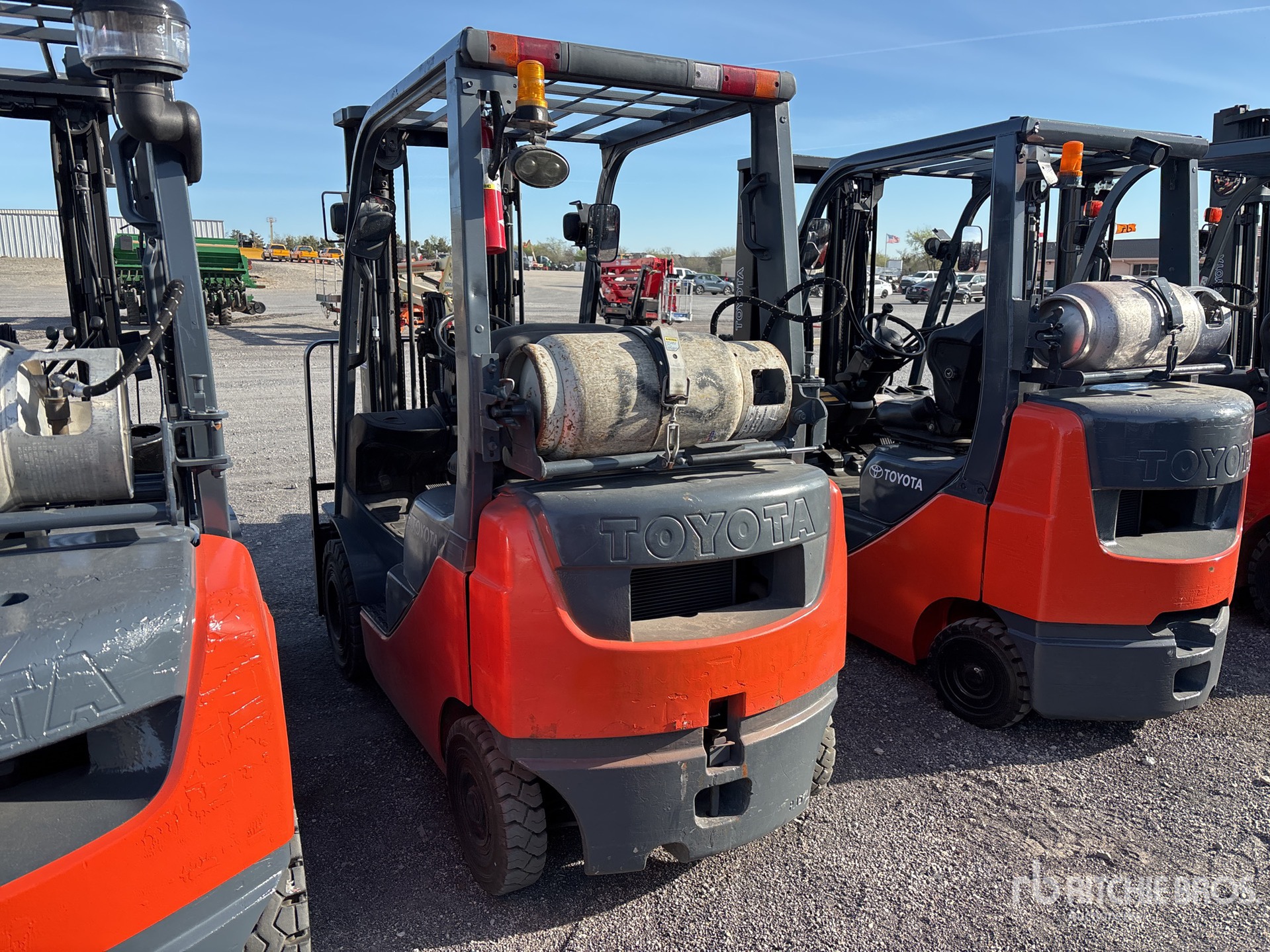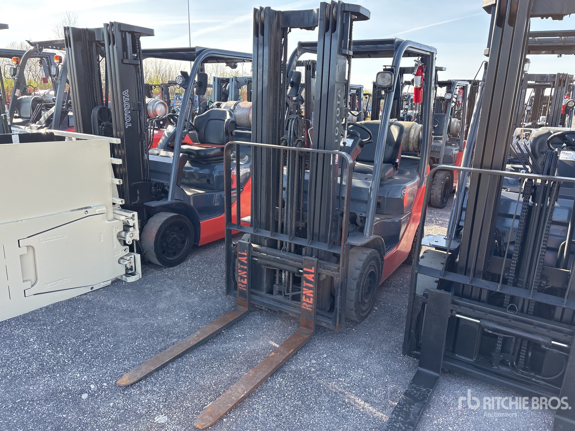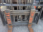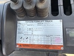 Mât à 3 sections, hauteur de levage maximale de 4,80 m, hauteur de mât abaissée de 2,13 m, fourches de 1,07 m, déport latéral, pneus pleins, homologation EPA américaine 2014, moteur Toyota 4 cylindres 2,2 L GPL