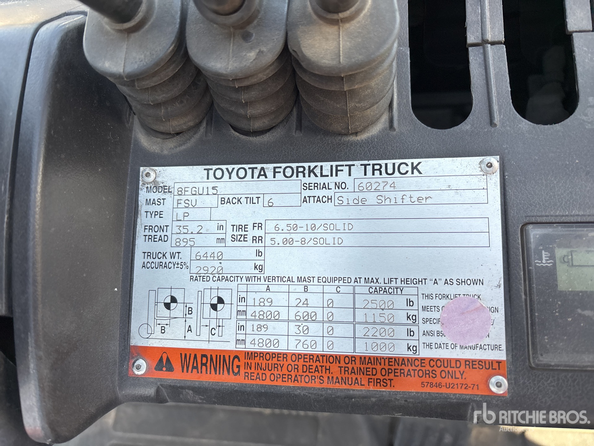 Les Informations détaillées de l’équipement sont d’une portée limitée, et les Encans Ritchie Bros. n’ont inspecté aucun autre aspect ou composant de l’équipement que ceux présentés expressément. Sauf indication précise, nous n’offrons aucune représentation ou garantie, officielle ou implicite, sur l’équipement ou ses composants, sans aucune limite de représentation ou de garantie en ce qui concerne la fonctionnalité, la conformité à toute norme de sécurité ou l’exigence de toute autorité ou agence de régulation en vigueur, l’adaptation à un quelconque usage, ou la valeur commerciale. Il vous est fortement conseillé d’effectuer votre propre inspection détaillée de l’équipement avant d’enchérir.
